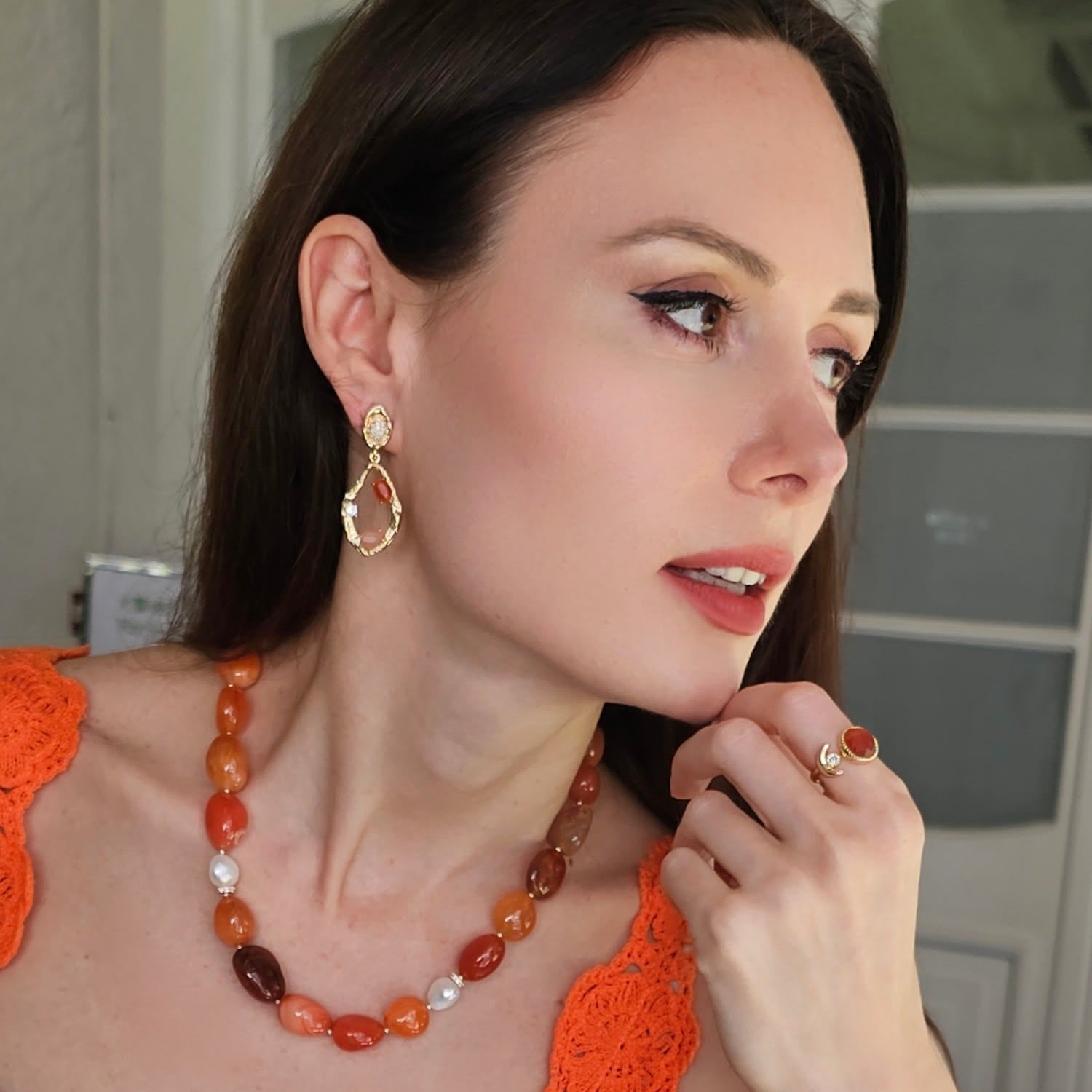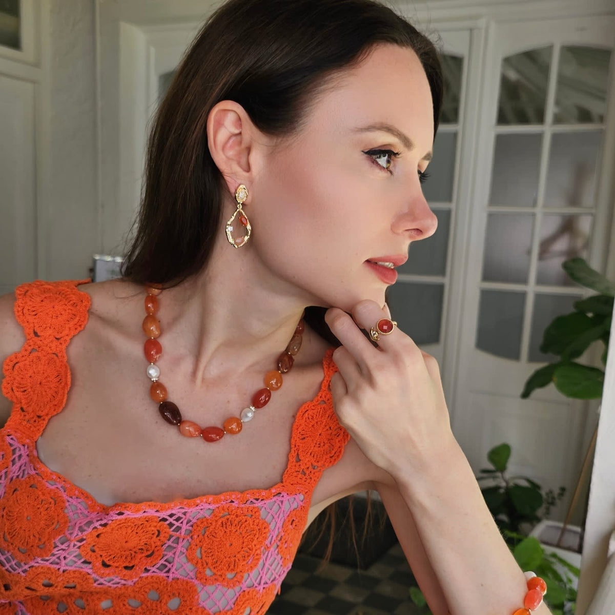 The Nugget Red Agate With Freshwater Pearls Choker by Farra is a striking statement piece. The bold red agate, a stone believed to promote confidence and courage, is beautifully contrasted with smooth freshwater pearls. This necklace is not only a stylish accessory but also a source of positive energy, perfect for both casual and formal occasions.