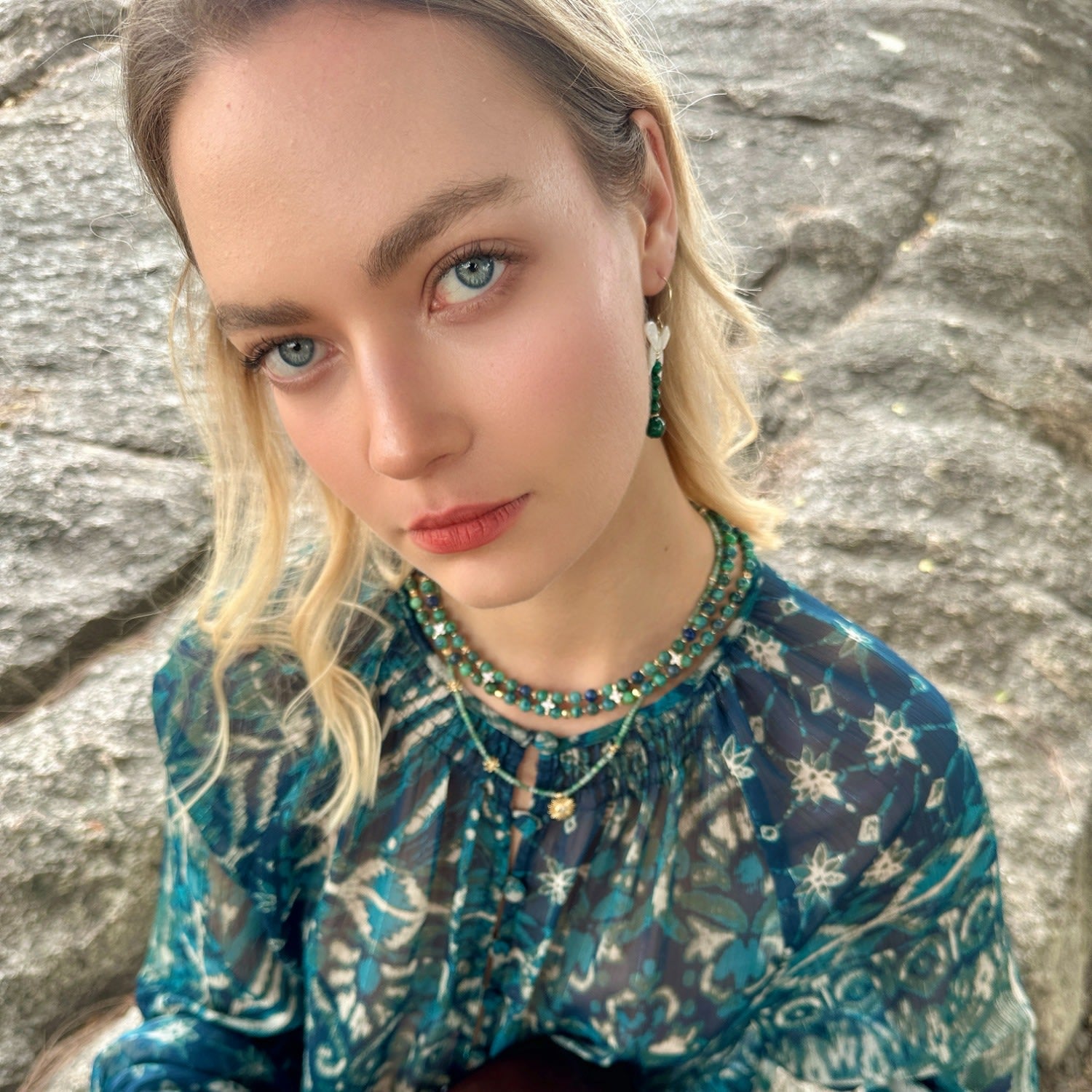This necklace features natural phoenix lapis and zircon stones and is made with 14-karat gold-plated brass.