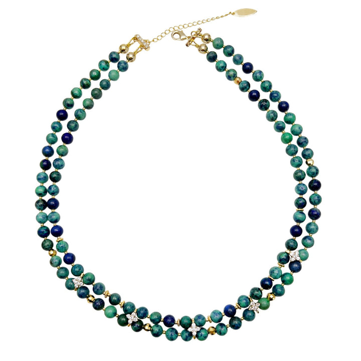The Phoenix Lapis With Zircon Stone Double Layers Collar Necklace by Farra is a luxurious and elegant piece. The double-layered collar design adds dimension and visual interest, making it perfect for both formal occasions and stylish everyday wear. The combination of natural phoenix lapis and zircon stones exudes glamour.