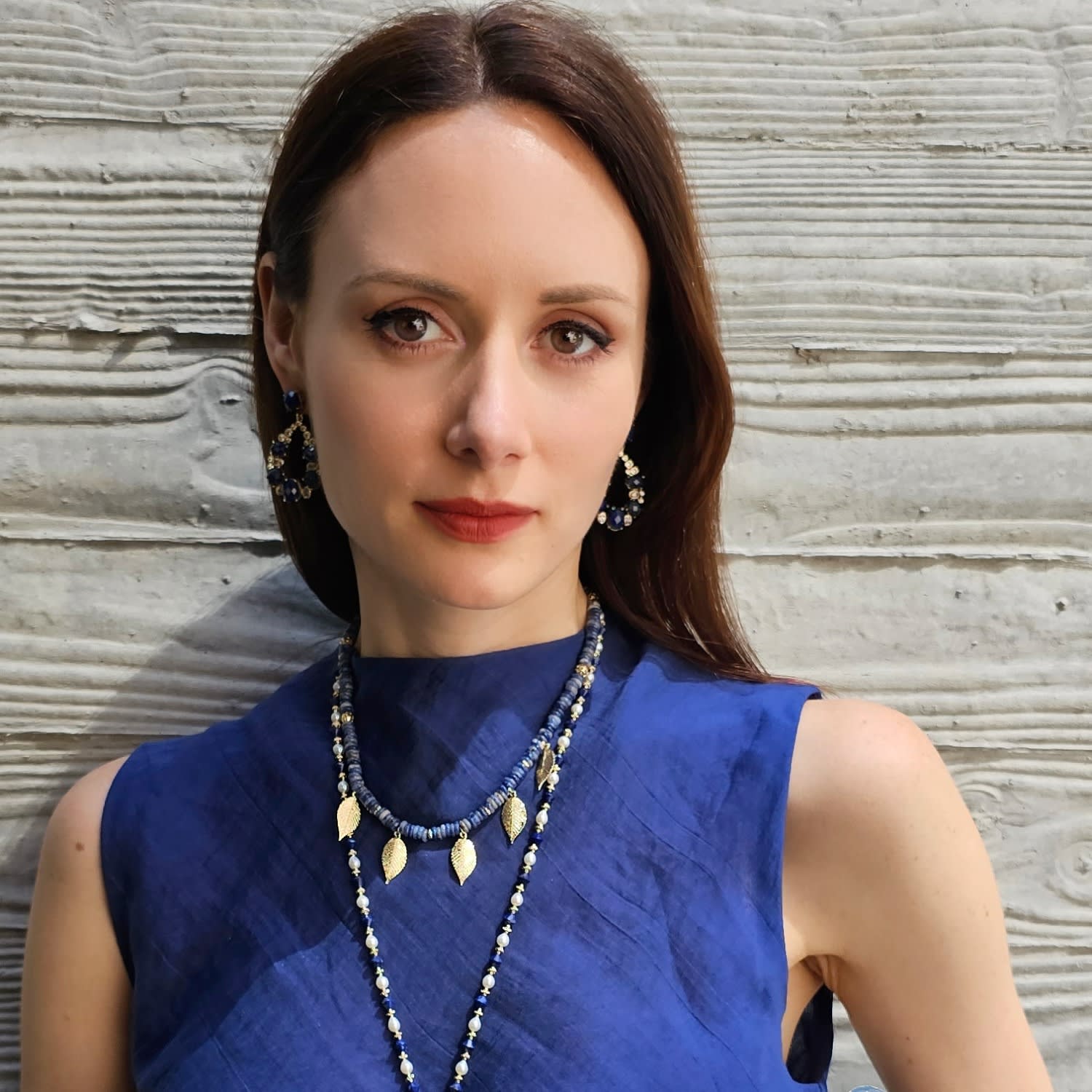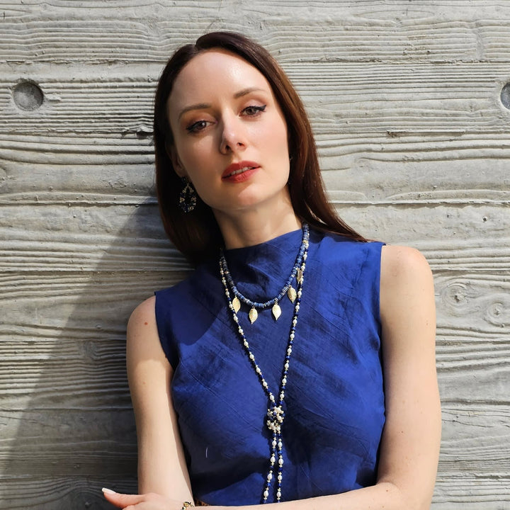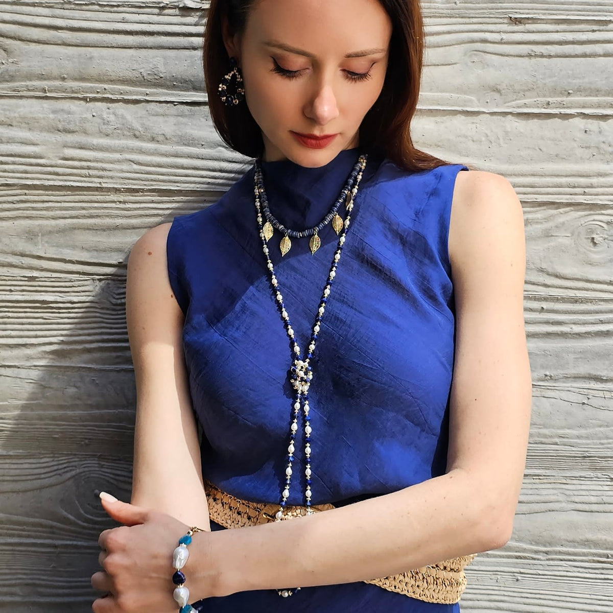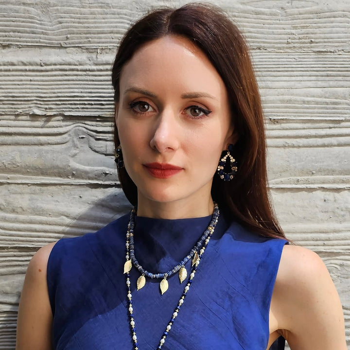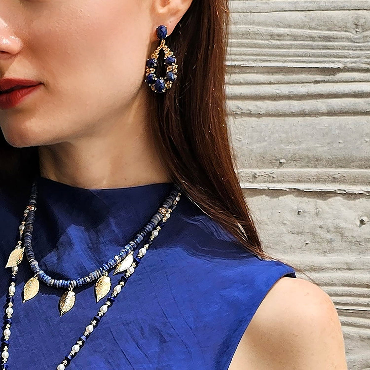 This Bohemian Style Sodalite With Leaves Charms Statement Necklace by Farra is a striking piece with a nature-inspired touch. Vibrant sodalite beads with deep blue hues are beautifully complemented by golden leaf charms, creating a captivating contrast. It’s perfect for adding a bohemian flair to your summer wardrobe.
