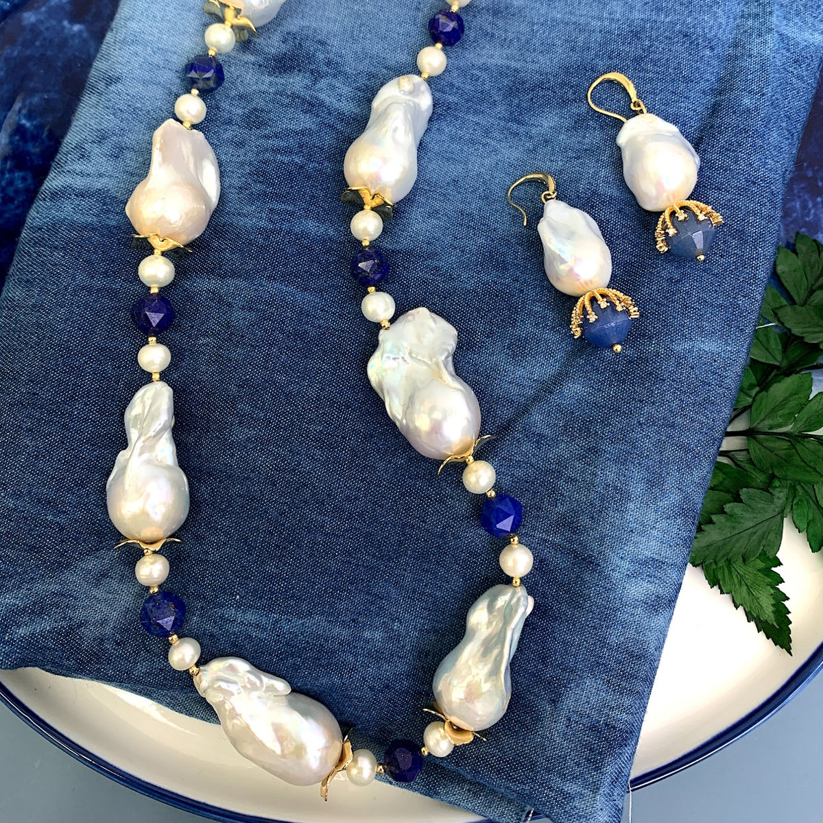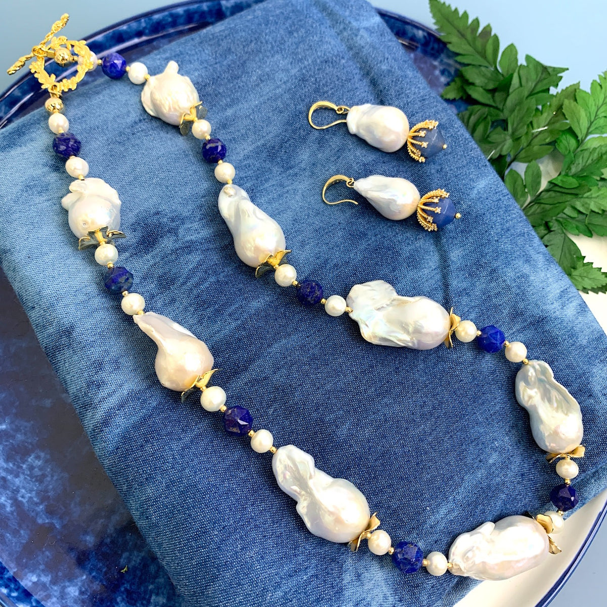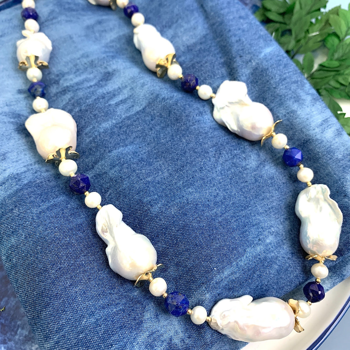 This necklace is made of baroque pearls and lapis with Japan golden-plated brass findings.