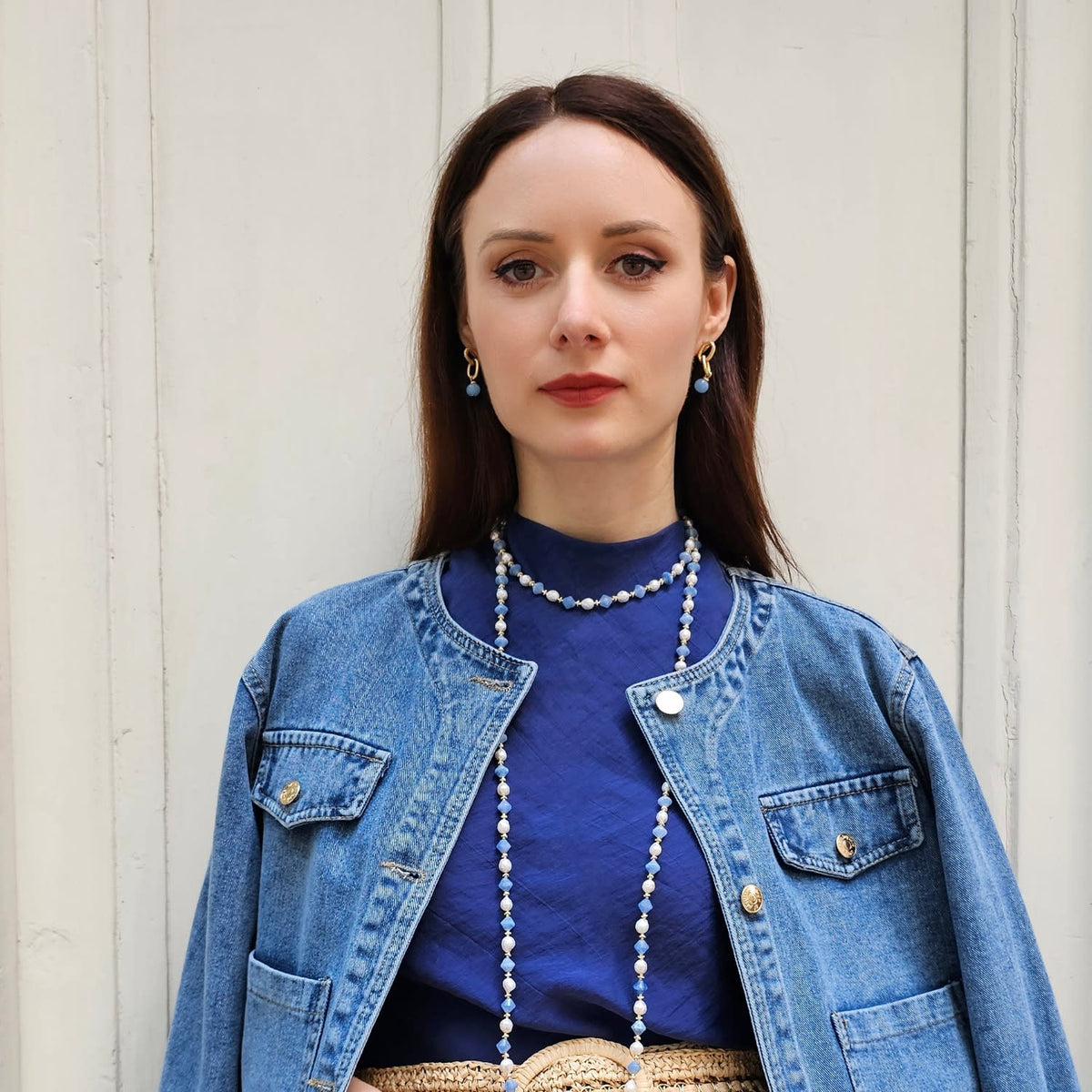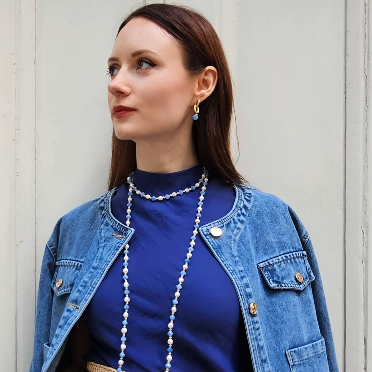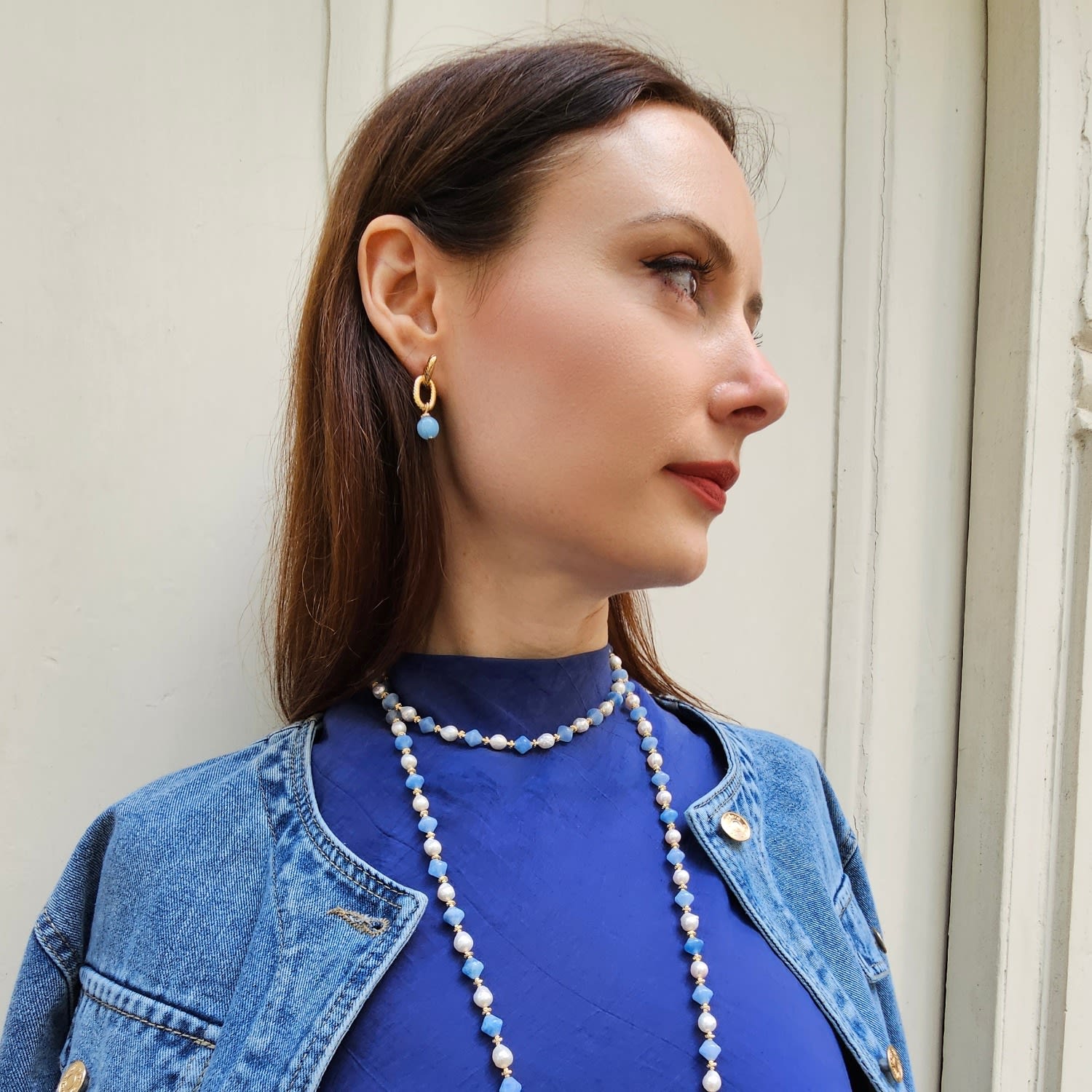 This choker necklace is made with freshwater pearls and blue jade beads.