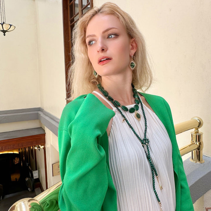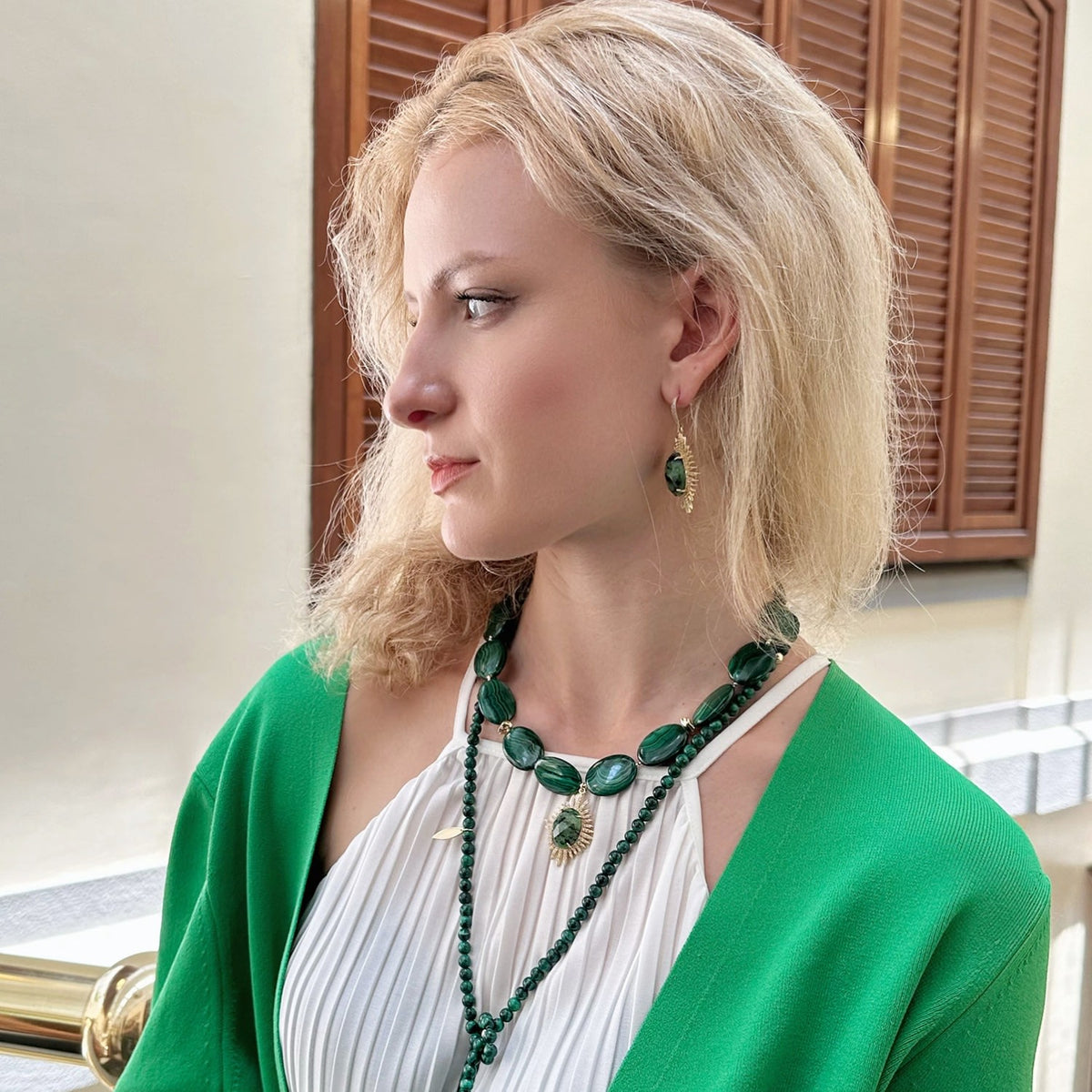 This Oval Malachite With Gemstone Pendant Chunky Necklace by Farra is a statement piece that blends modern style with the timeless beauty of natural gemstones. The bold, oval malachite pendant is a striking centerpiece, designed to add a touch of sophistication and color to any look. Malachite is believed to have protective properties, making this necklace not only a beautiful accessory but also a symbol of strength and emotional well-being. Its versatility allows it to be worn alone for a clean, elegant look or layered for a more personalized style.