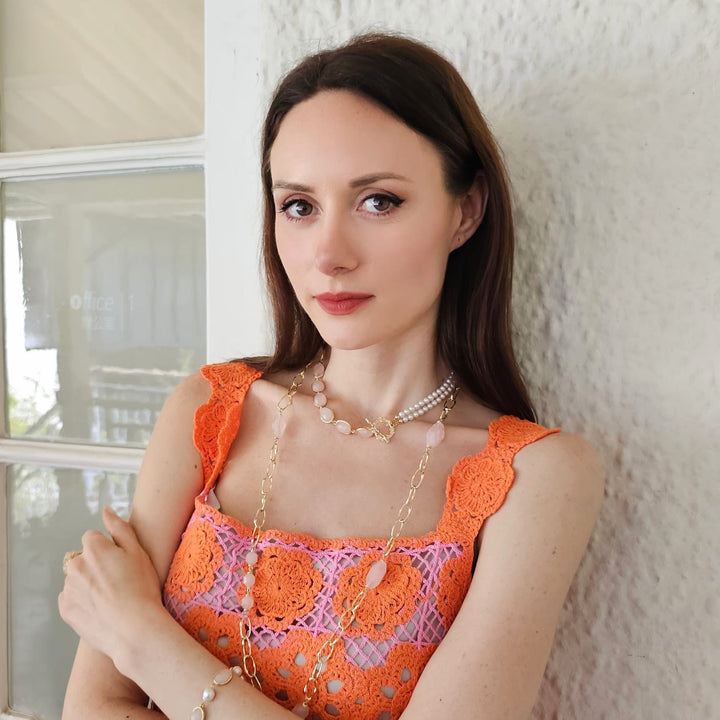 This Rose Quartz With Freshwater Pearls Bracelet by Farra is an exquisite piece that embodies love and purity. The soft pink hues of the rose quartz stones, known for their calming properties, are beautifully complemented by the delicate luster of freshwater pearls. This bracelet is not just an accessory, but a thoughtful symbol of compassion, healing, and sincerity. Its sophisticated and gentle design makes it a perfect gift to express love and appreciation for someone special.