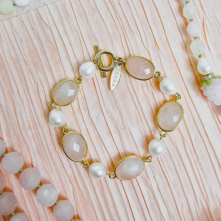 This bracelet features soft pink rose quartz stones and lustrous freshwater pearls.