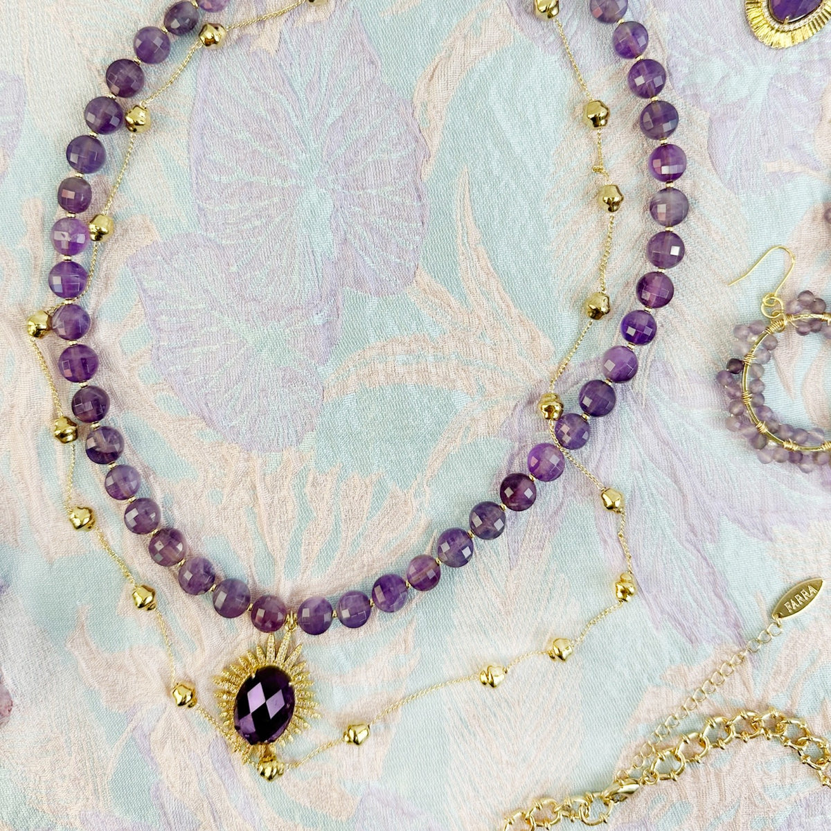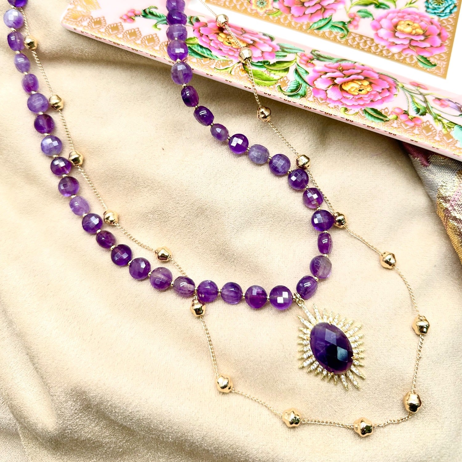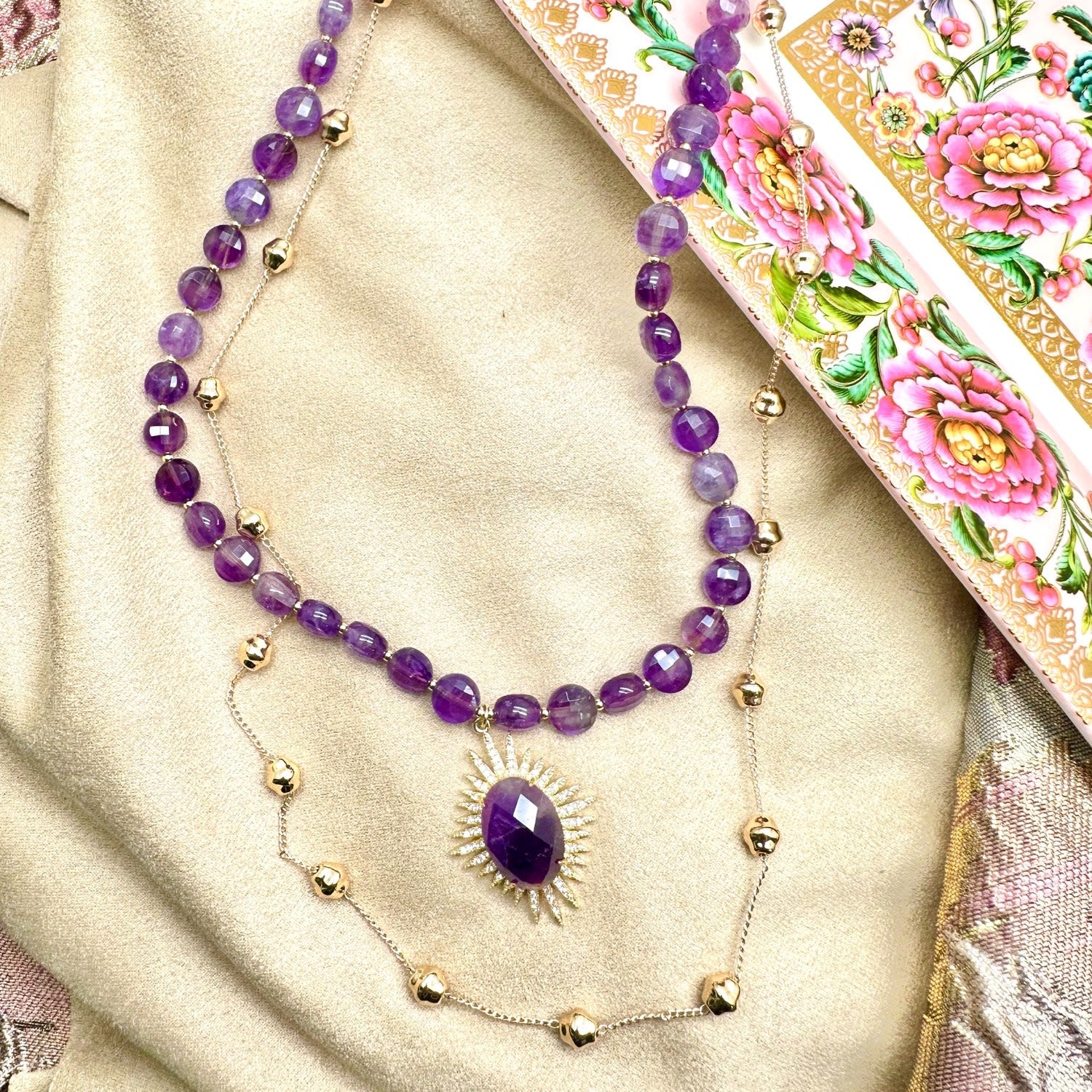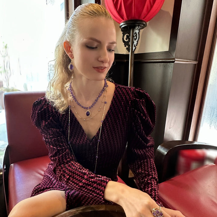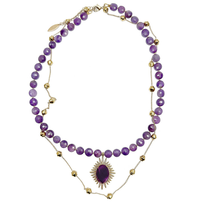This necklace features amethyst stones and is trimmed with 14k gold plated brass. It has a double-layered design with a pendant.