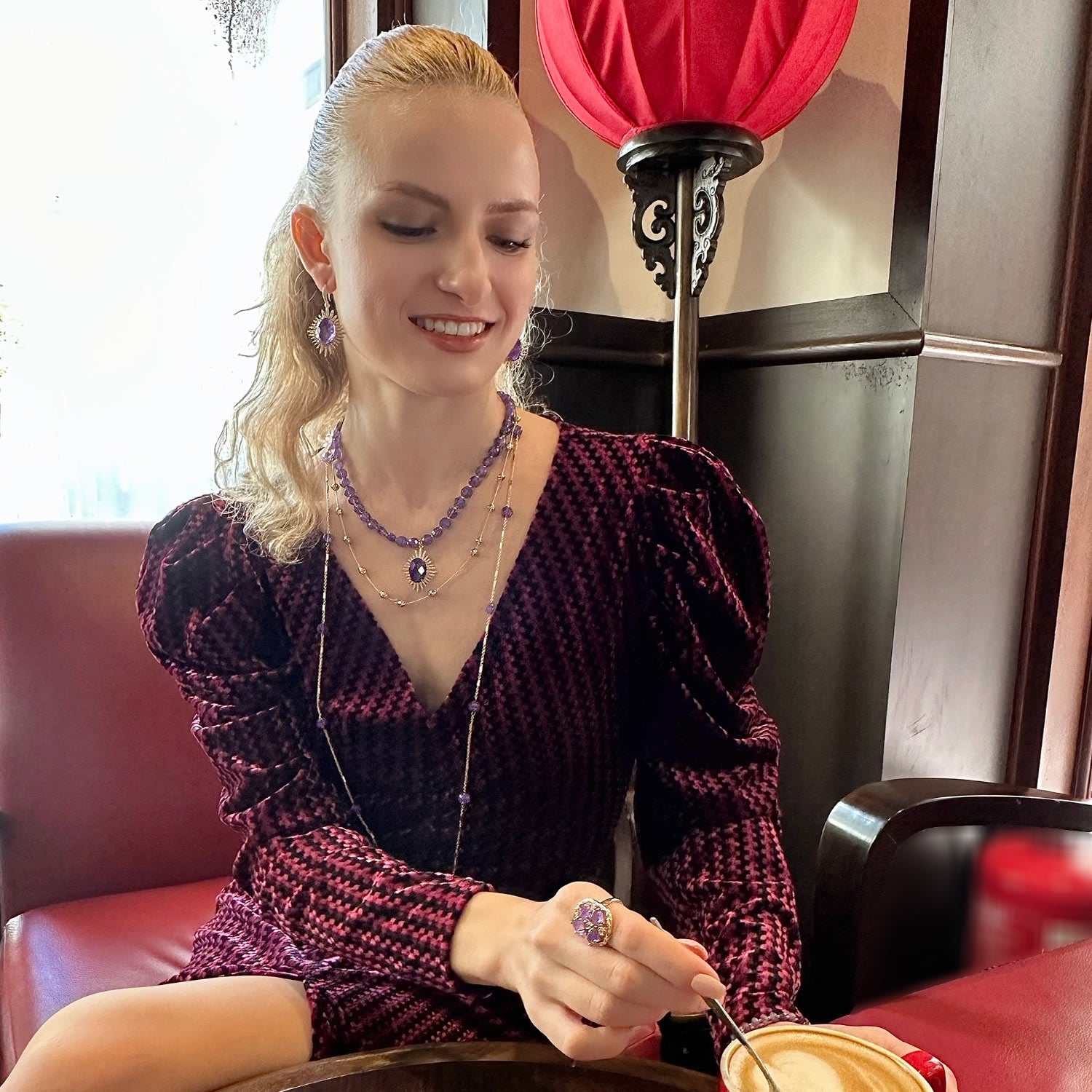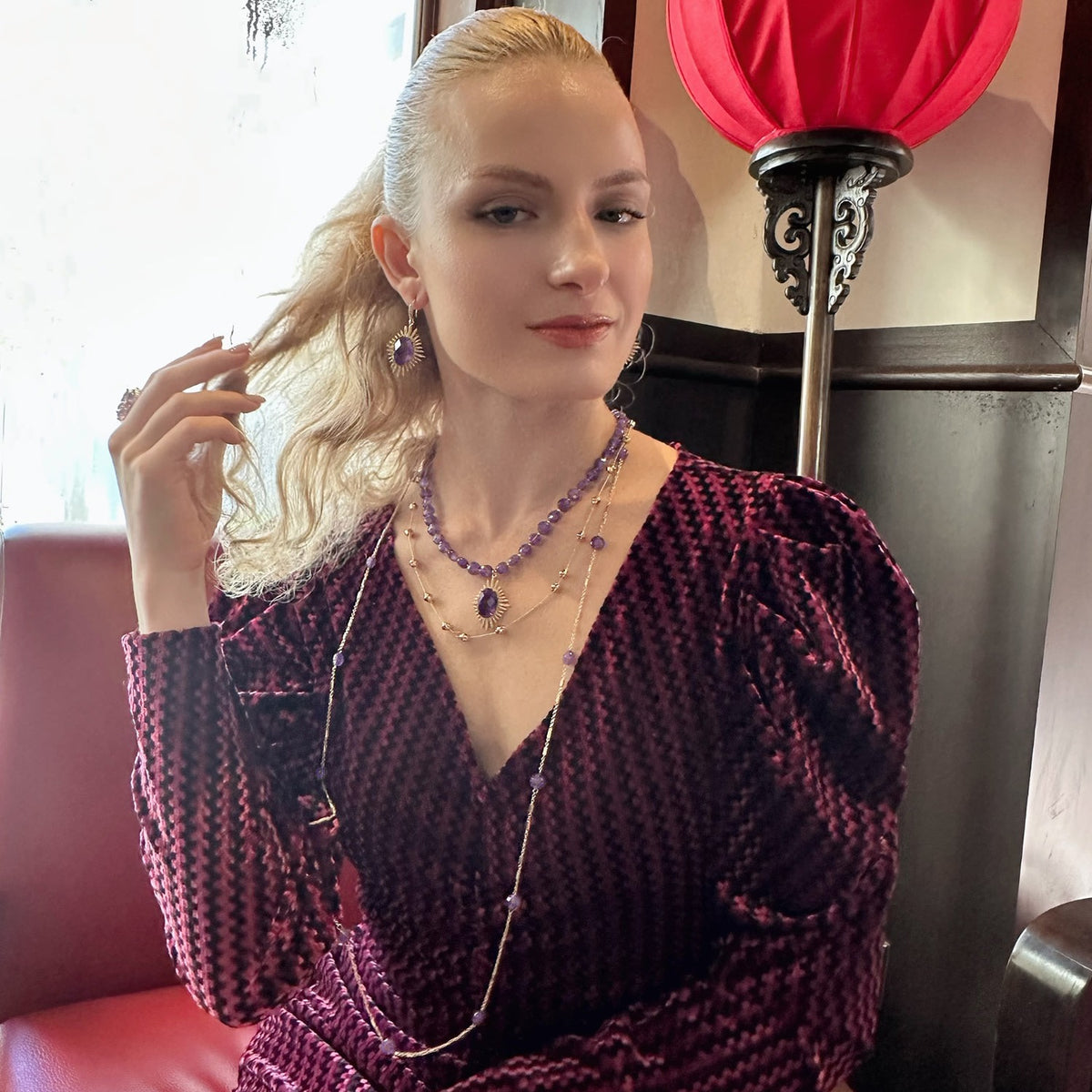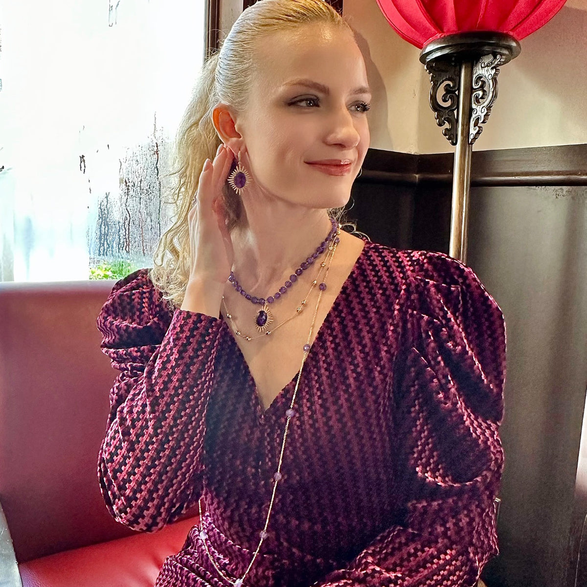 This necklace features amethyst stones and is trimmed with 14k gold plated brass. It has a double-layered design with a pendant.