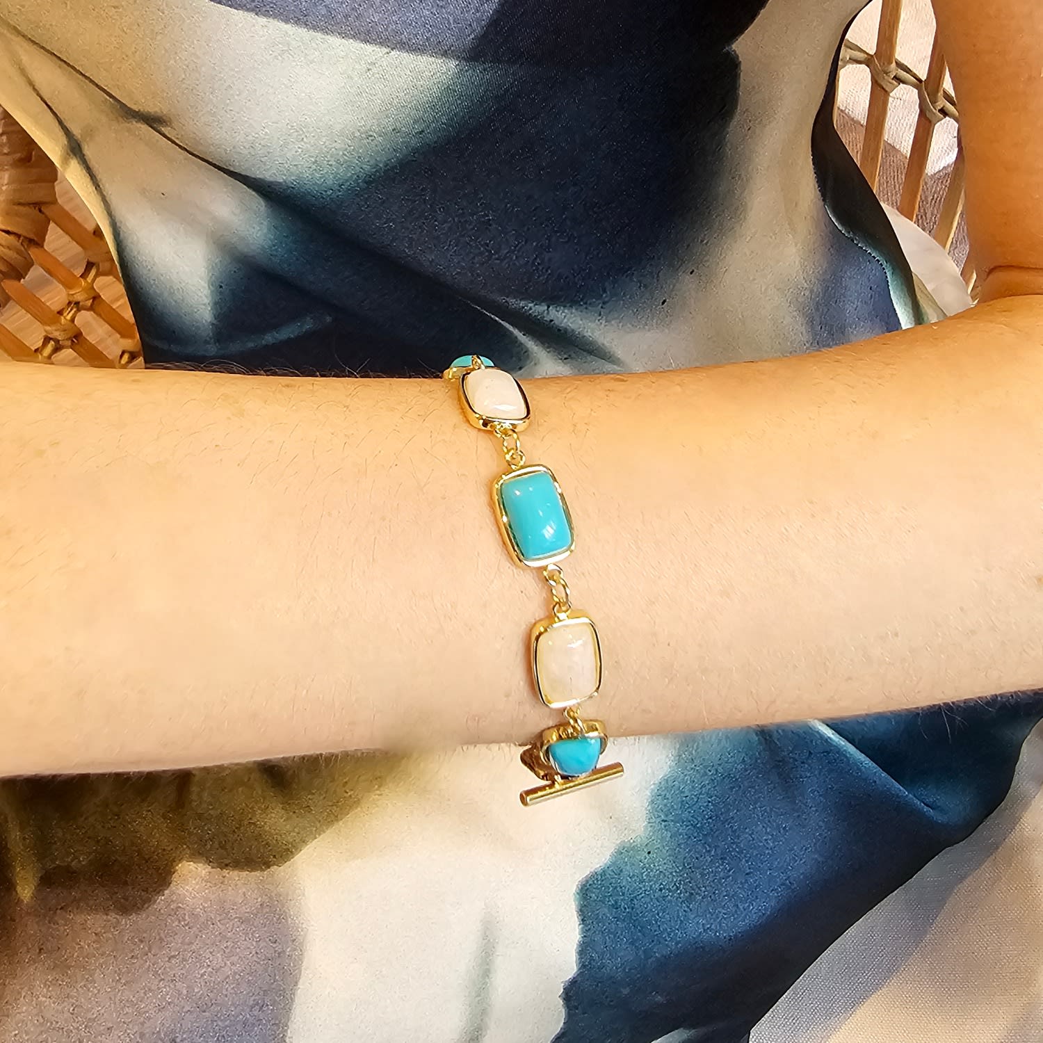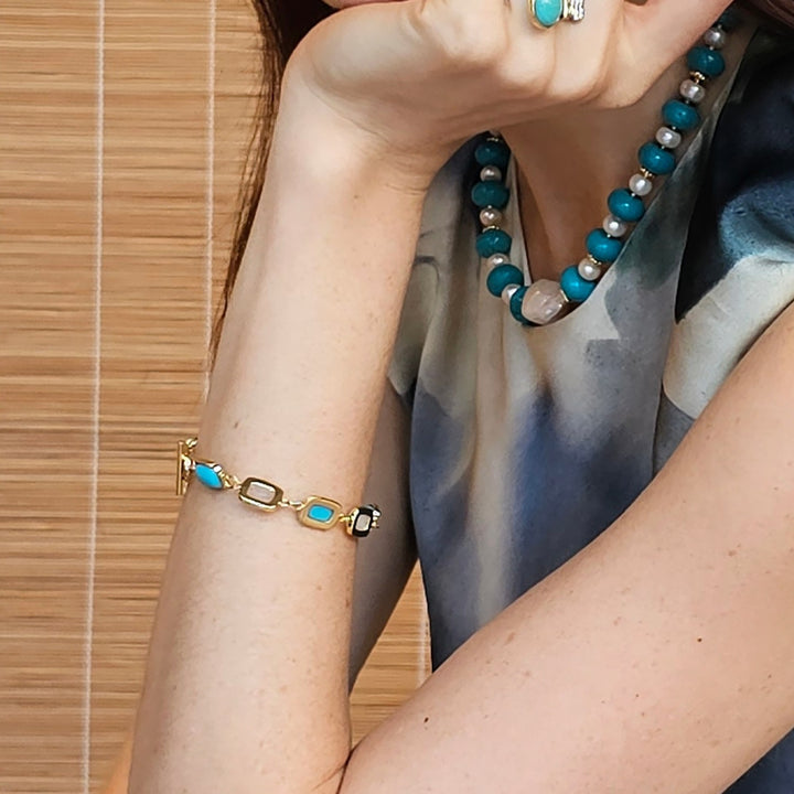 This bracelet features turquoise and white moonstone stones and has a gold-tone setting. It has an adjustable length.