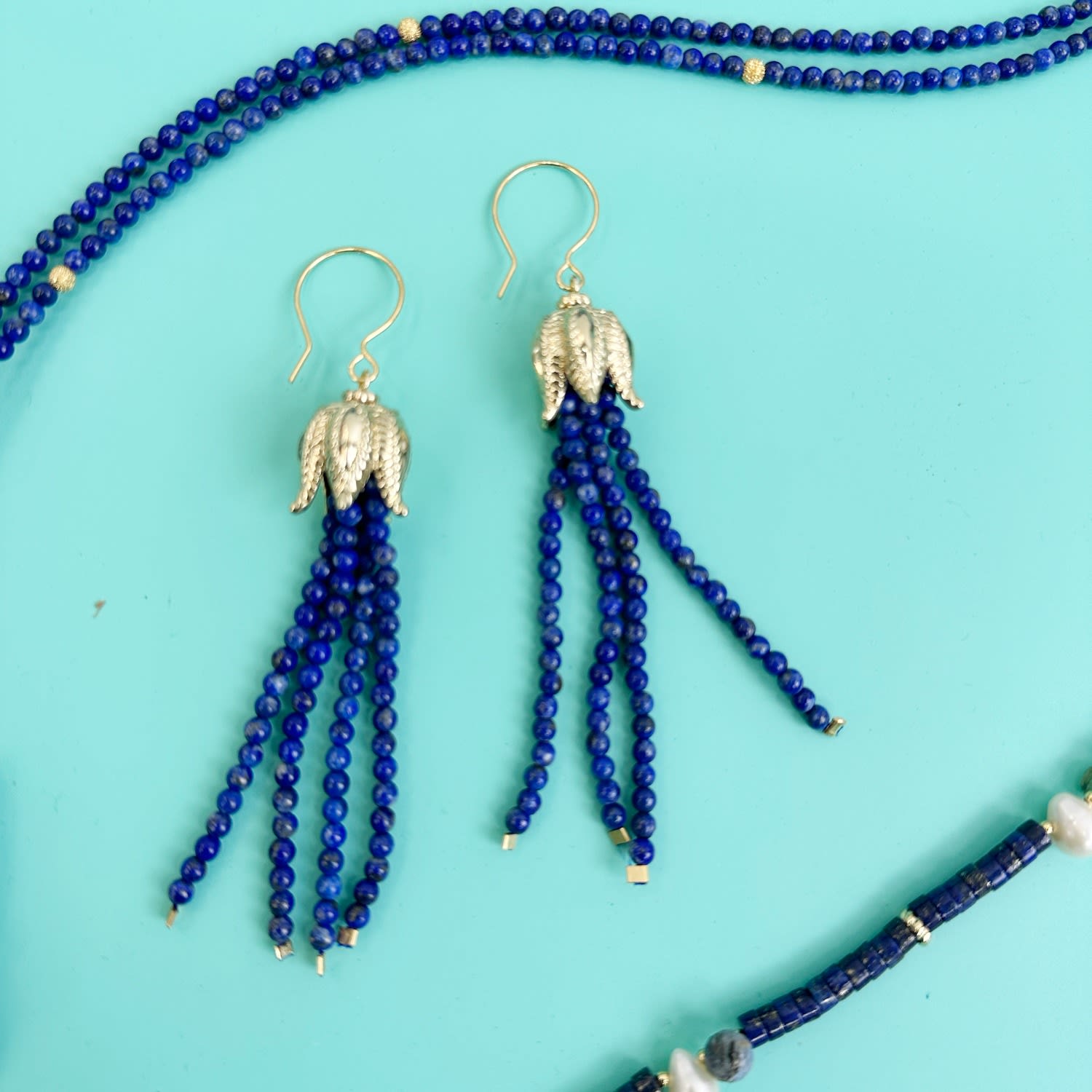 These hoop earrings feature lapis beads and a tassel design. They are made from materials not explicitly stated beyond the lapis.
