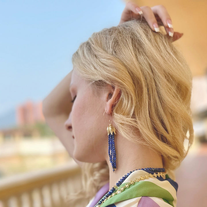 These Lapis Tassel Earrings by Farra are a unique and stylish accessory. The vibrant blue lapis beads, with their luxurious tassel style, add movement and sophistication to any outfit. Lightweight and easy to wear, these earrings are perfect for making a statement and adding a touch of cool bohemian style to your look. Lapis Lazuli is also believed to have metaphysical properties, such as enhancing intuition.