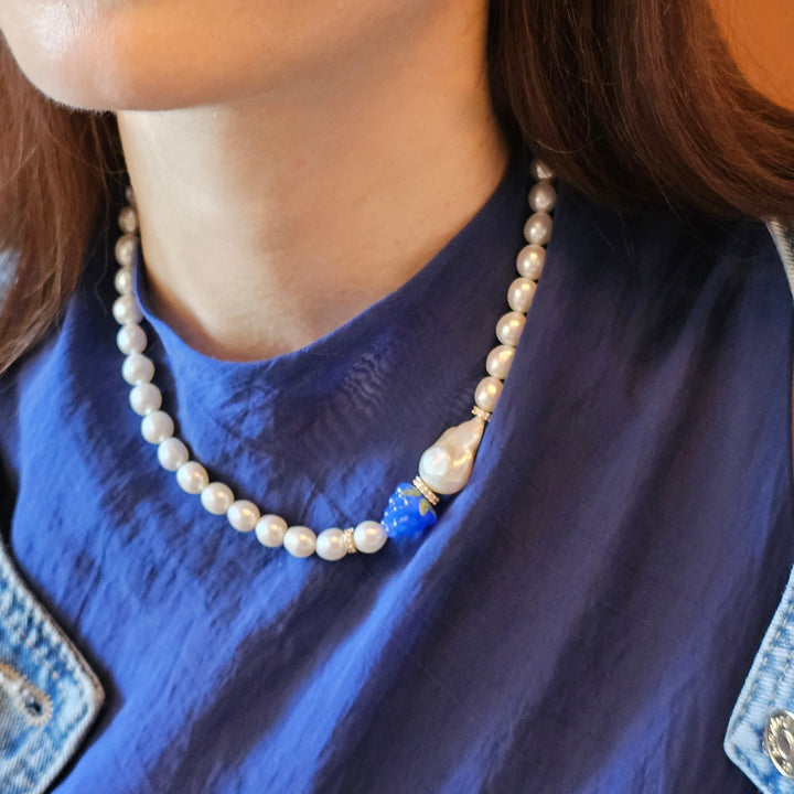 This necklace is made with freshwater pearls and a blue raspberry bead.