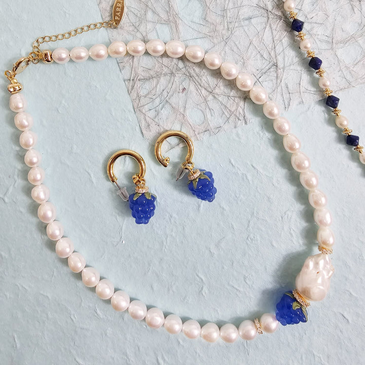 This Freshwater Pearls With Blue Raspberry Necklace by Farra is an exquisite and sophisticated piece. It features lustrous freshwater pearls beautifully complemented by a vibrant blue raspberry accent. This necklace offers a striking contrast of classic and modern, perfect for adding a pop of color to any outfit, from summer dresses to office attire.
