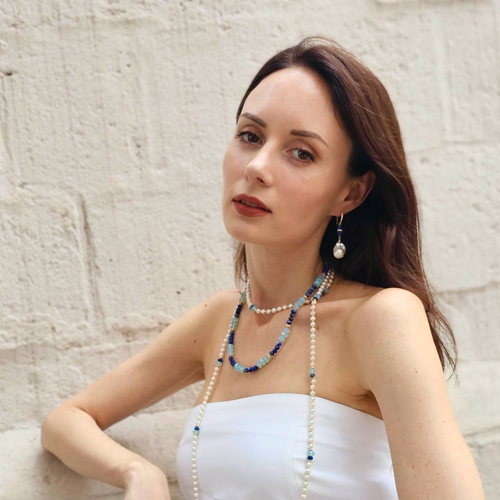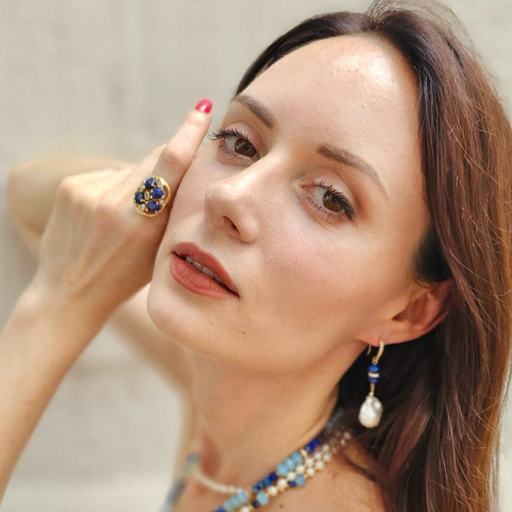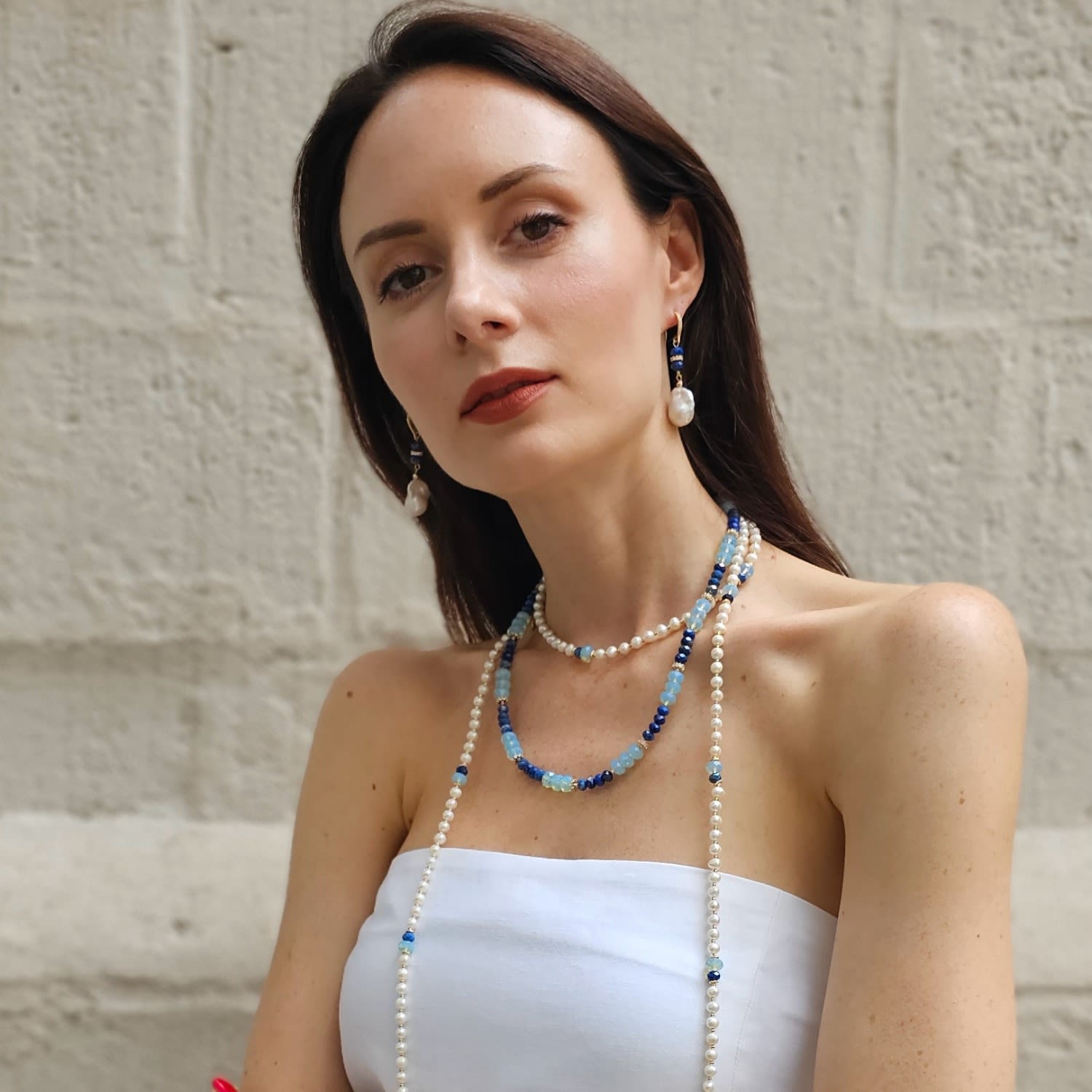 These Elegance Baroque Pearls With Lapis Dangle Earrings by Farra are a stunning fusion of classic sophistication and contemporary design. Each earring features exquisite baroque pearls and vibrant lapis lazuli accents. The deep blue of the lapis, a stone associated with wisdom and enlightenment, creates a striking contrast with the pearls, making these earrings a true statement piece.