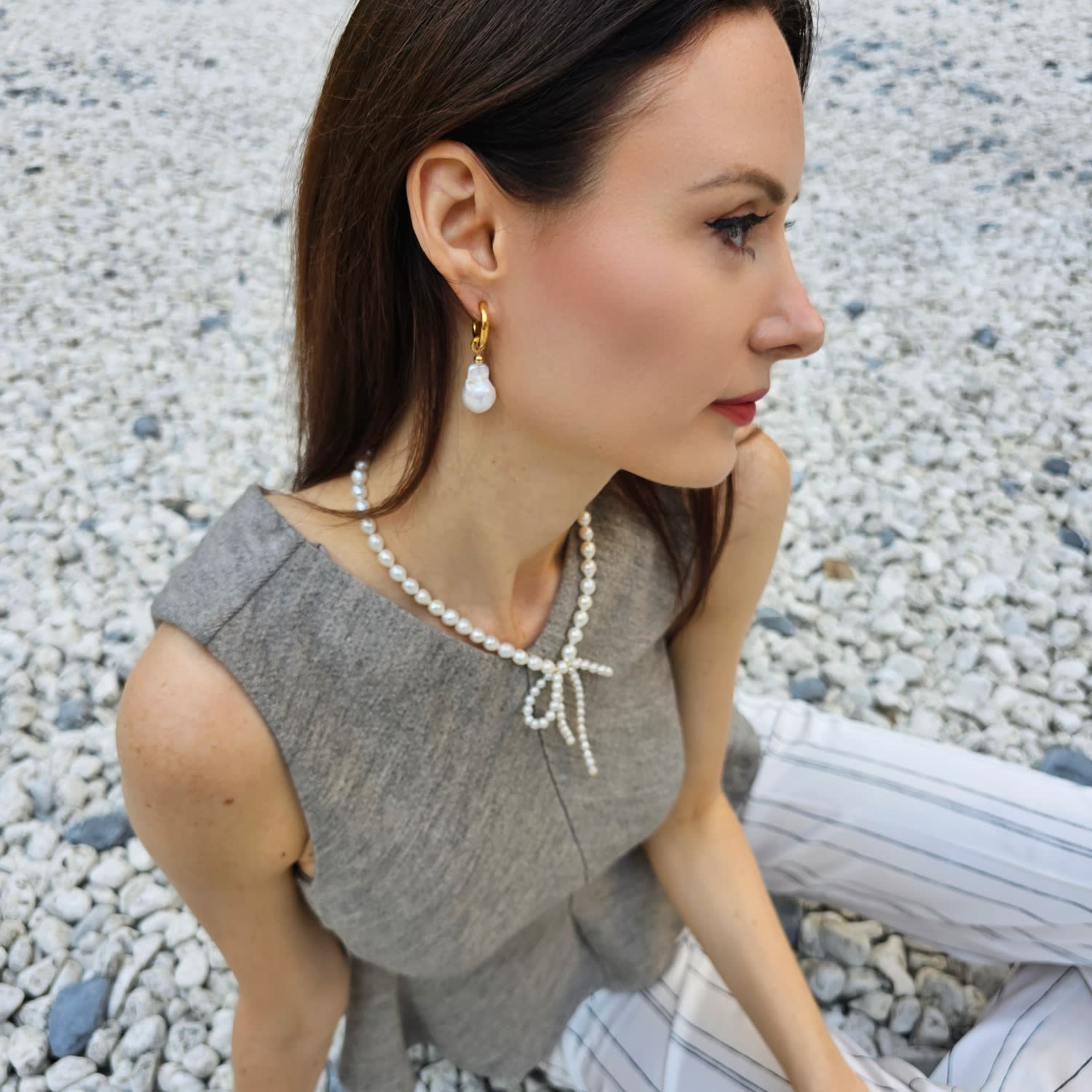 The Freshwater Pearls Butterfly Knot Statement Necklace by Farra is a stunning and meaningful piece. It features a beautiful butterfly knot made of freshwater pearls, symbolizing transformation and beauty. The timeless charm of the pearls with the modern twist of the butterfly design makes this necklace a sophisticated and graceful accessory.