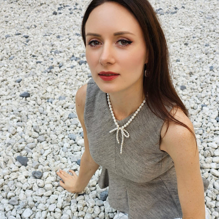 This beaded necklace is made with freshwater pearls and has a butterfly knot design.