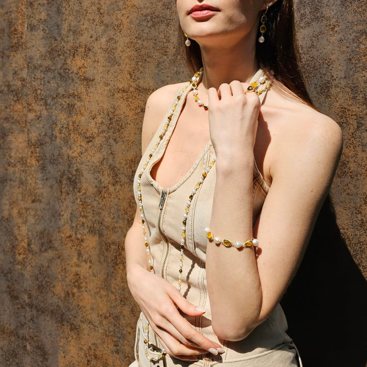 This beaded bracelet features yellow quartz, brown tiger eye, and freshwater pearls. The specific material for the beads is not explicitly stated.