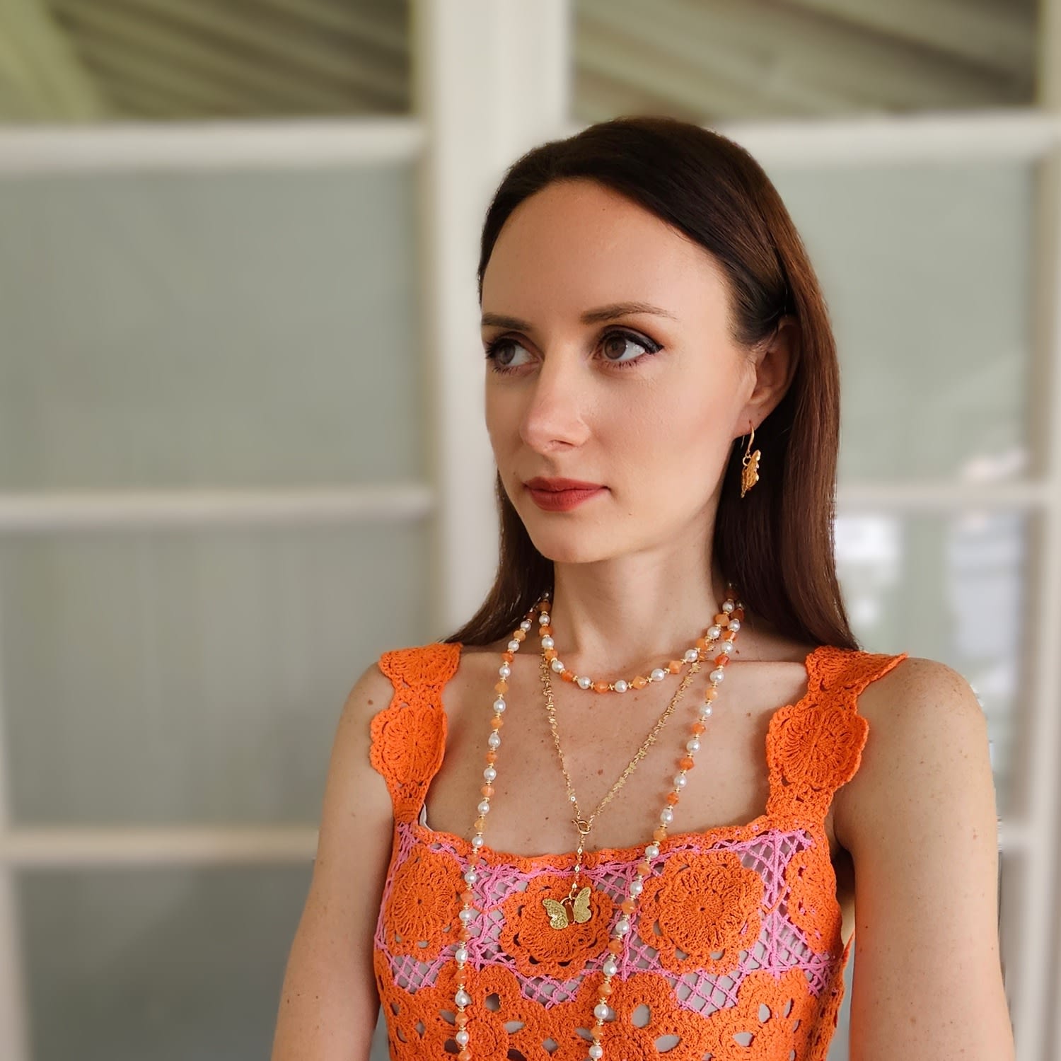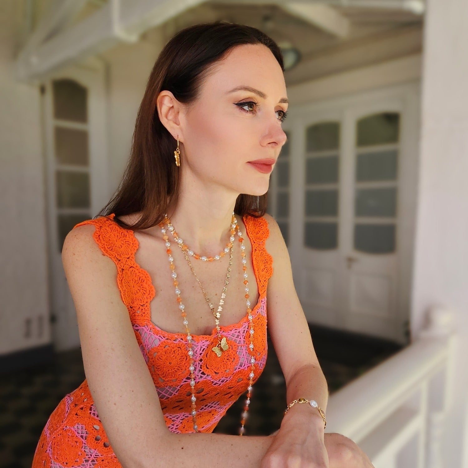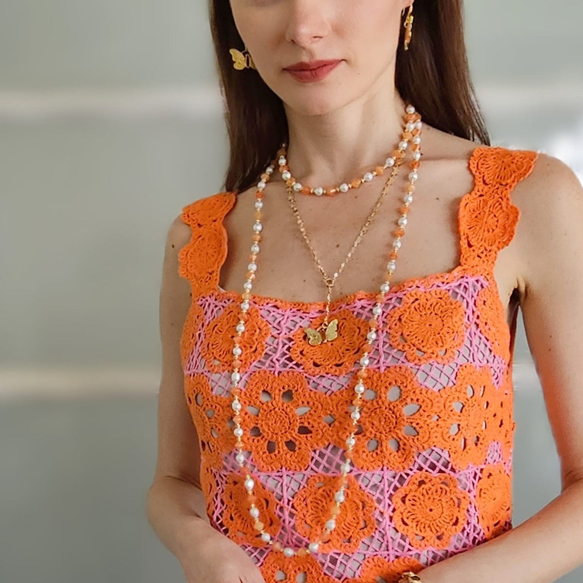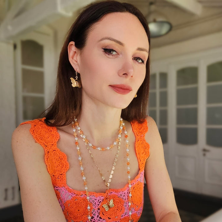 This versatile necklace features a butterfly pendant with a red agate stone and a butterfly chain. The material is not explicitly stated.