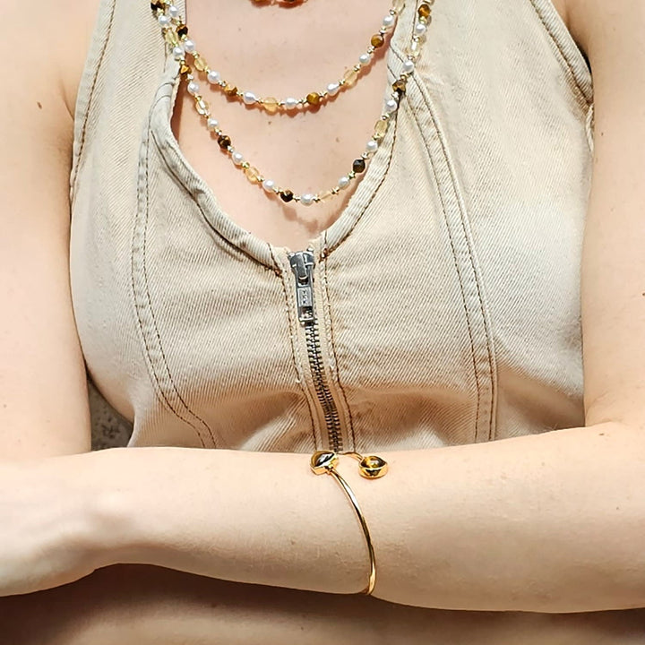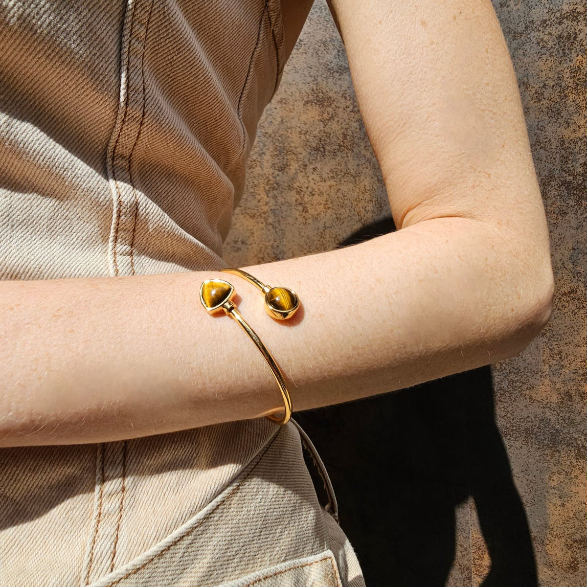 This bangle is made with two polished brown tiger eye stones and gold-plated brass. It has an adjustable fit.