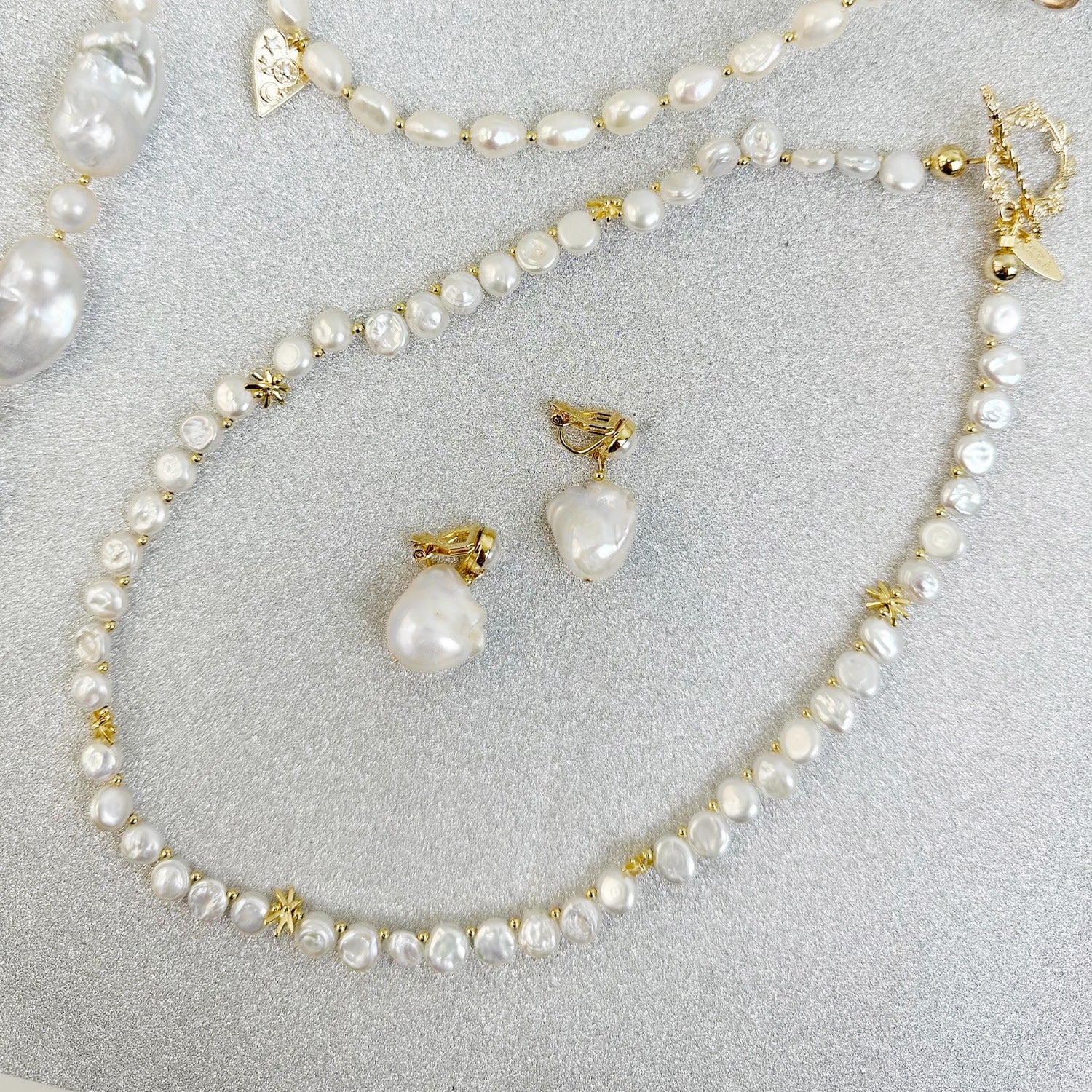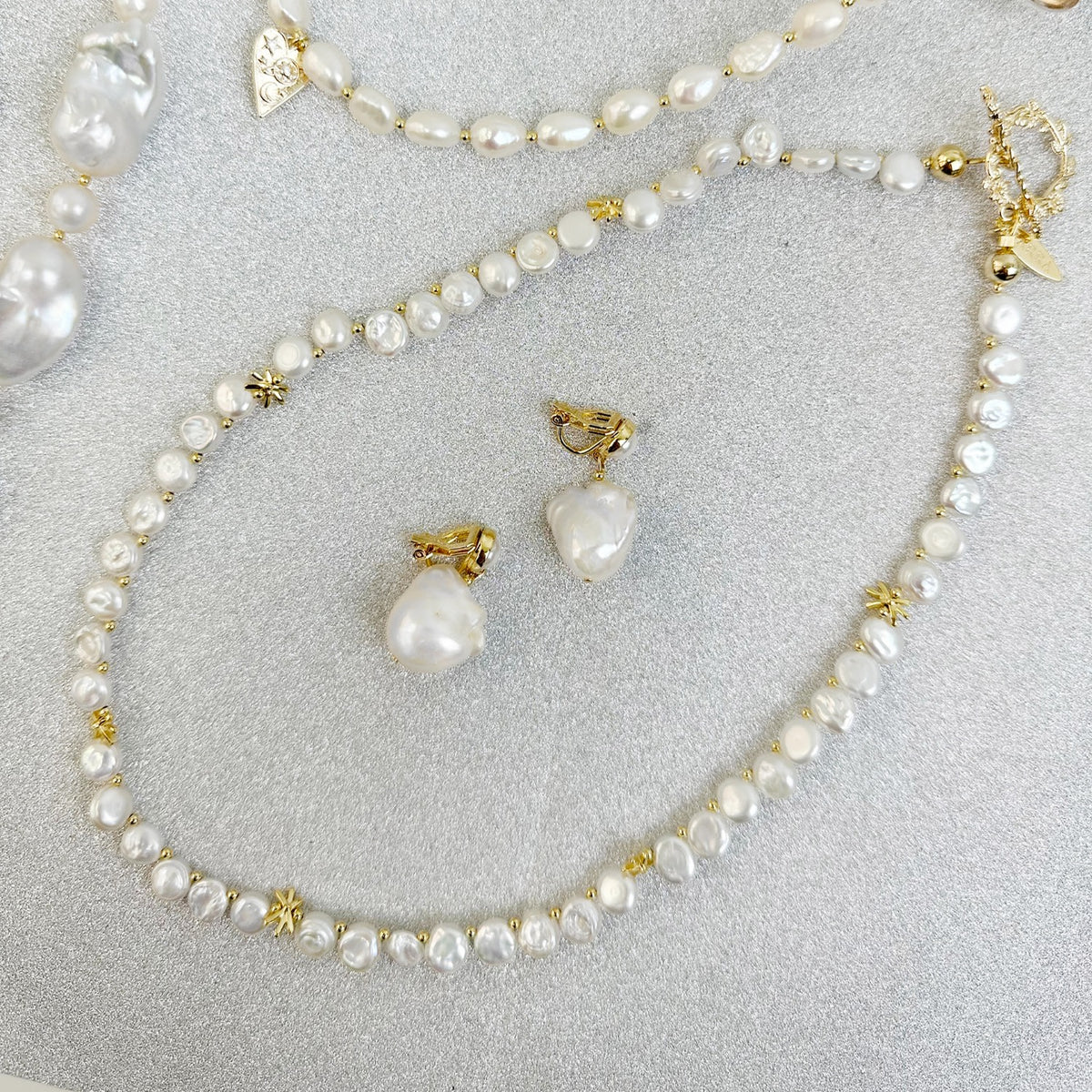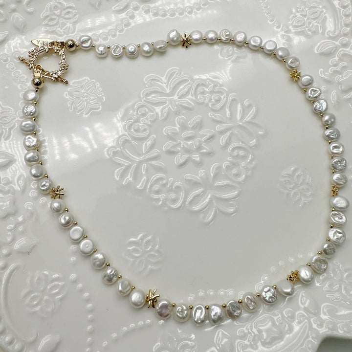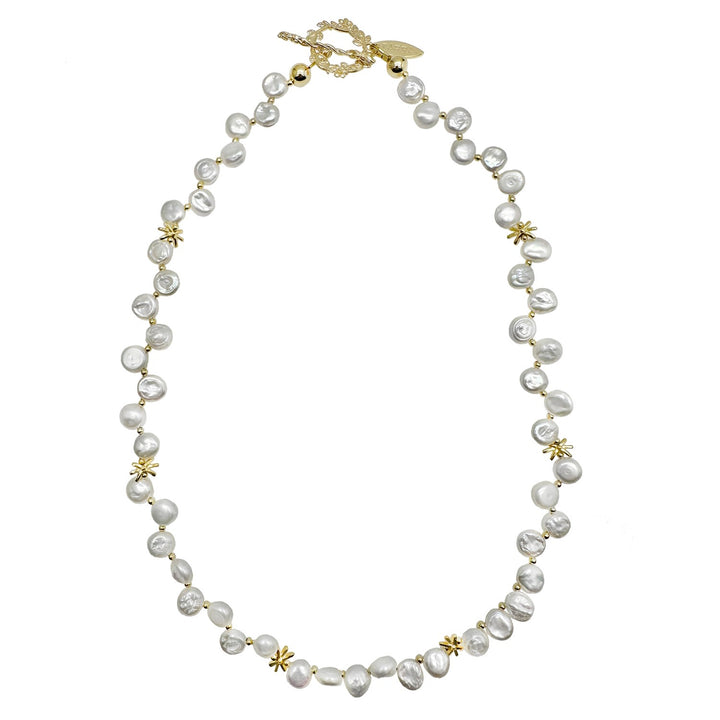 This short necklace is made of freshwater pearls that are shaped like flowers. The specific material for the chain or clasp is not explicitly stated.