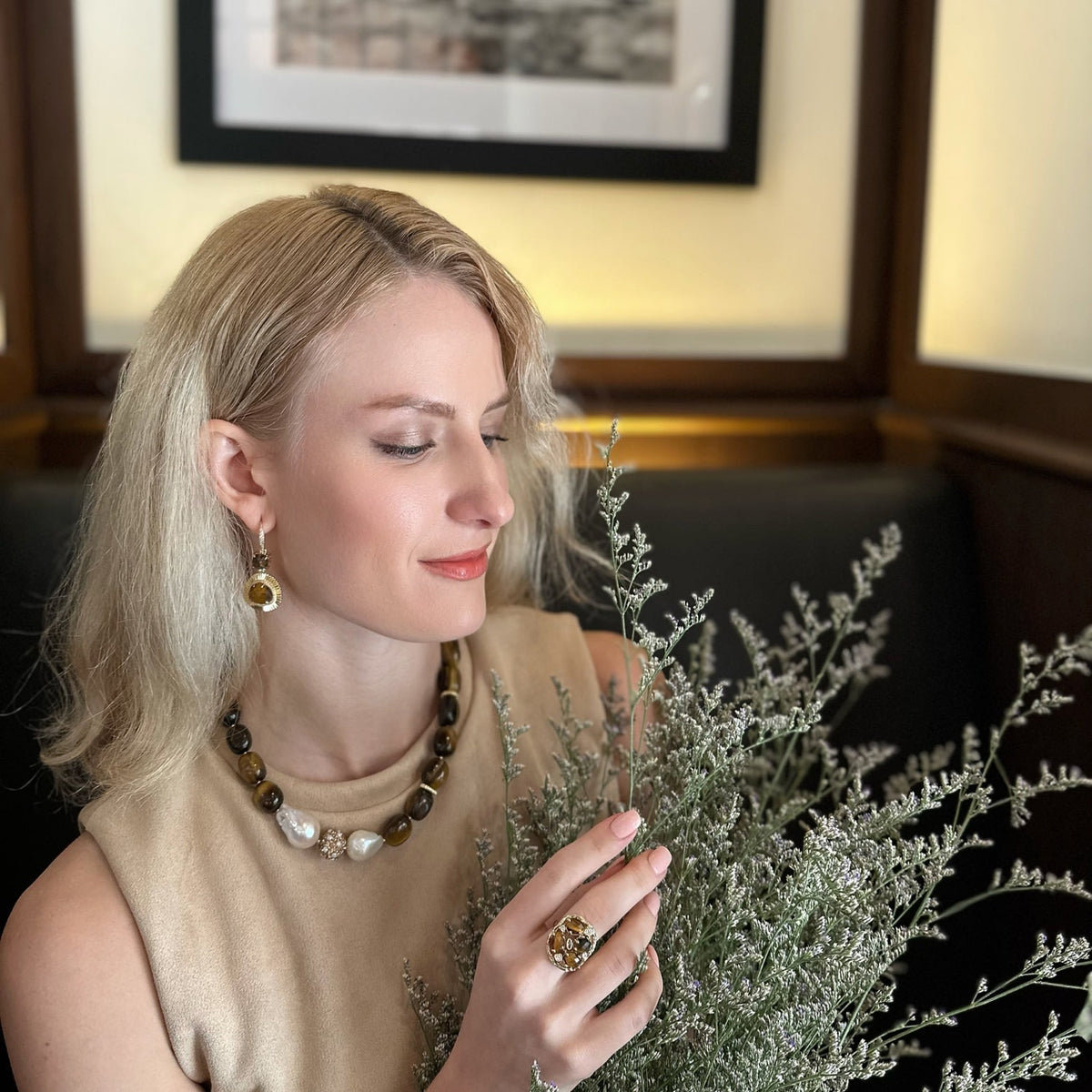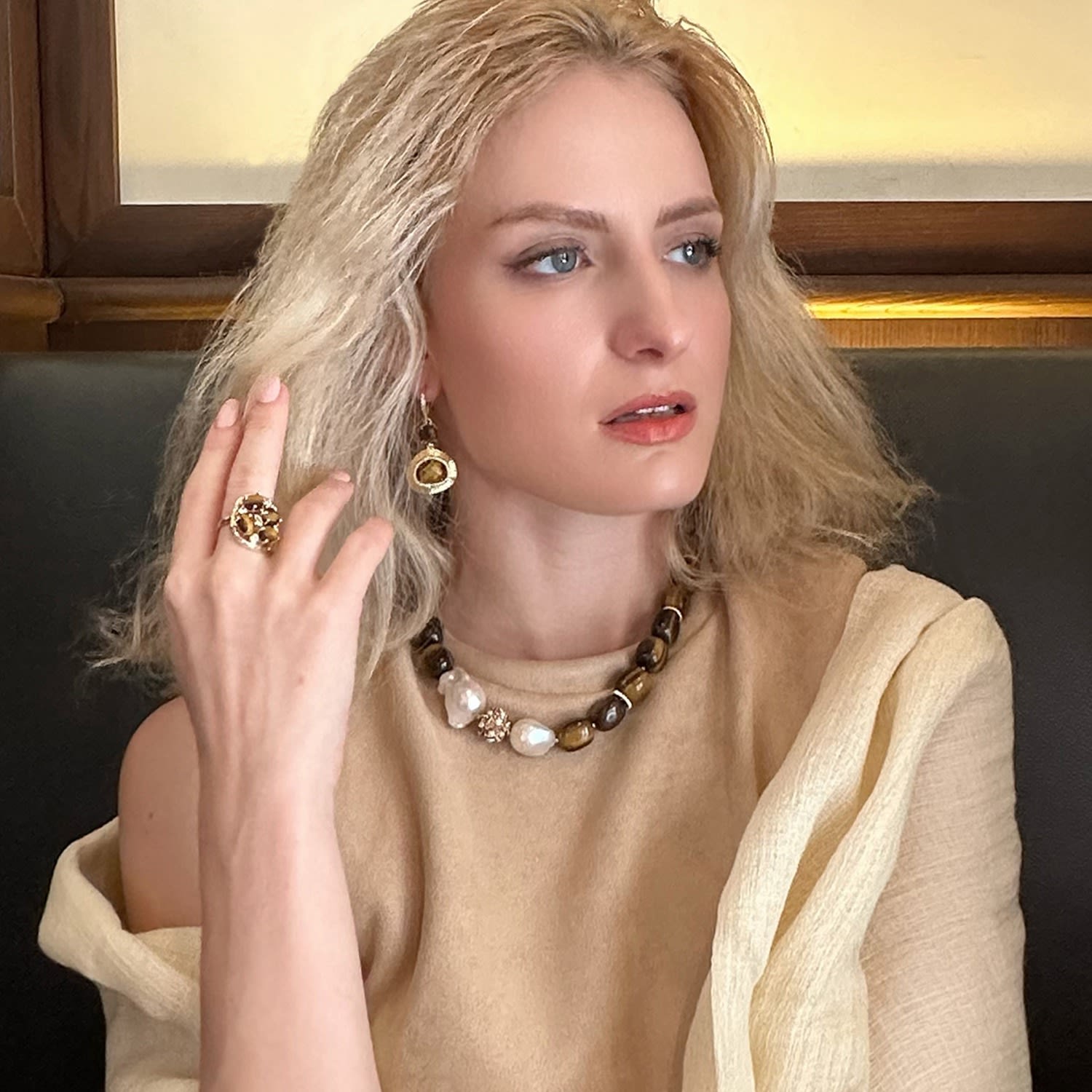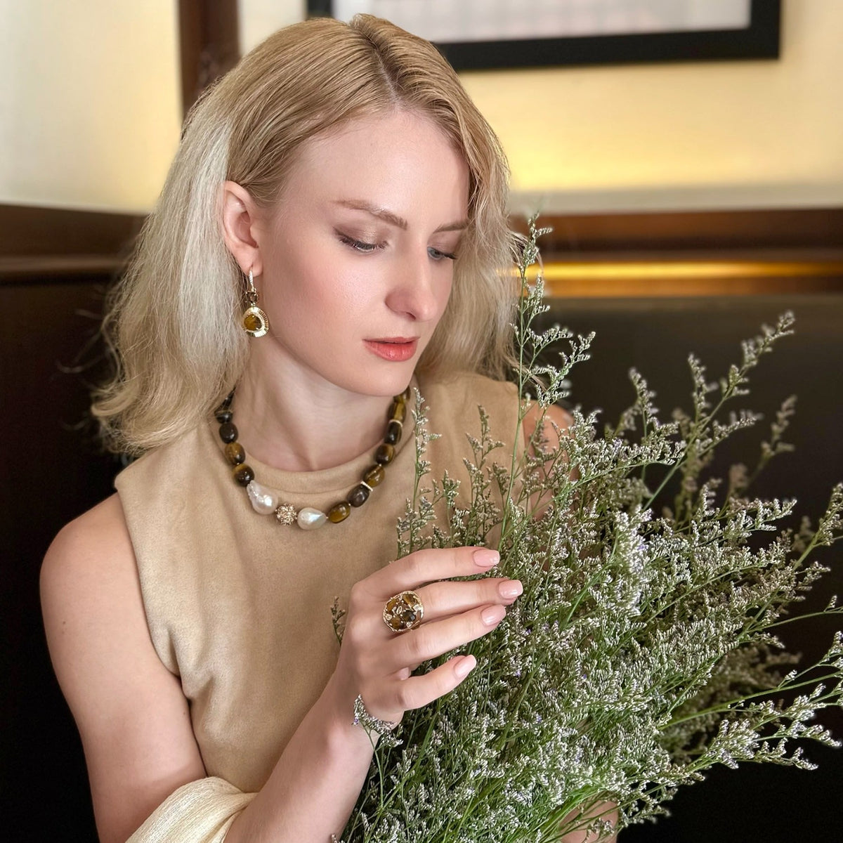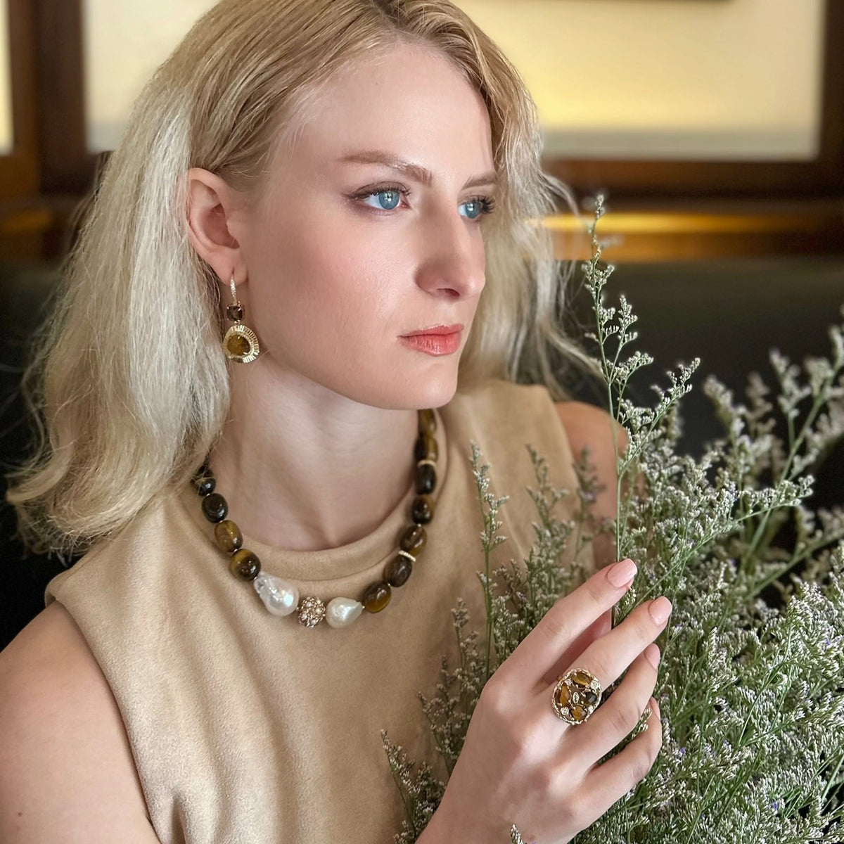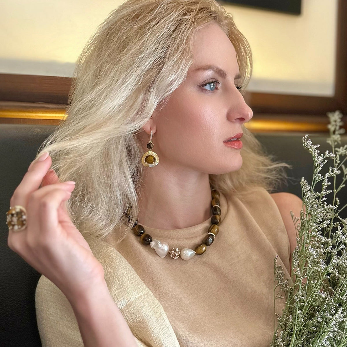 The Gorgeous Tiger Eye With Baroque Pearls Necklace by Farra is a stunning and sophisticated piece. It effortlessly combines the natural allure of tiger eye stones with the organic elegance of baroque pearls. The visual contrast adds depth and texture, resulting in a necklace that exudes sophistication and refinement.