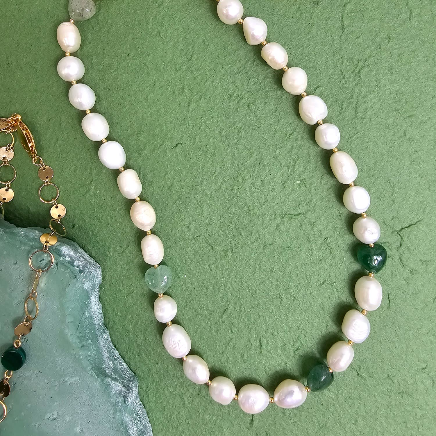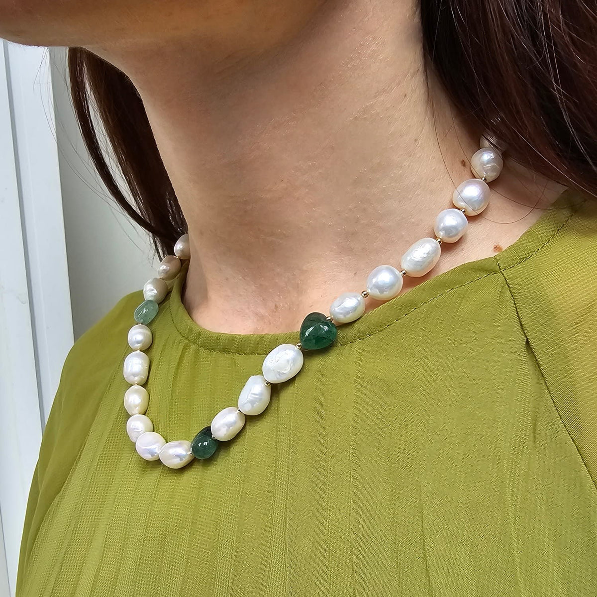 Freshwater Pearls With Heart Shaped Green Aventurine Free Style Necklace