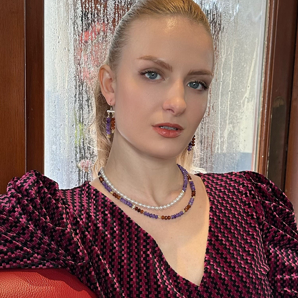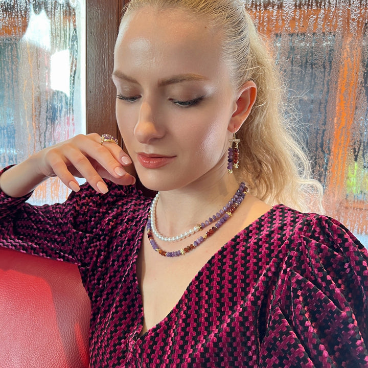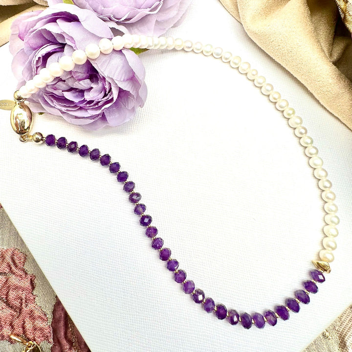 The Purple And White Amethyst & Freshwater Pearls Short Necklace by Farra is a beautiful and contemporary accessory. This short necklace features an eye-catching contrast of Amethyst and Freshwater pearls, creating a feminine and timeless look. Amethyst, the birthstone for February, is associated with spirituality, peace, and clarity of mind.