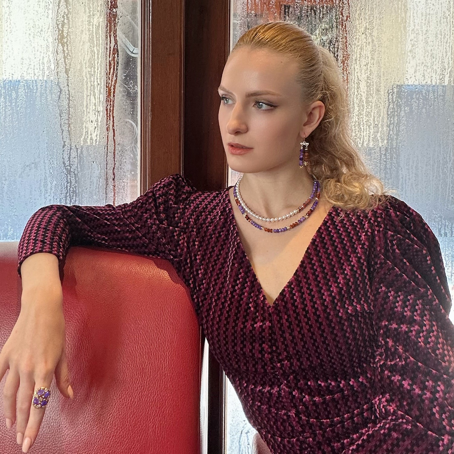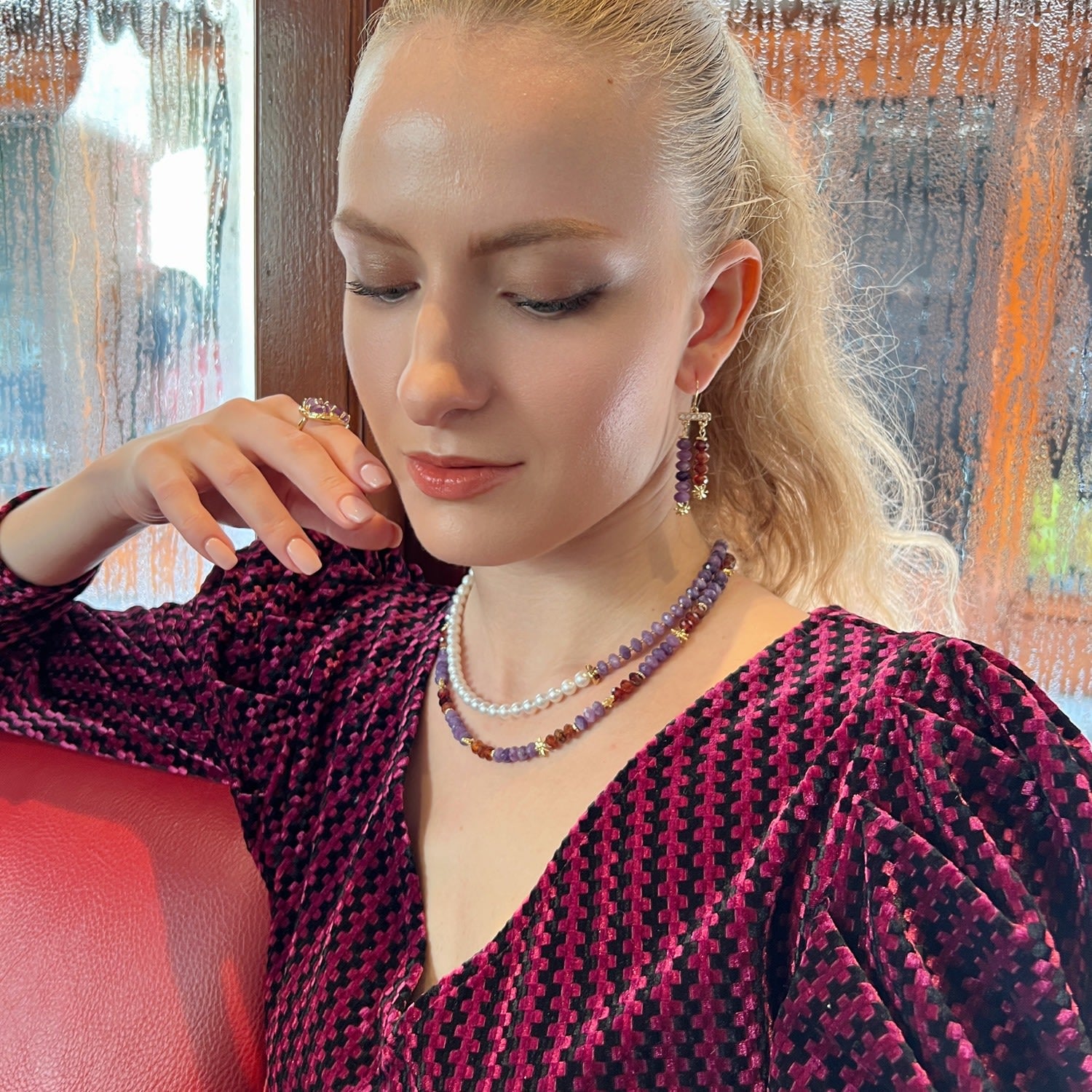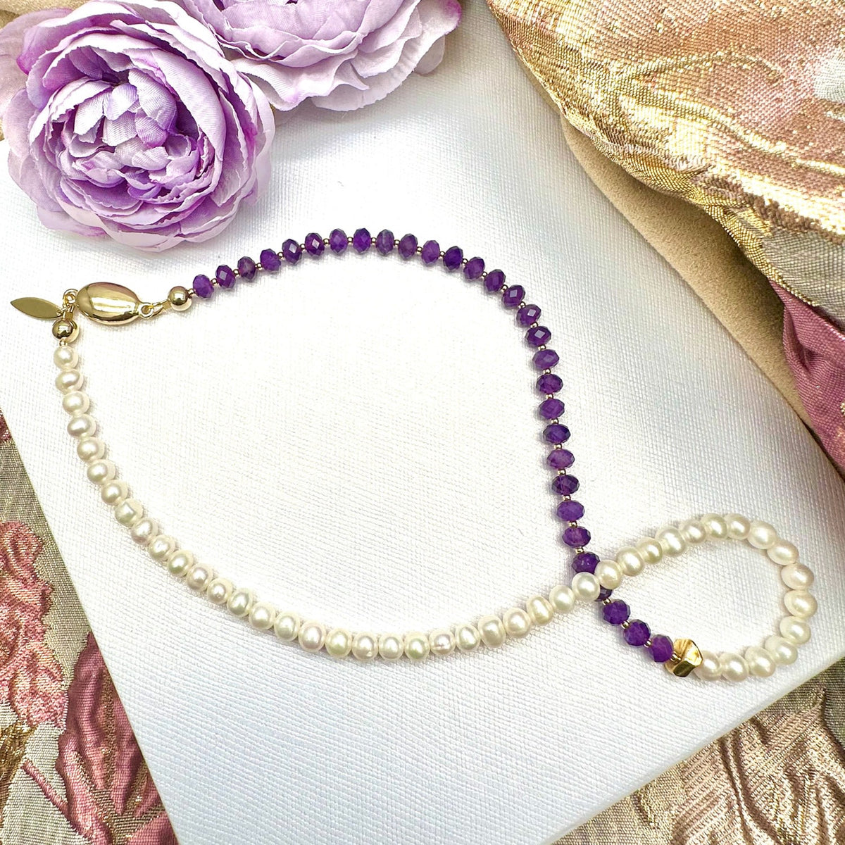 This pearl necklace features Amethyst and Freshwater pearls. The specific metal for the chain or clasp is not explicitly stated.