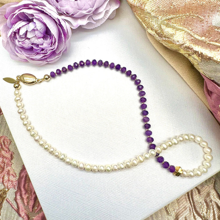 Purple And White Amethyst & Freshwater Pearls Short Necklace