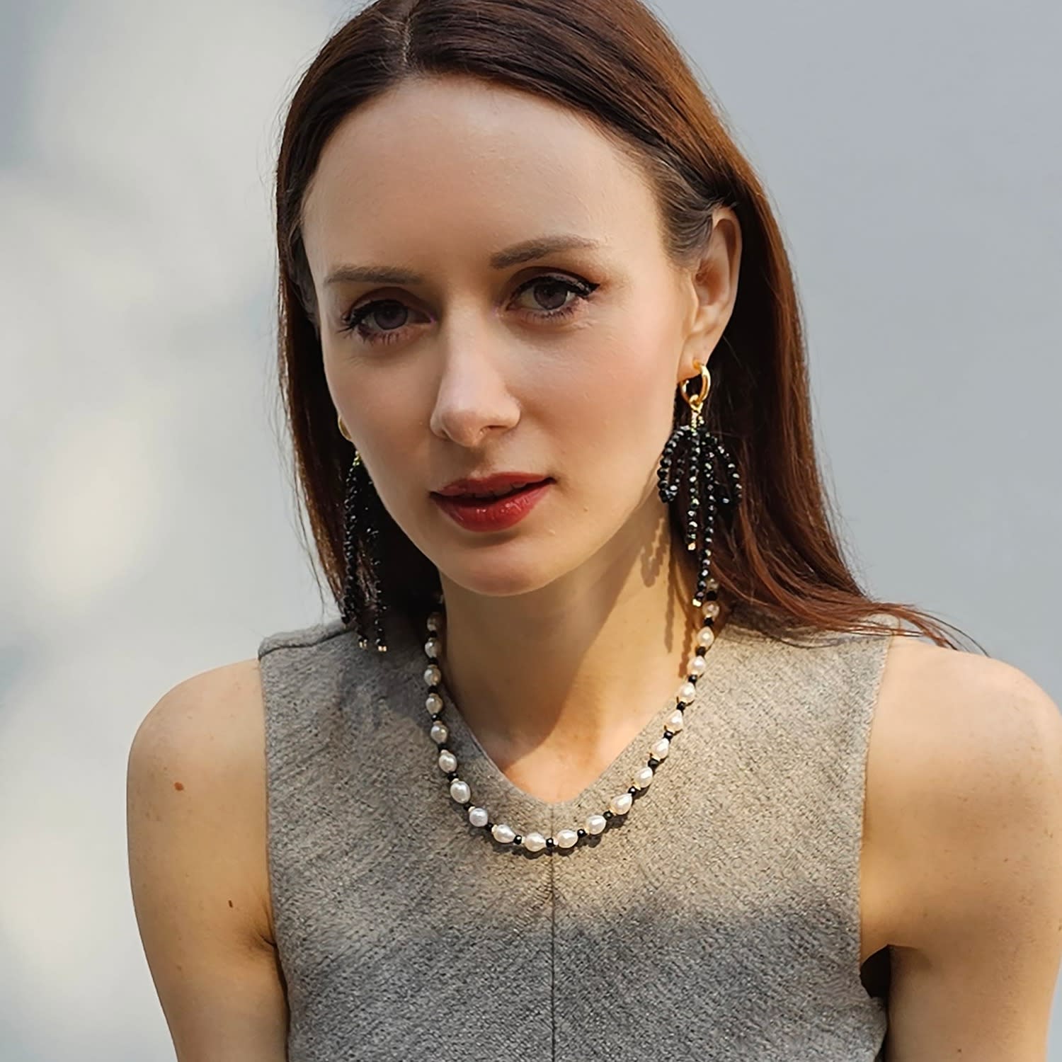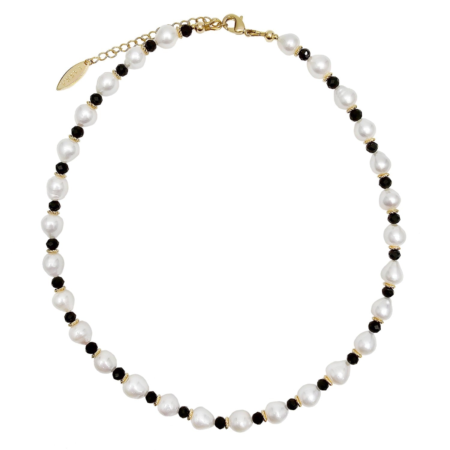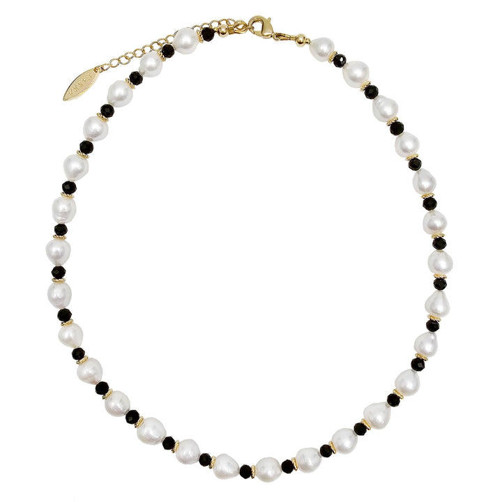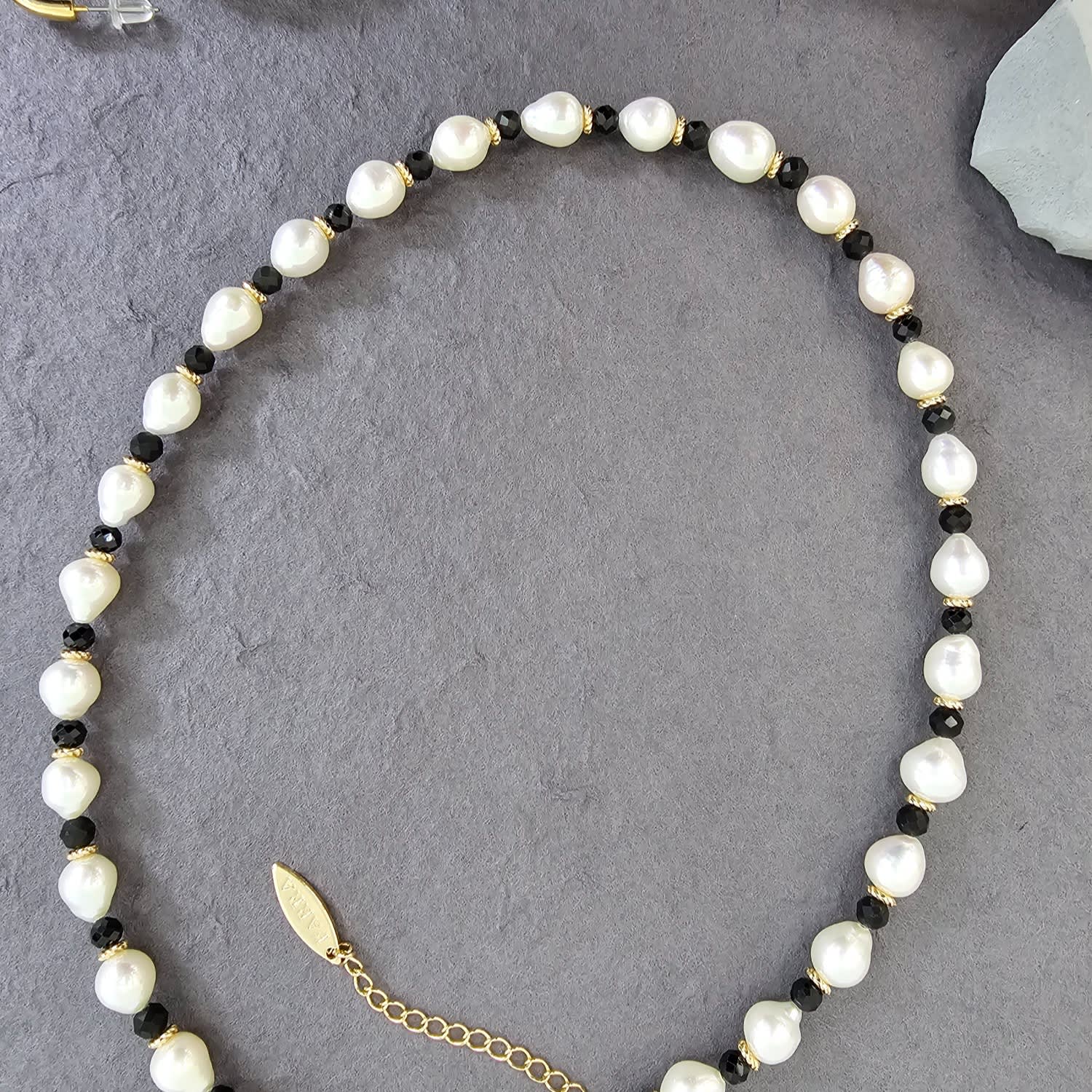 This pearl necklace features a blend of white pearls and black obsidian. The specific material for the chain or clasp is not explicitly stated.