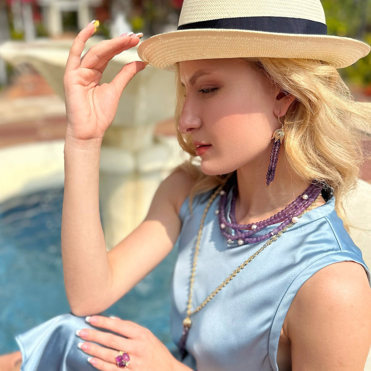 The Multi-Layers Matte Amethyst With Pearls Statement Necklace by Farra is a stunning and elegant accessory. This multi-layered necklace is crafted with high-quality amethyst stones and pearls. The blend of rich, deep purples creates a mesmerizing effect, and the amethyst is known for its calming and stress-relieving properties.