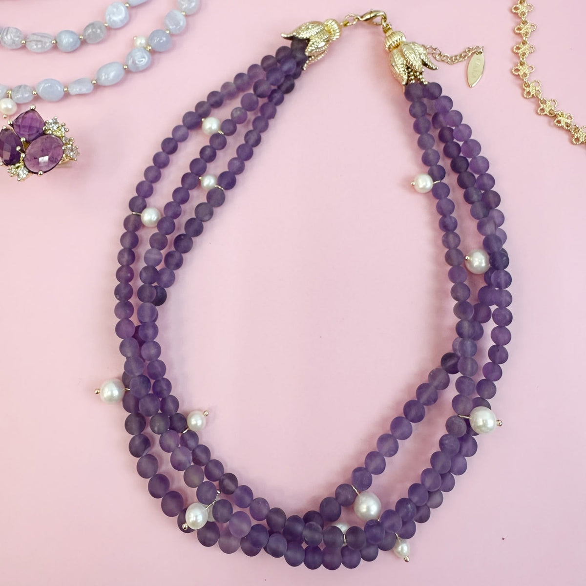 This pearl necklace features multi-layers of high-quality matte amethyst stones and pearls. The specific material for the chain or clasp is not explicitly stated.
