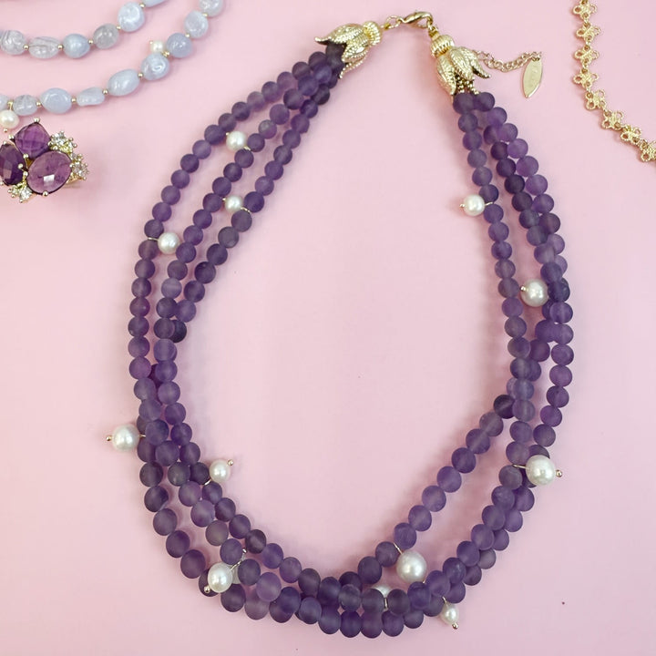 Multi-Layers Matte Amethyst With Pearls Statement Necklace