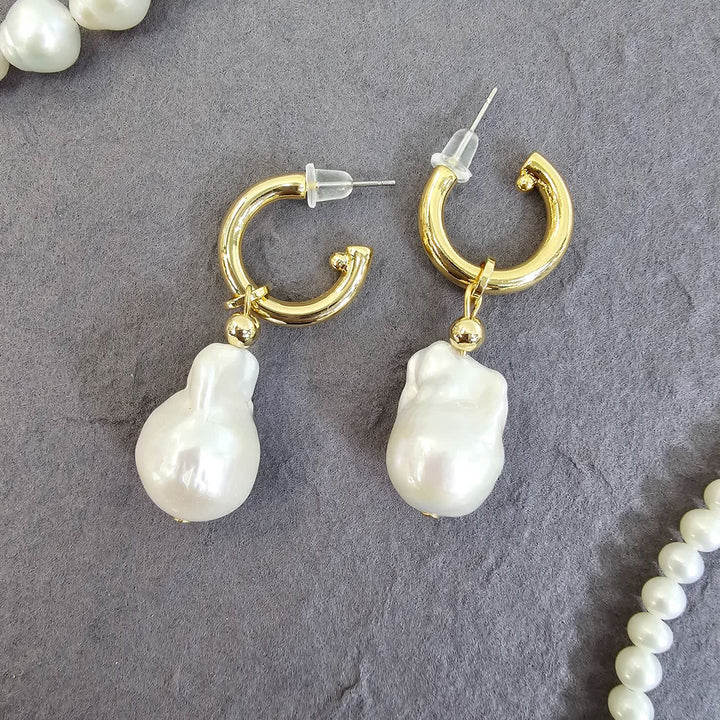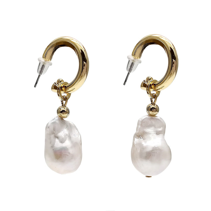 These pearl earrings feature a stylish hoop design with dangling unique baroque pearls. The base metal for the hoop is not explicitly stated.