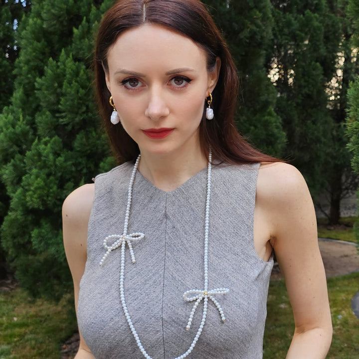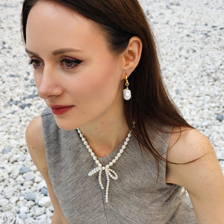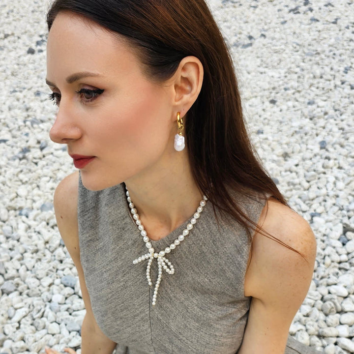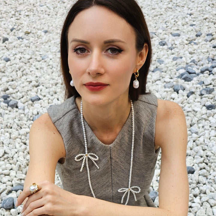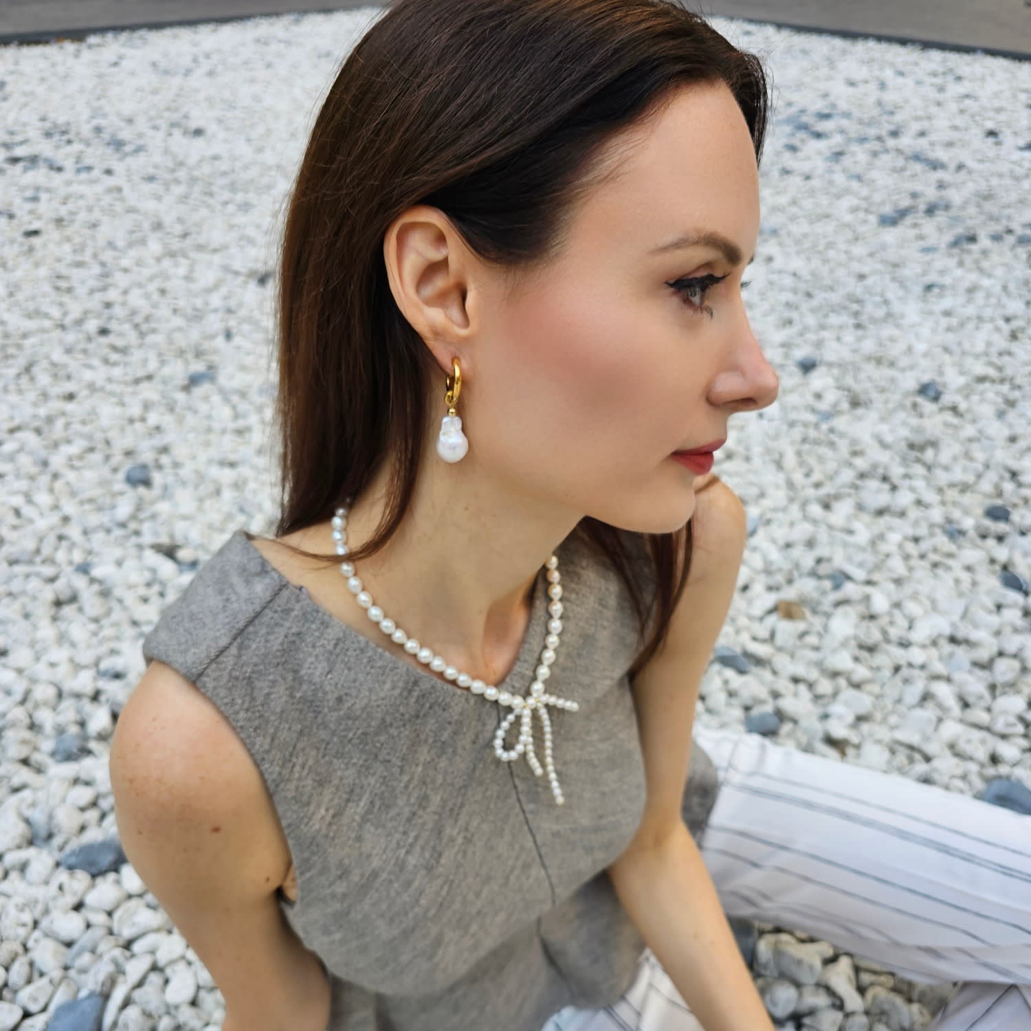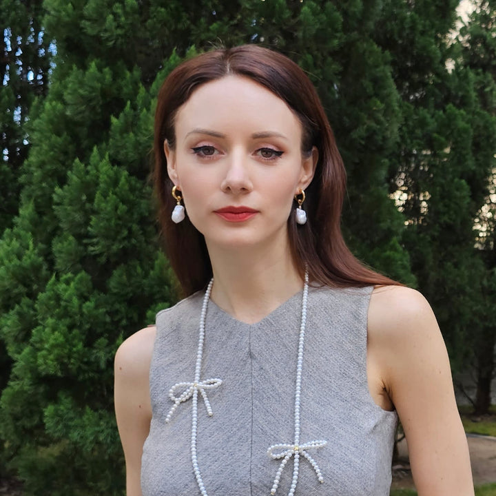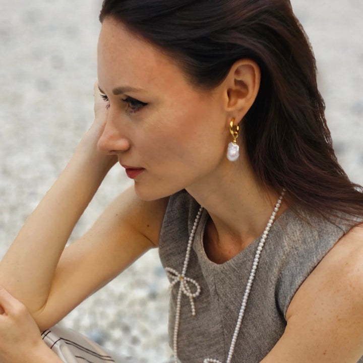 The Baroque Pearls Dangle Hoop Earrings by Farra are an exquisite and unique accessory. These pearl earrings feature unique baroque pearls, celebrated for their organic shapes and mesmerizing luster. Set against a stylish hoop design, the pearls dangle gracefully, creating a captivating movement that highlights their natural beauty.