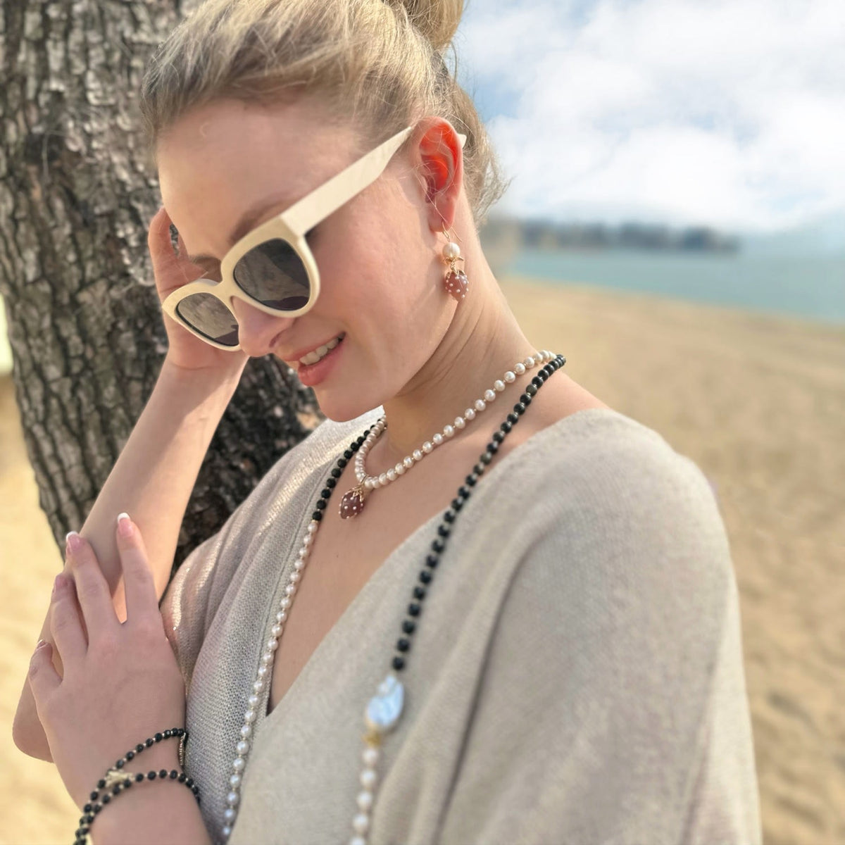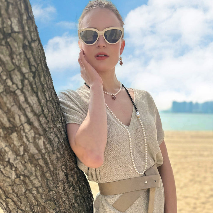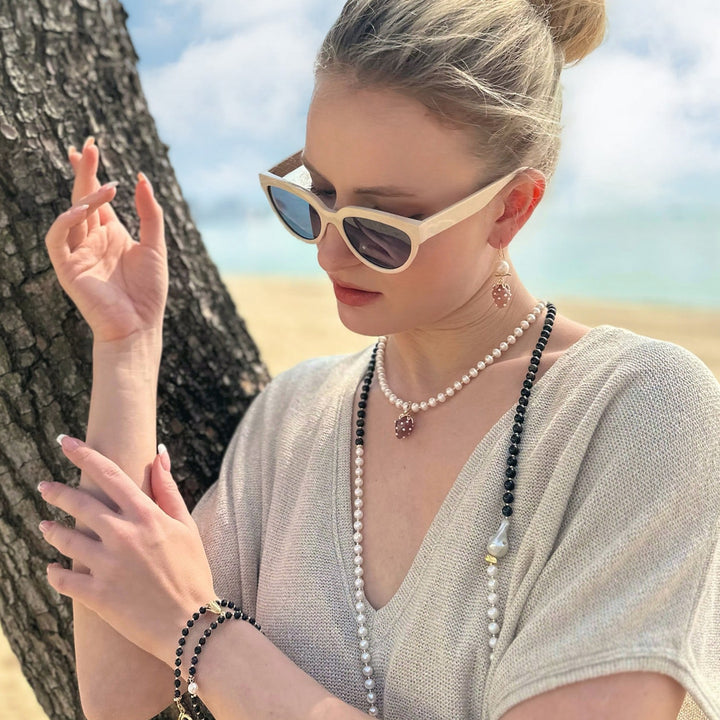 The Black Obsidian And White Freshwater Pearls Long Necklace by Farra is a stunning and sophisticated piece. This long pearl necklace features alternating black obsidian beads and white freshwater pearls. The combination creates a striking contrast that adds elegance to any outfit. It can be worn as a single strand or doubled for a layered look.