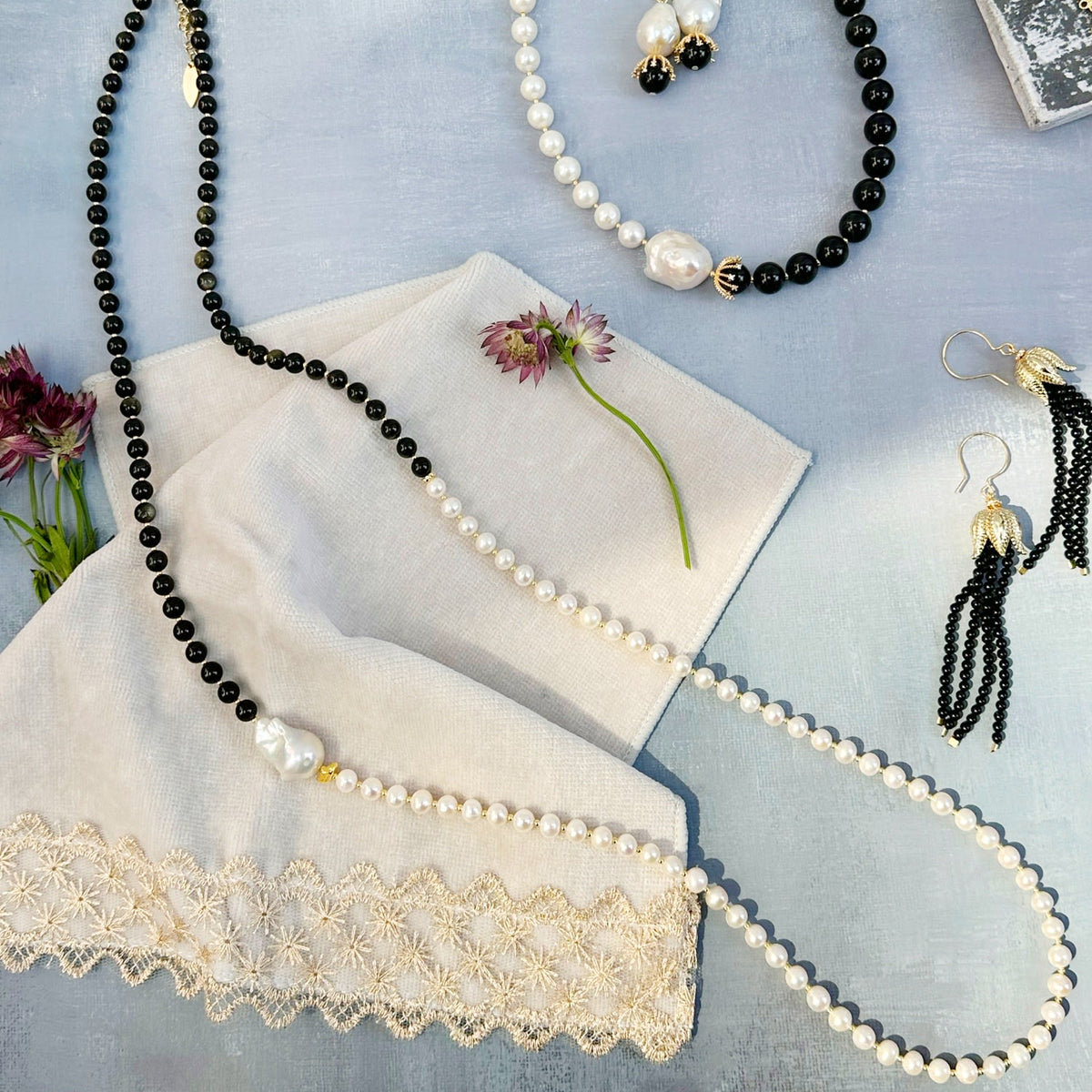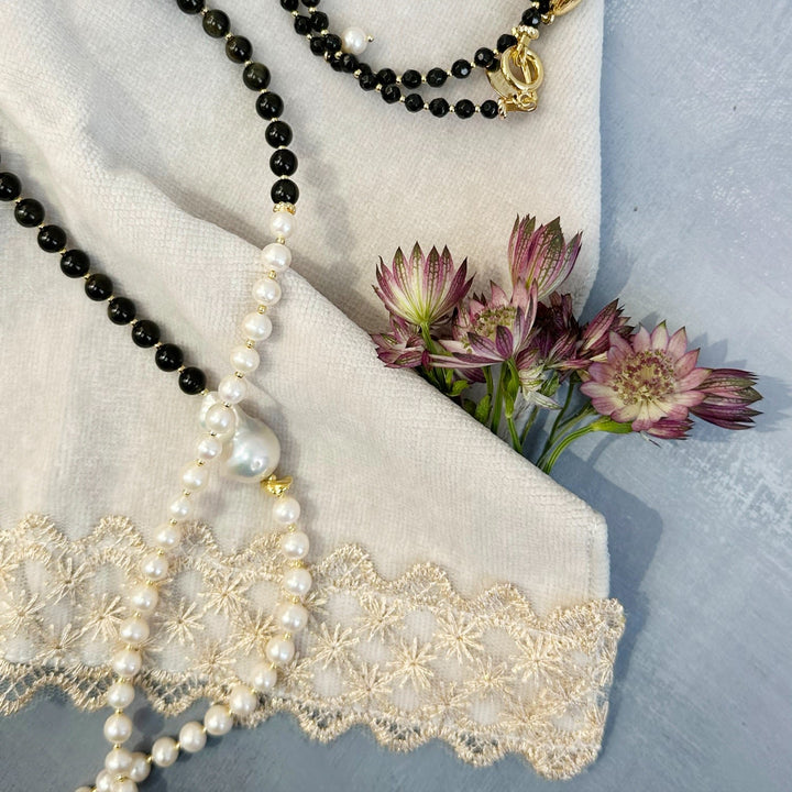 Black Obsidian And White Freshwater Pearls Long Necklace