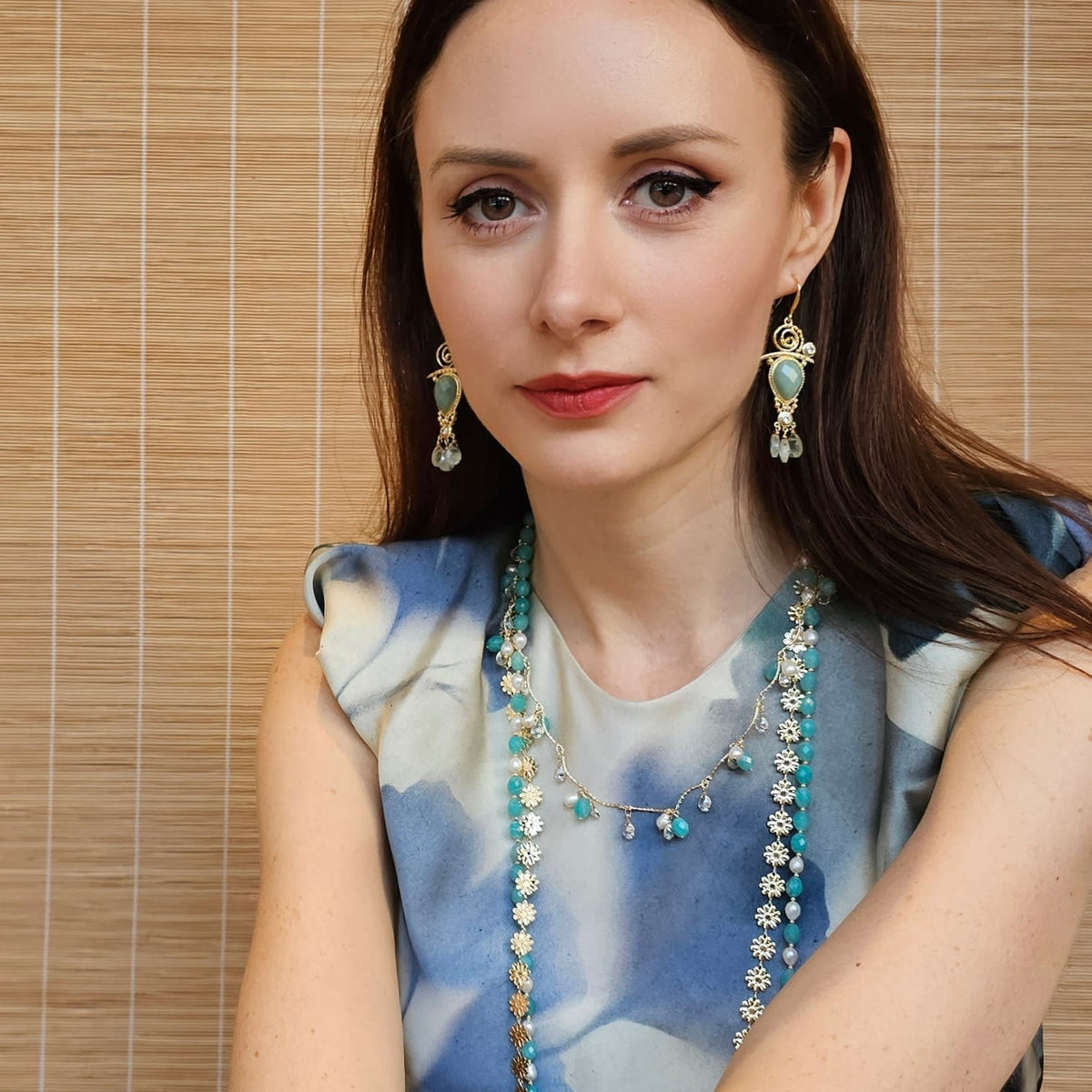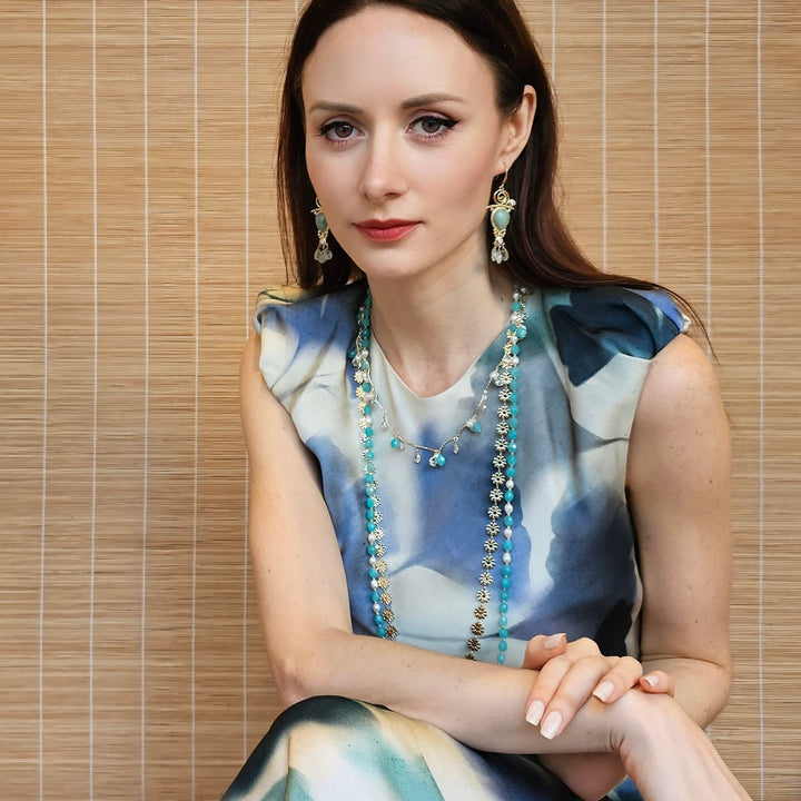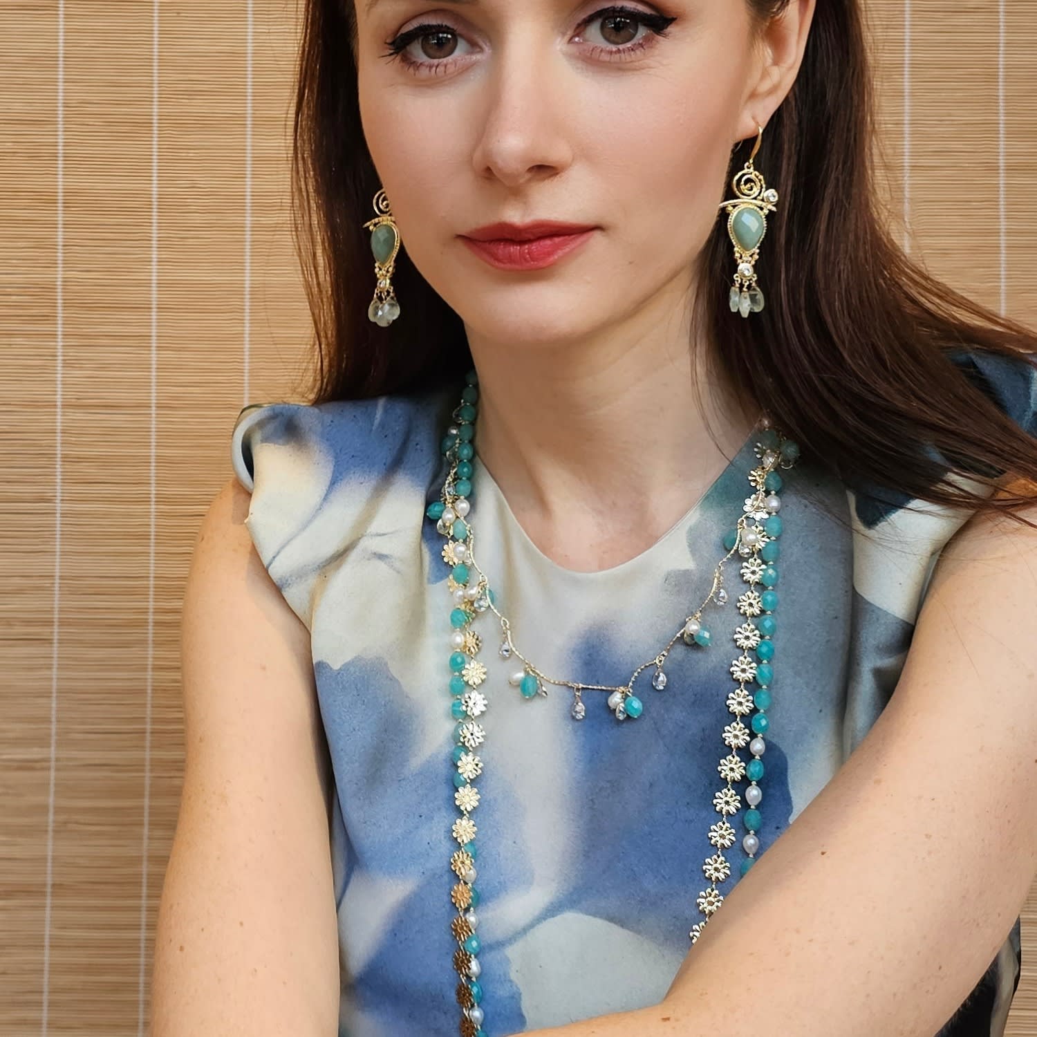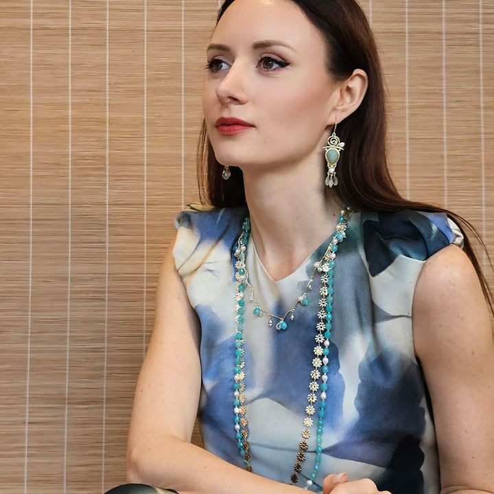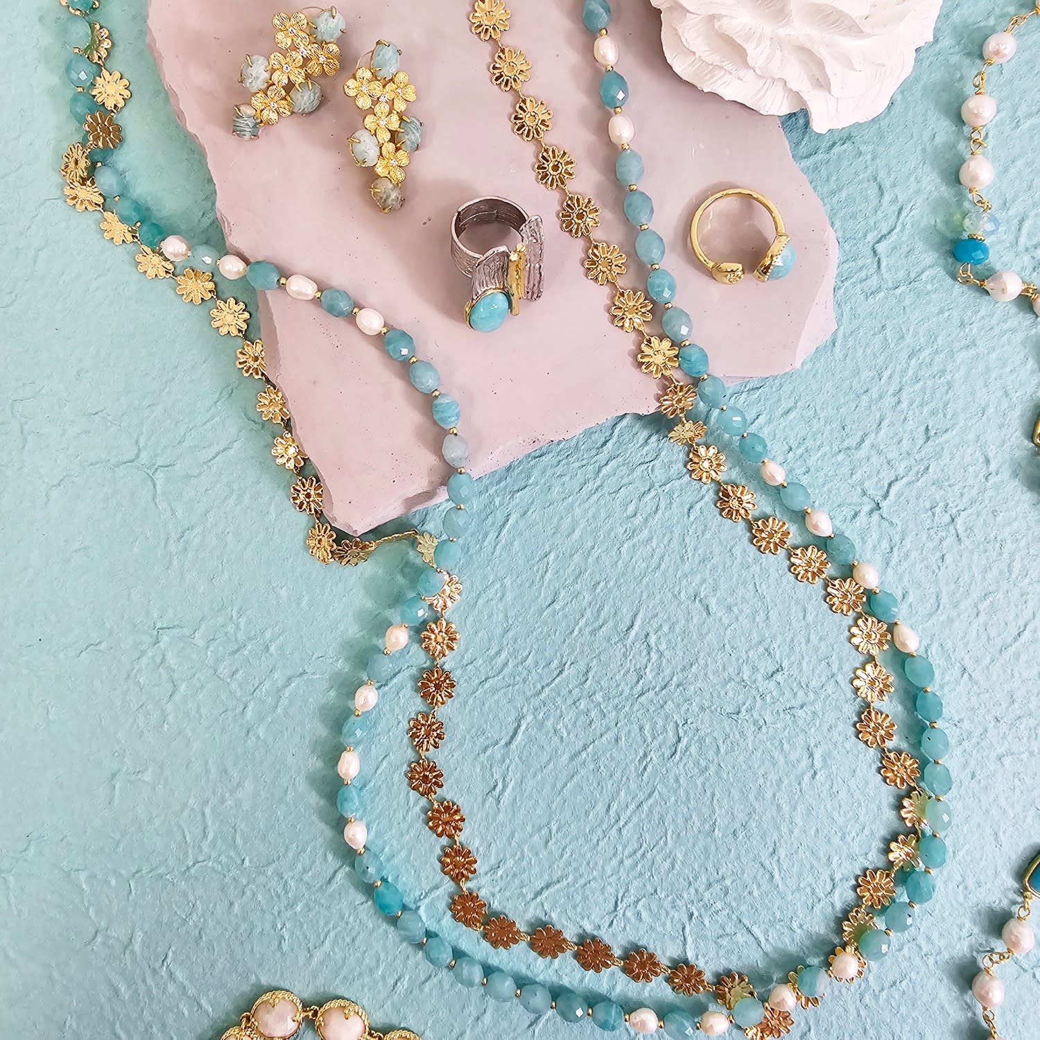 This necklace features amazonite stones and a flower chain, crafted from gold-plated brass in a double-layer design.
