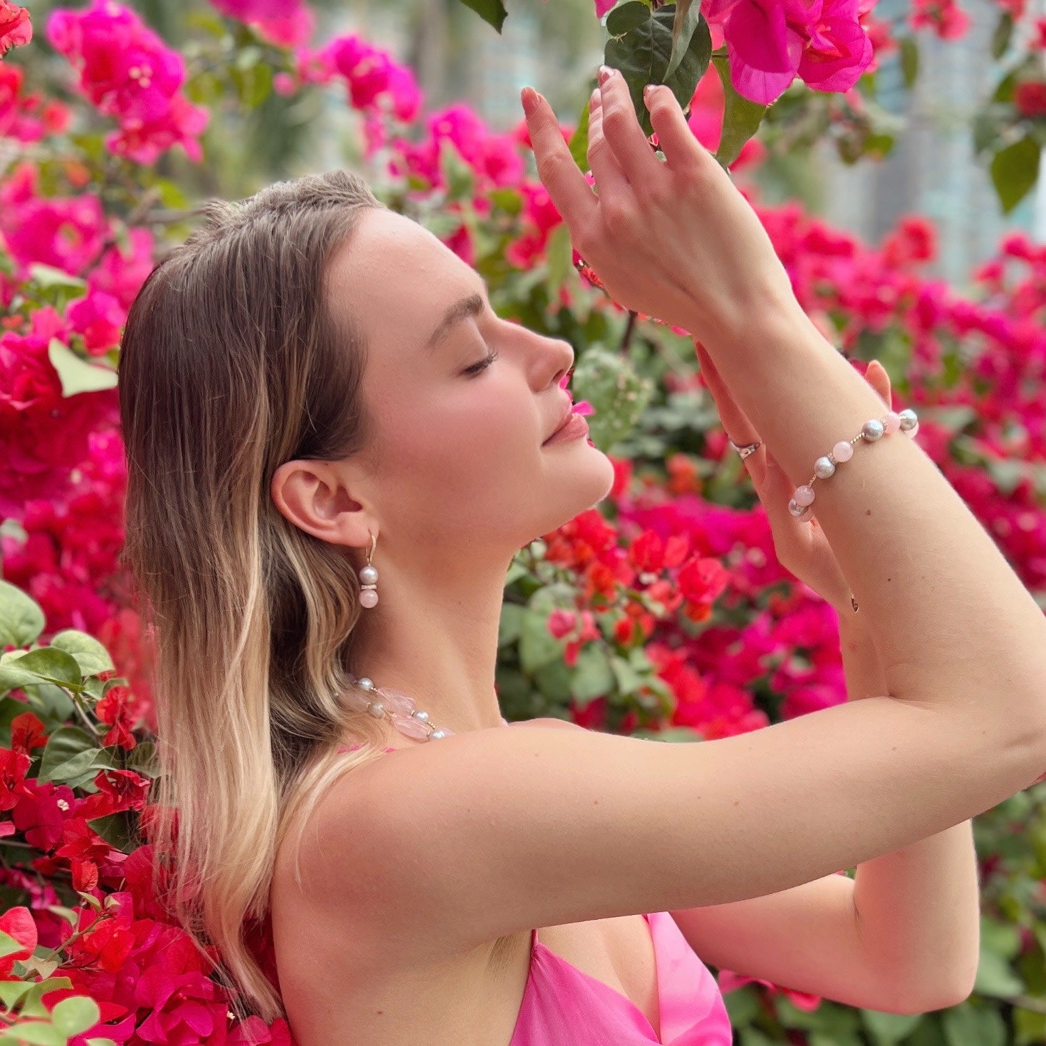 Pink Rose Quartz And Gray Freshwater Pearls Adjustable Bracelet