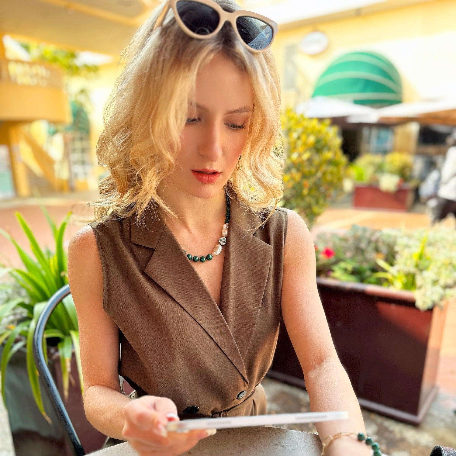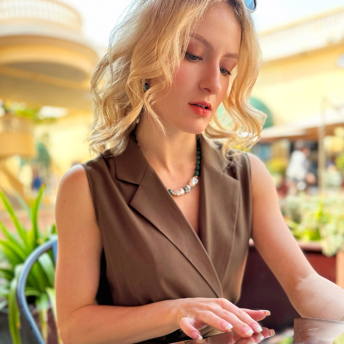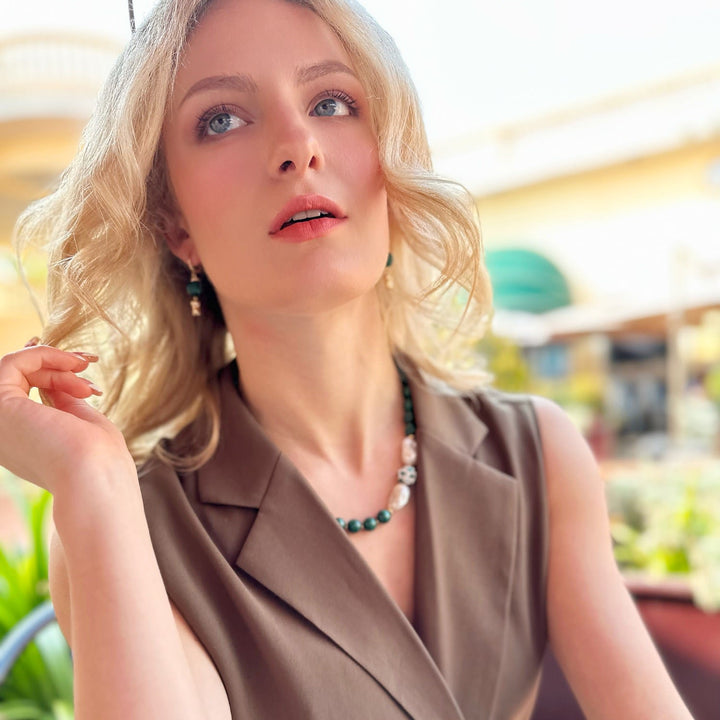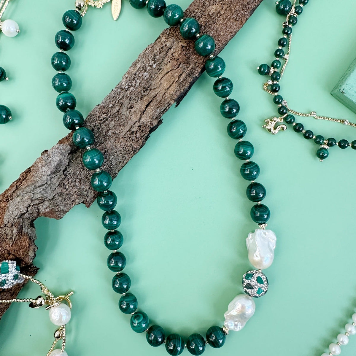 This Gorgeous Malachite With Baroque Pearls Statement Necklace by Farra is a captivating piece that combines vibrant malachite with unique baroque pearls. The natural allure of both stones creates a harmonious and eye-catching composition. This versatile necklace can be styled for evening elegance or a chic daytime look, adding a fascinating element to any outfit.