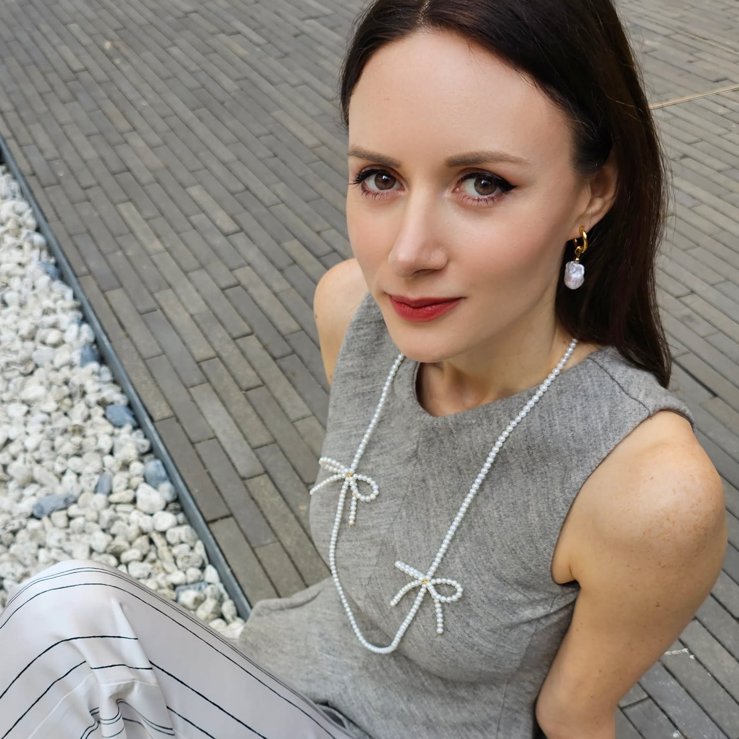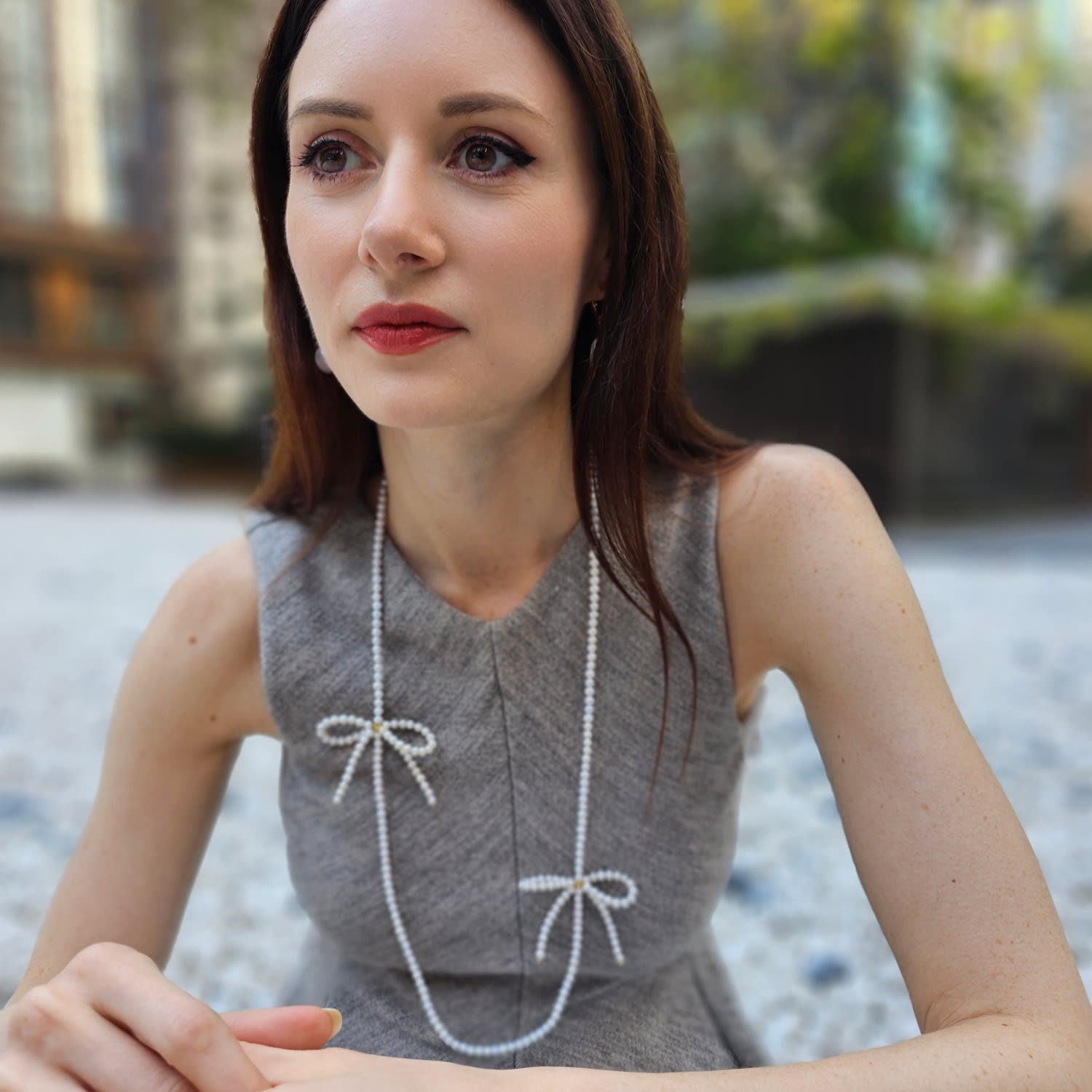 This long pearl necklace is made with freshwater pearls and features a butterfly knot design. The chain's material is not specified.