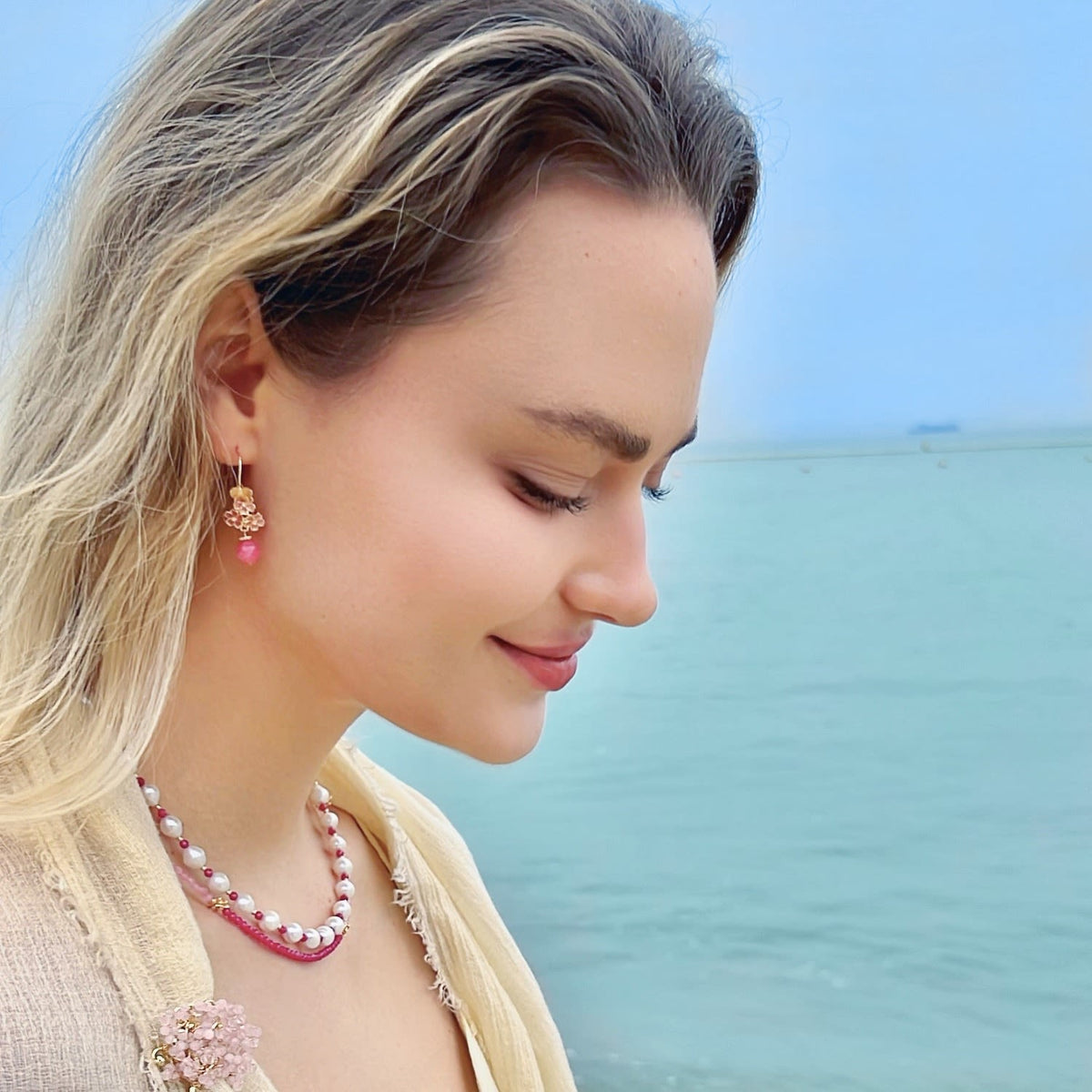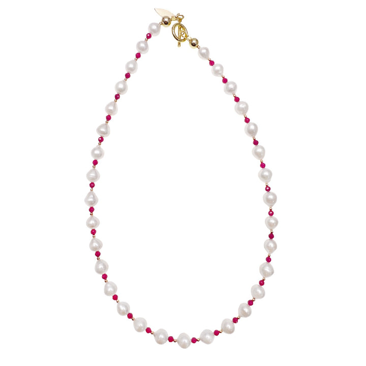 This pearl necklace is made with natural cultured freshwater pearls, natural ruby, and a 14K gold-plated brass chain.