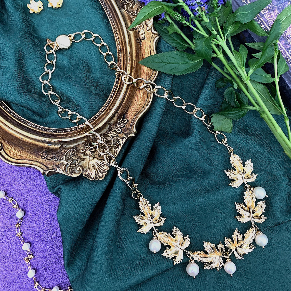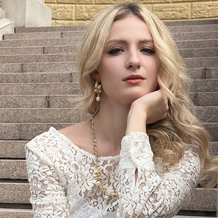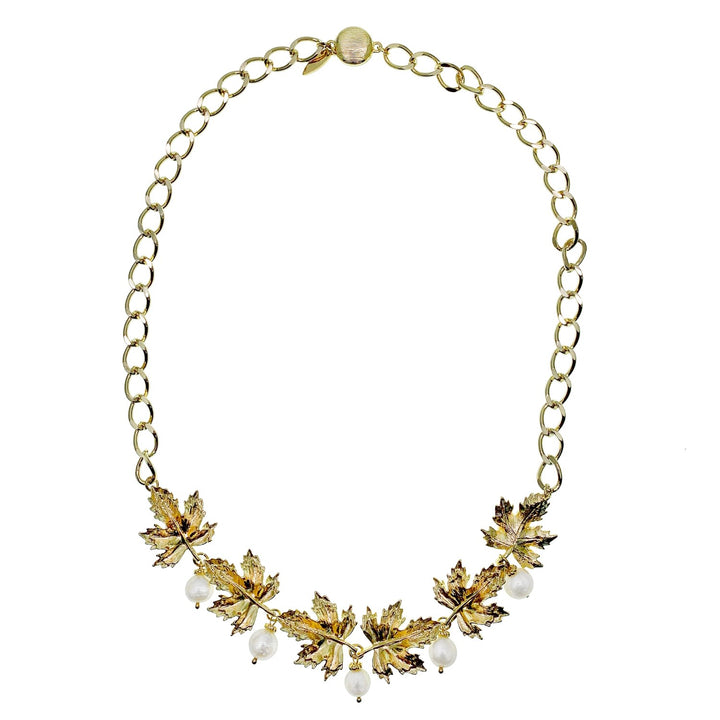 This statement necklace features a 14K gold-plated brass chain with freshwater pearls and maple leaves charms. It has a magnetic closure.