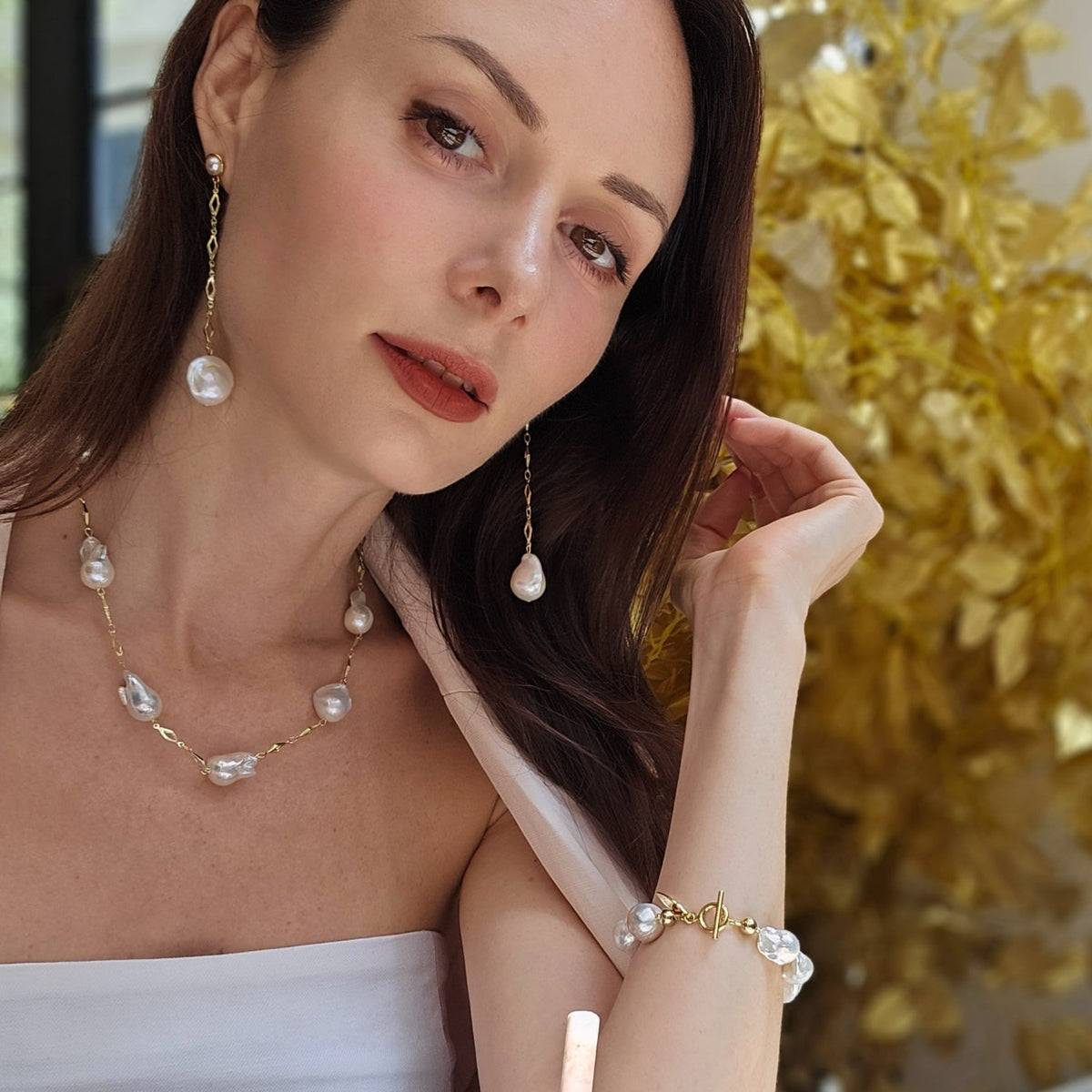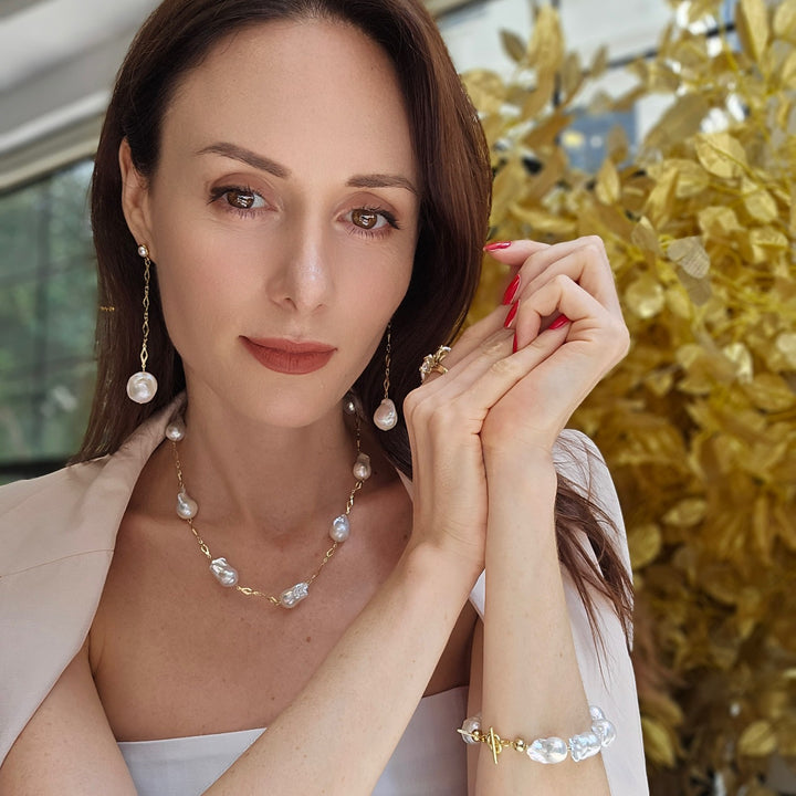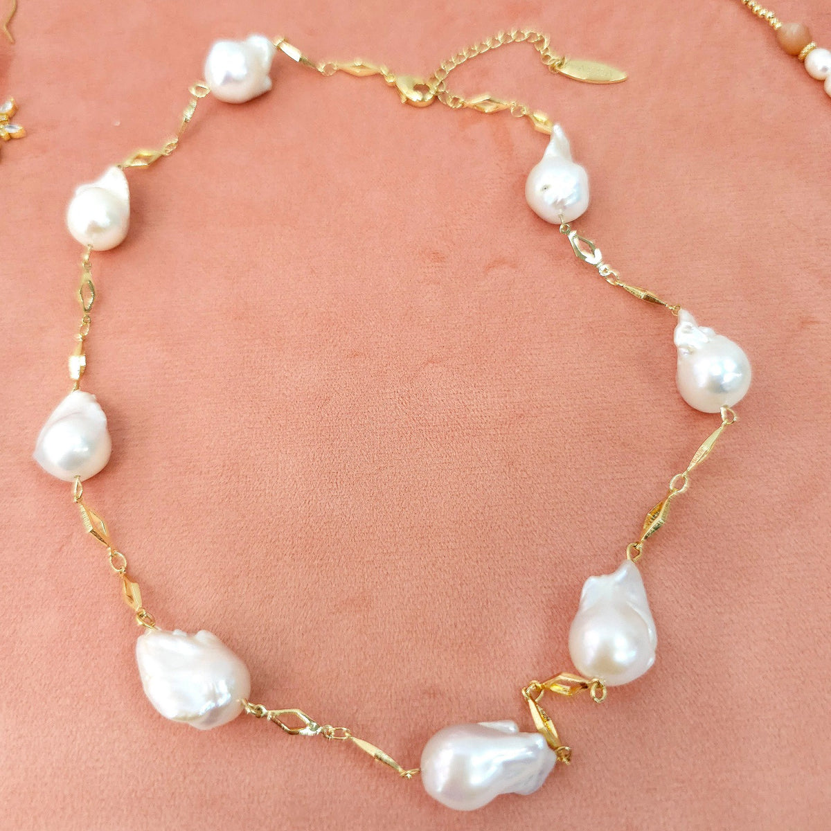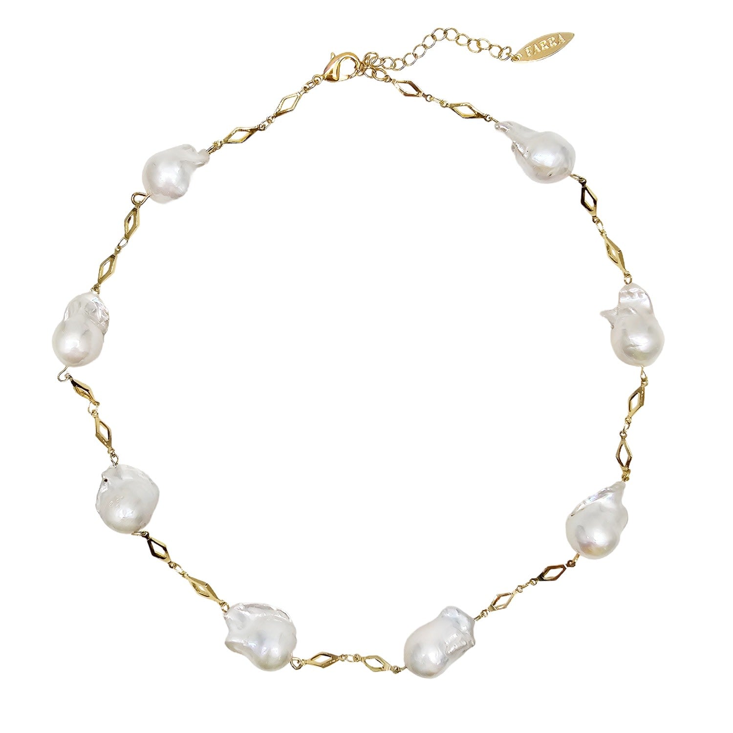 This Timeless Natural Baroque Pearls Necklace by Farra is a refined piece that highlights the unique allure of baroque pearls. Each pearl has its own distinct, irregular shape and luster, adding a sophisticated touch to the necklace. This timeless piece is perfect for elevating both casual and formal outfits.