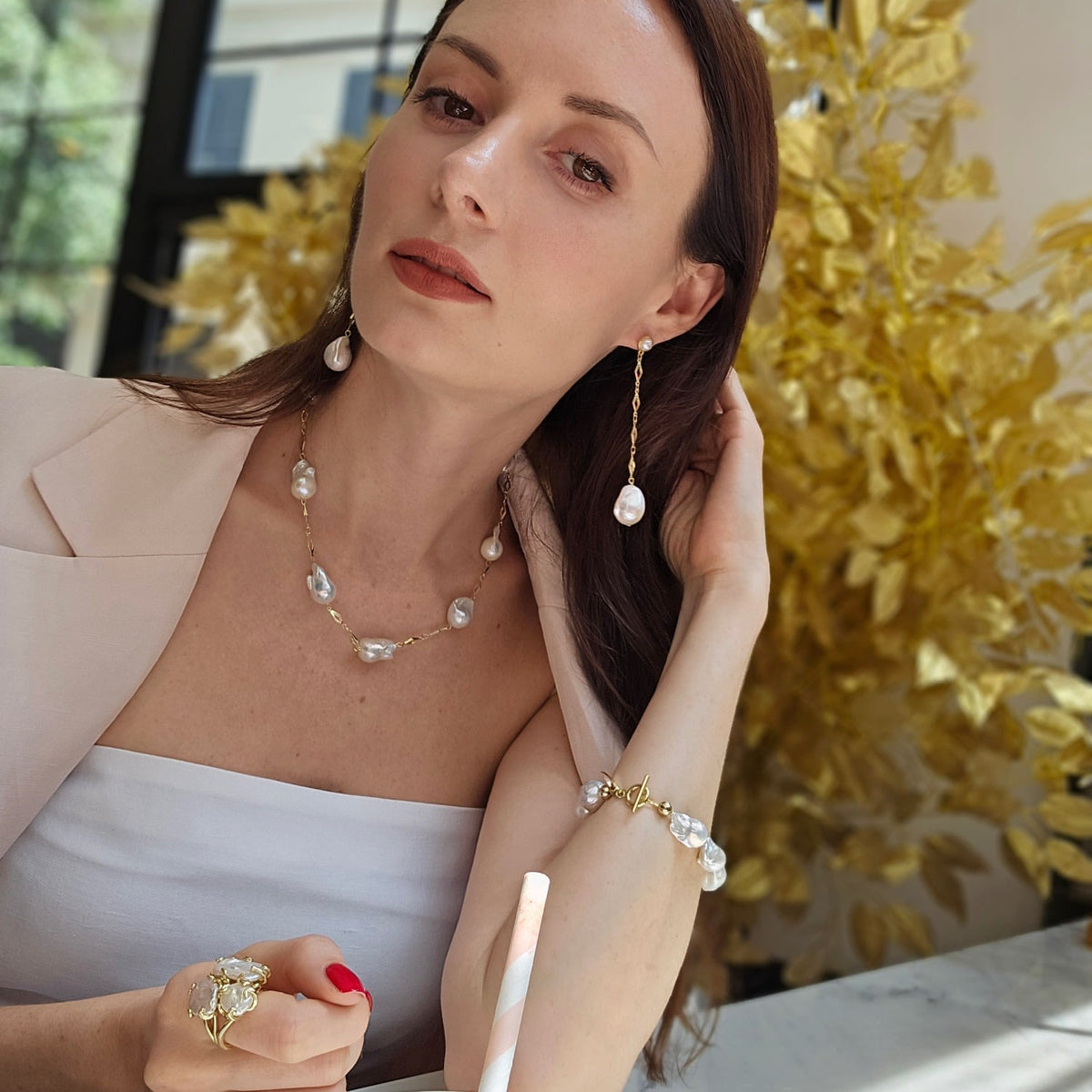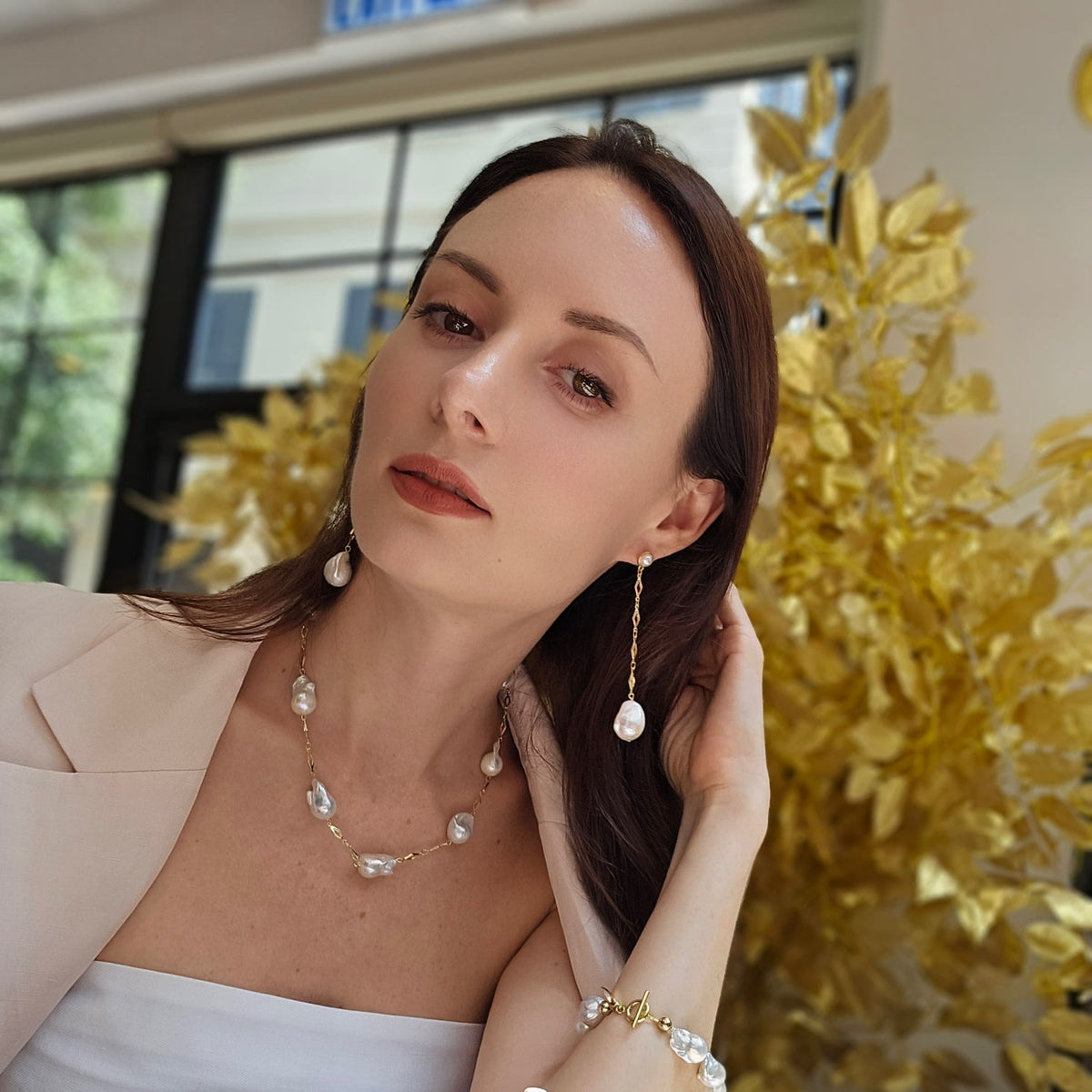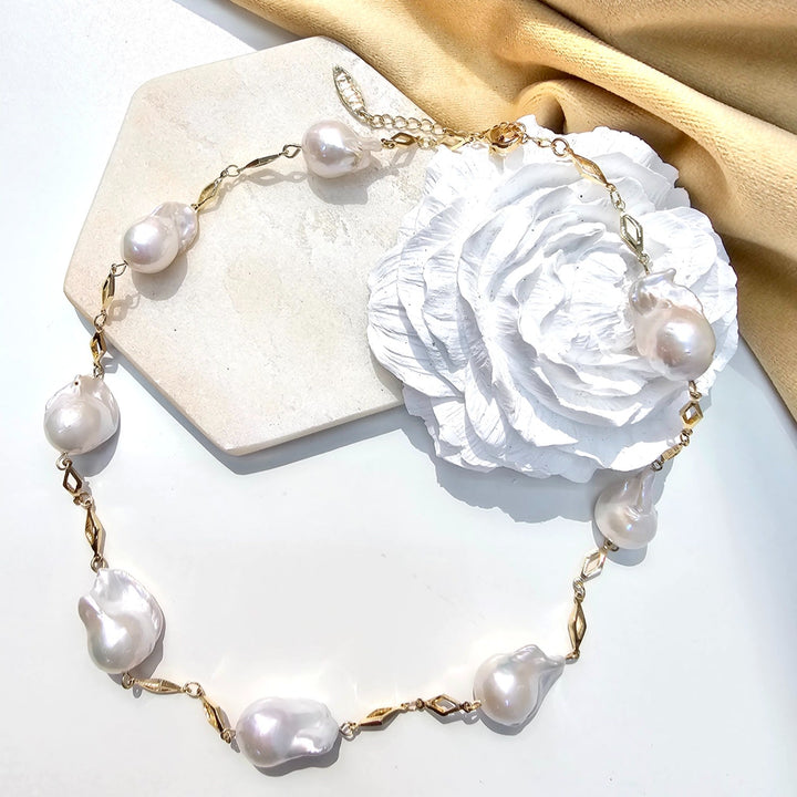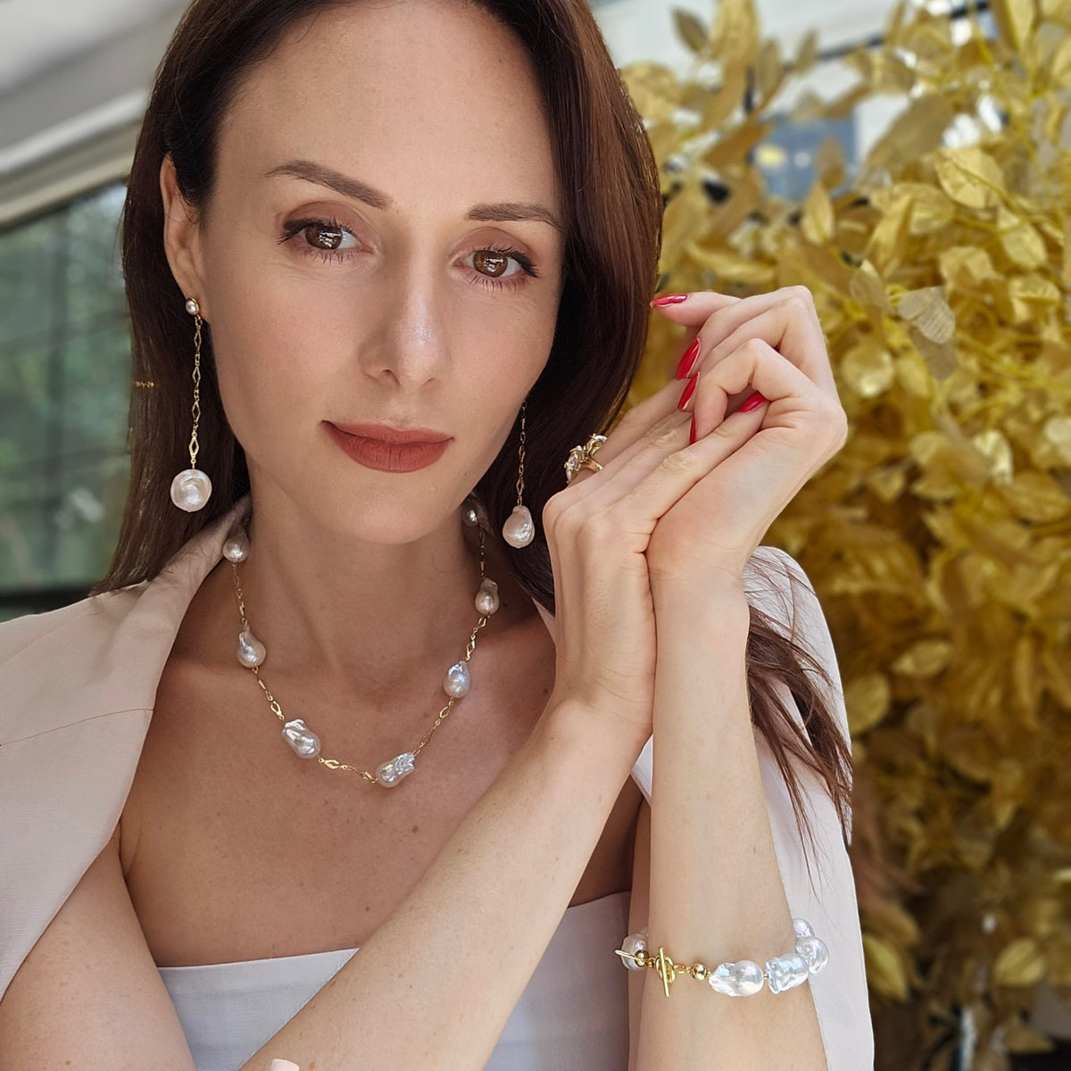 This Timeless Natural Baroque Pearls Necklace by Farra is a refined piece that highlights the unique allure of baroque pearls. Each pearl has its own distinct, irregular shape and luster, adding a sophisticated touch to the necklace. This timeless piece is perfect for elevating both casual and formal outfits.