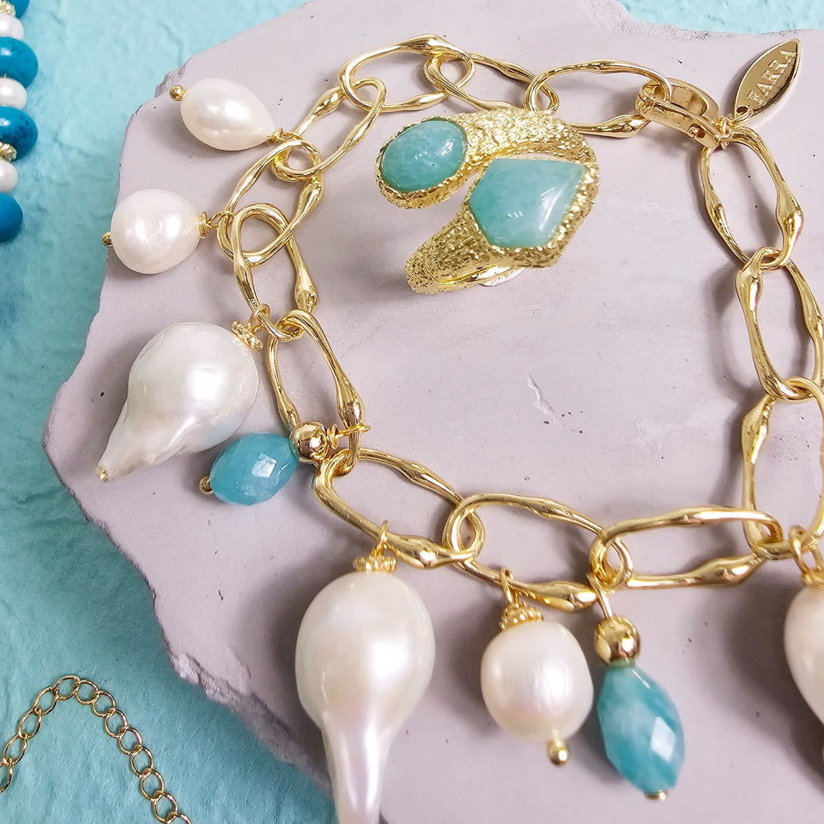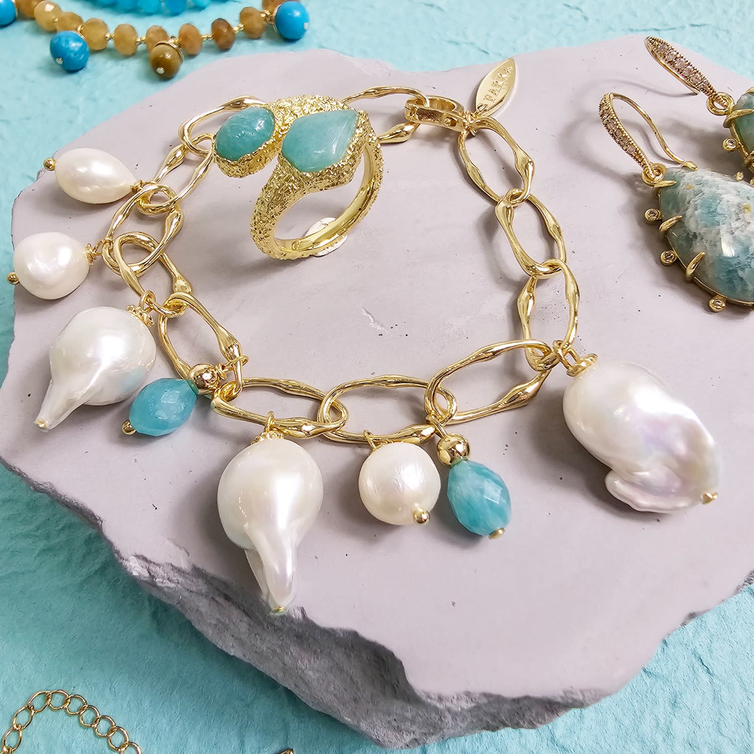 This charm bracelet features baroque pearls, amazonite charms, and a gold-tone chain. It has an adjustable design.
