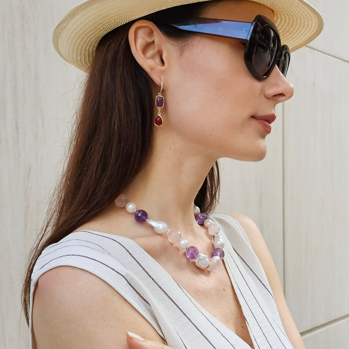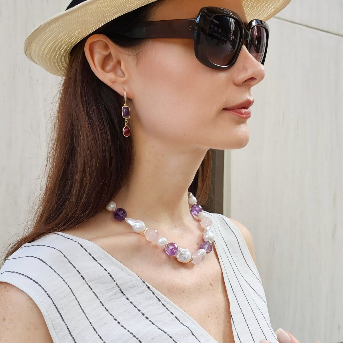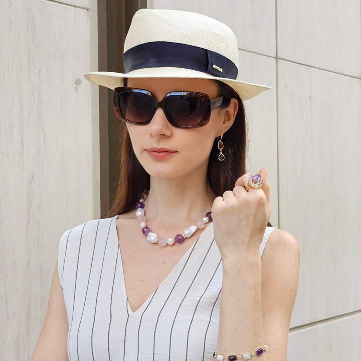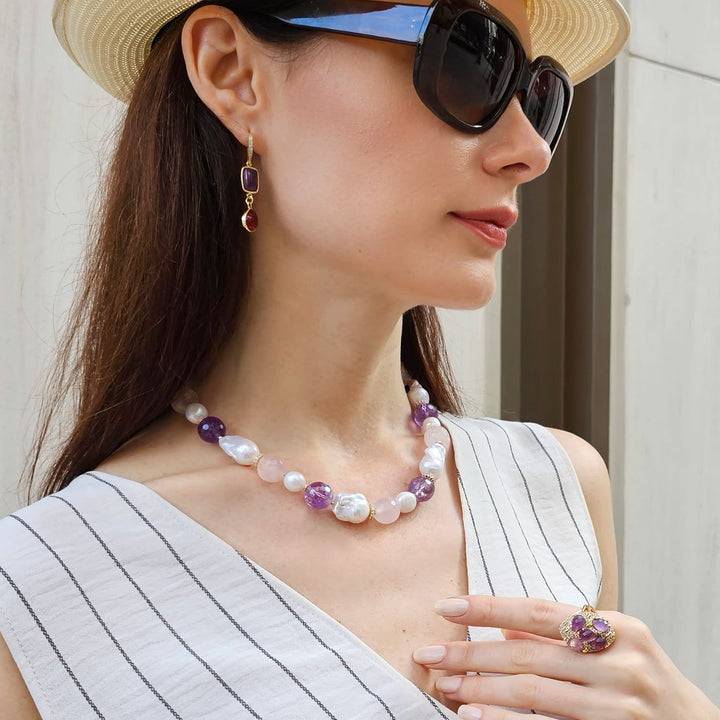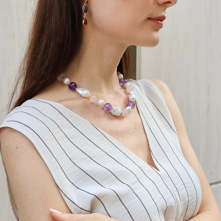 This necklace features baroque pearls, natural nugget rose quartz, and amethyst stones.