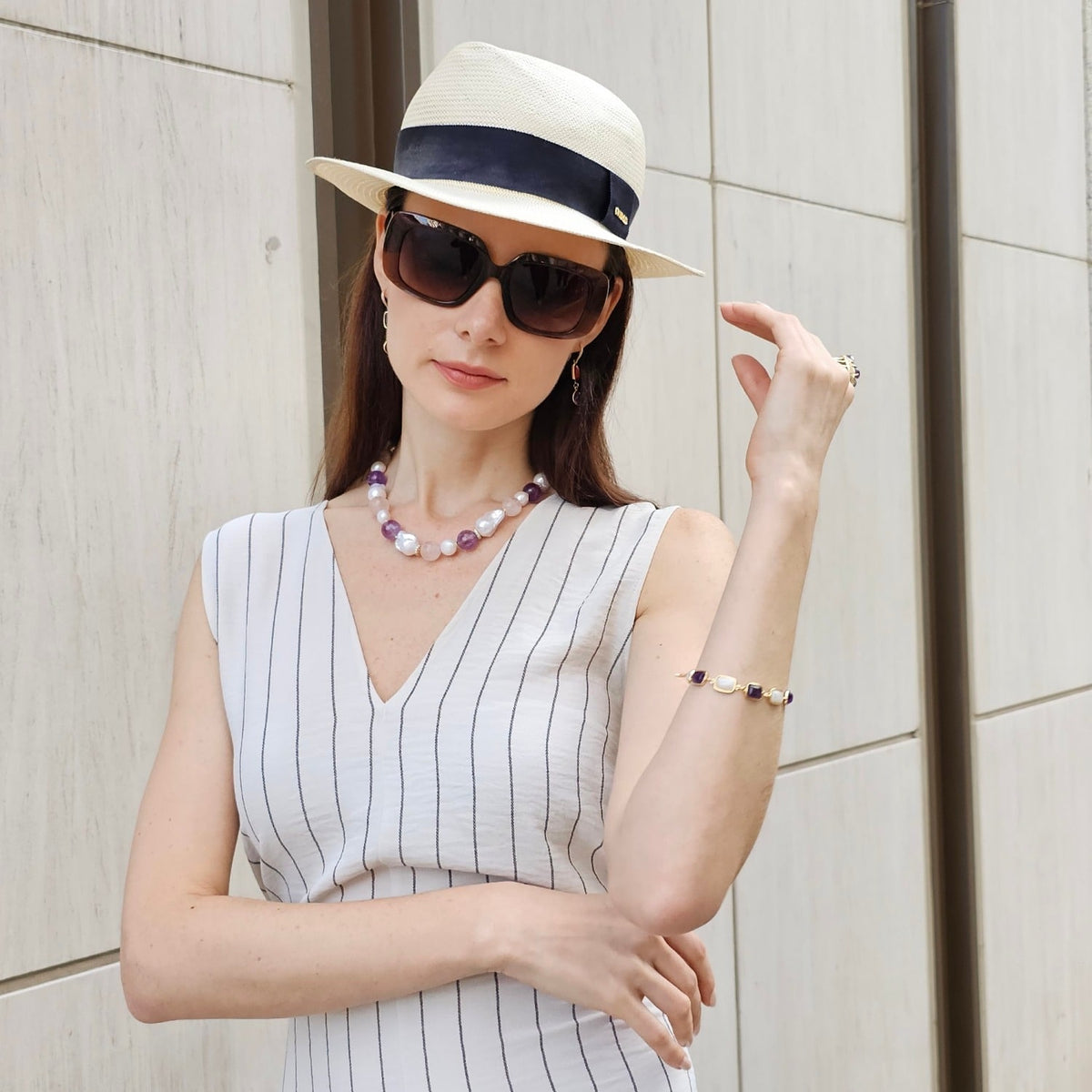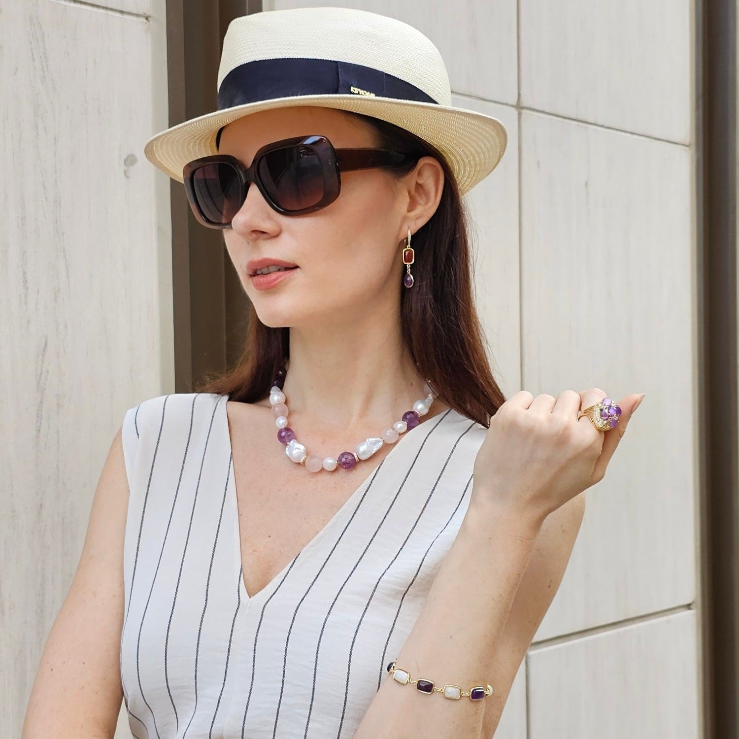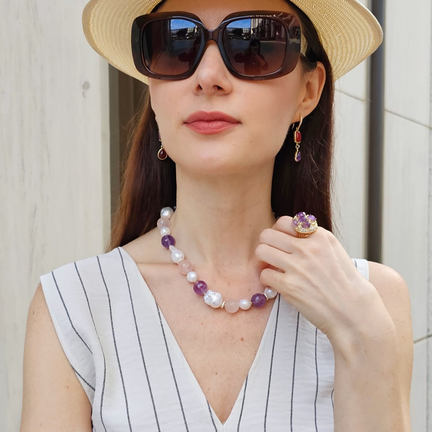 This necklace features baroque pearls, natural nugget rose quartz, and amethyst stones.