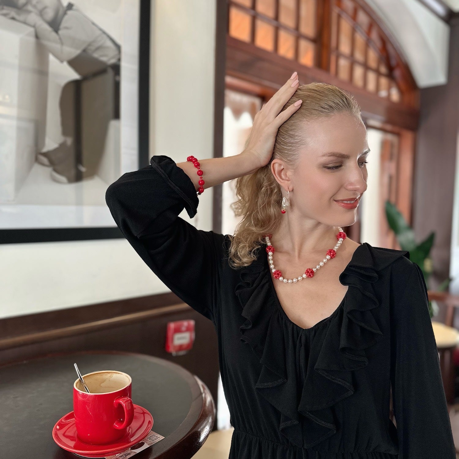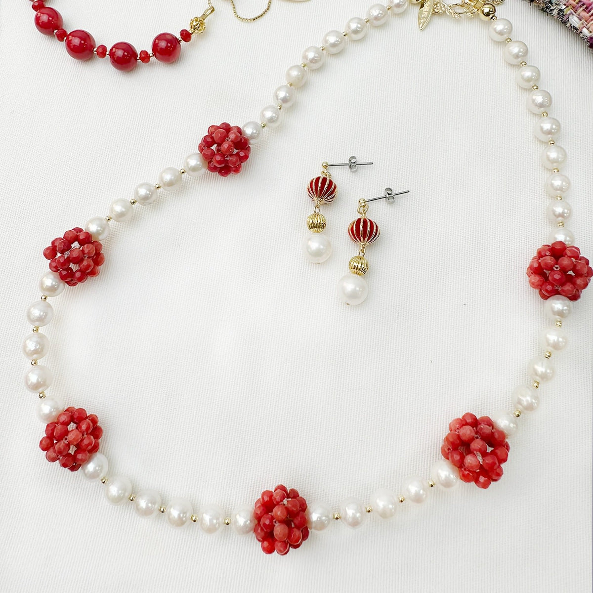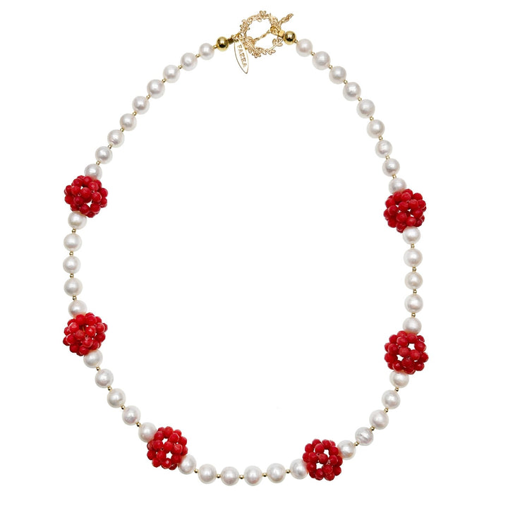 This necklace features a combination of red coral flower balls and lustrous freshwater pearls.