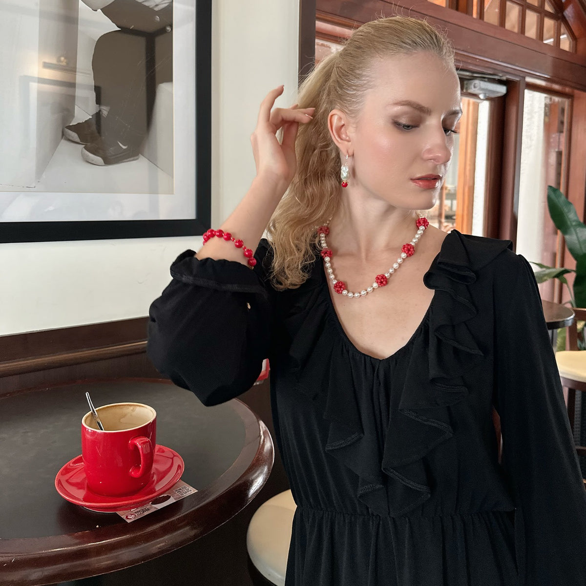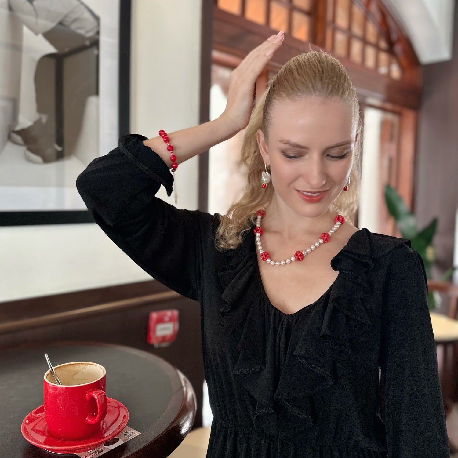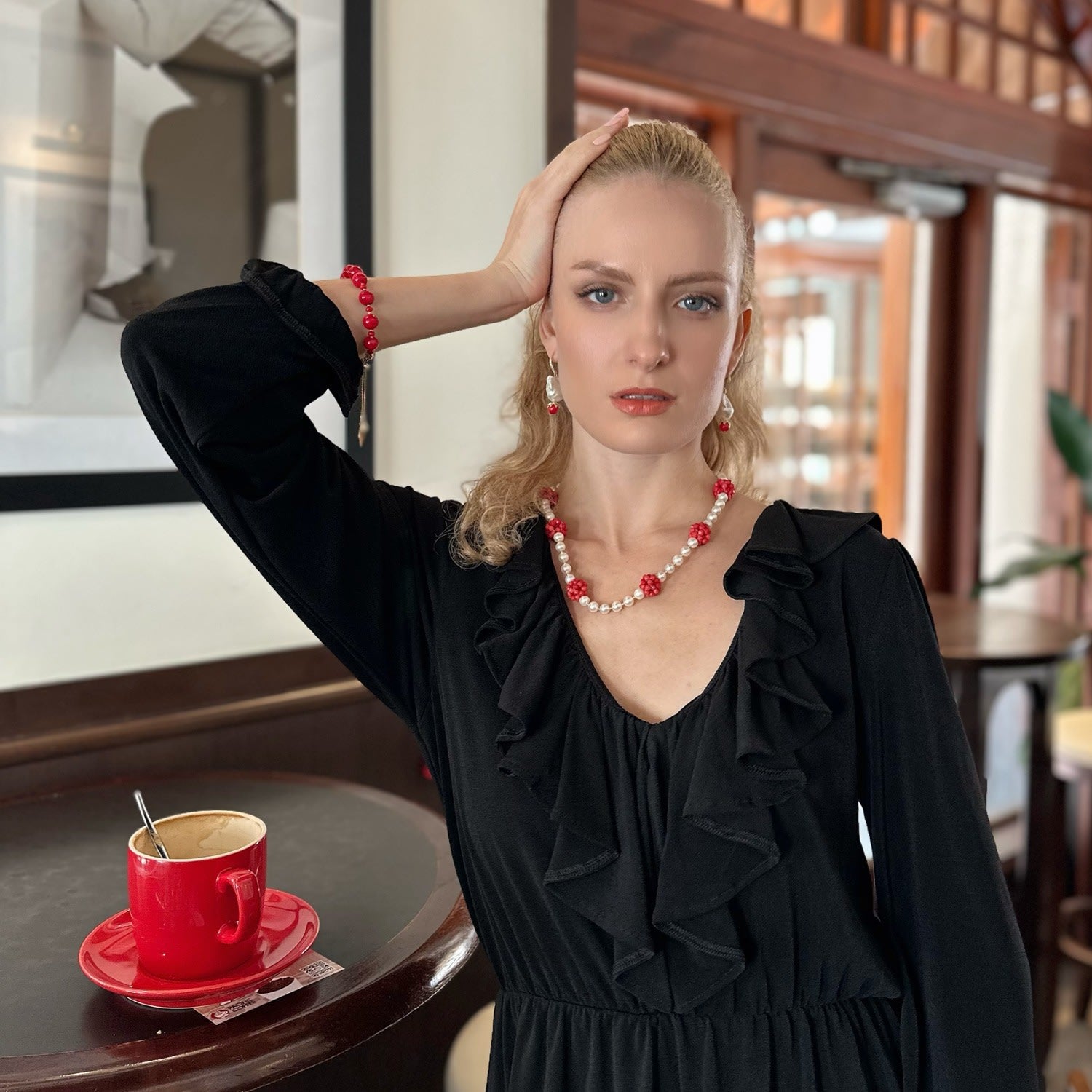This necklace features a combination of red coral flower balls and lustrous freshwater pearls.