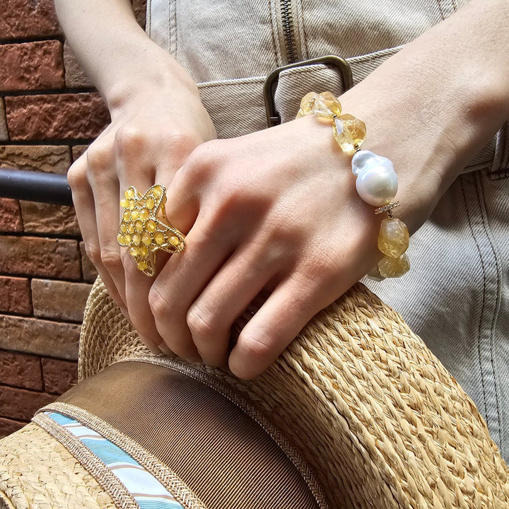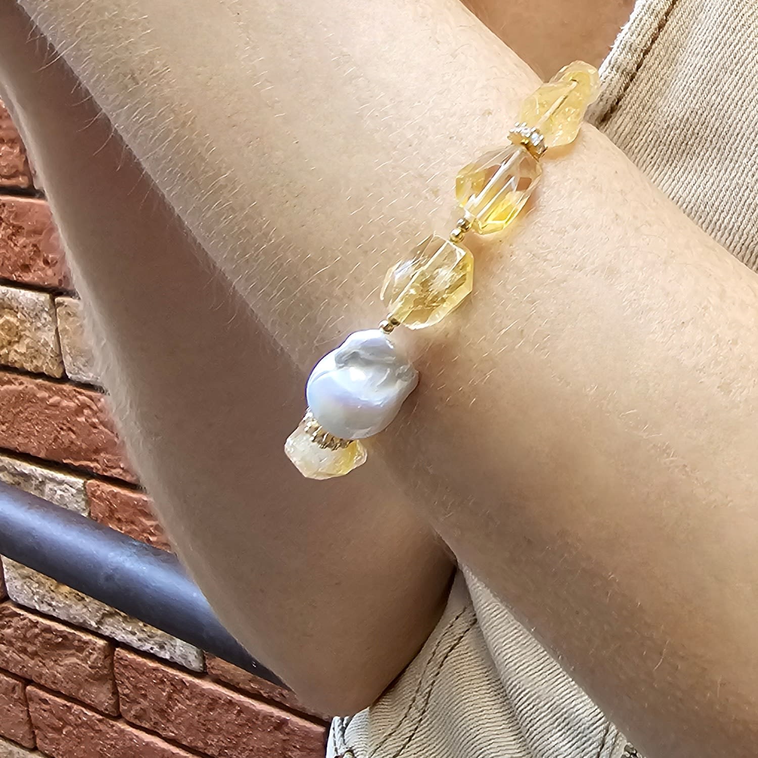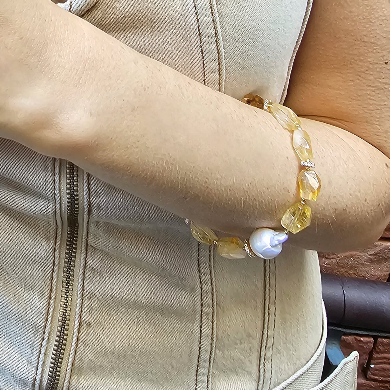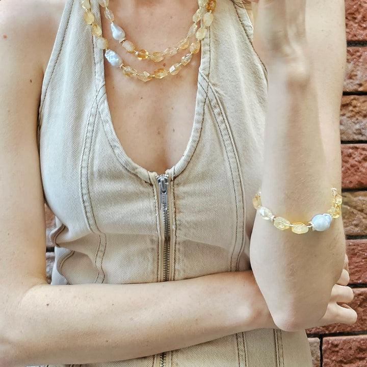 This bracelet features faceted citrine stones and a baroque pearl. It is an adjustable bracelet with sparkling accents.